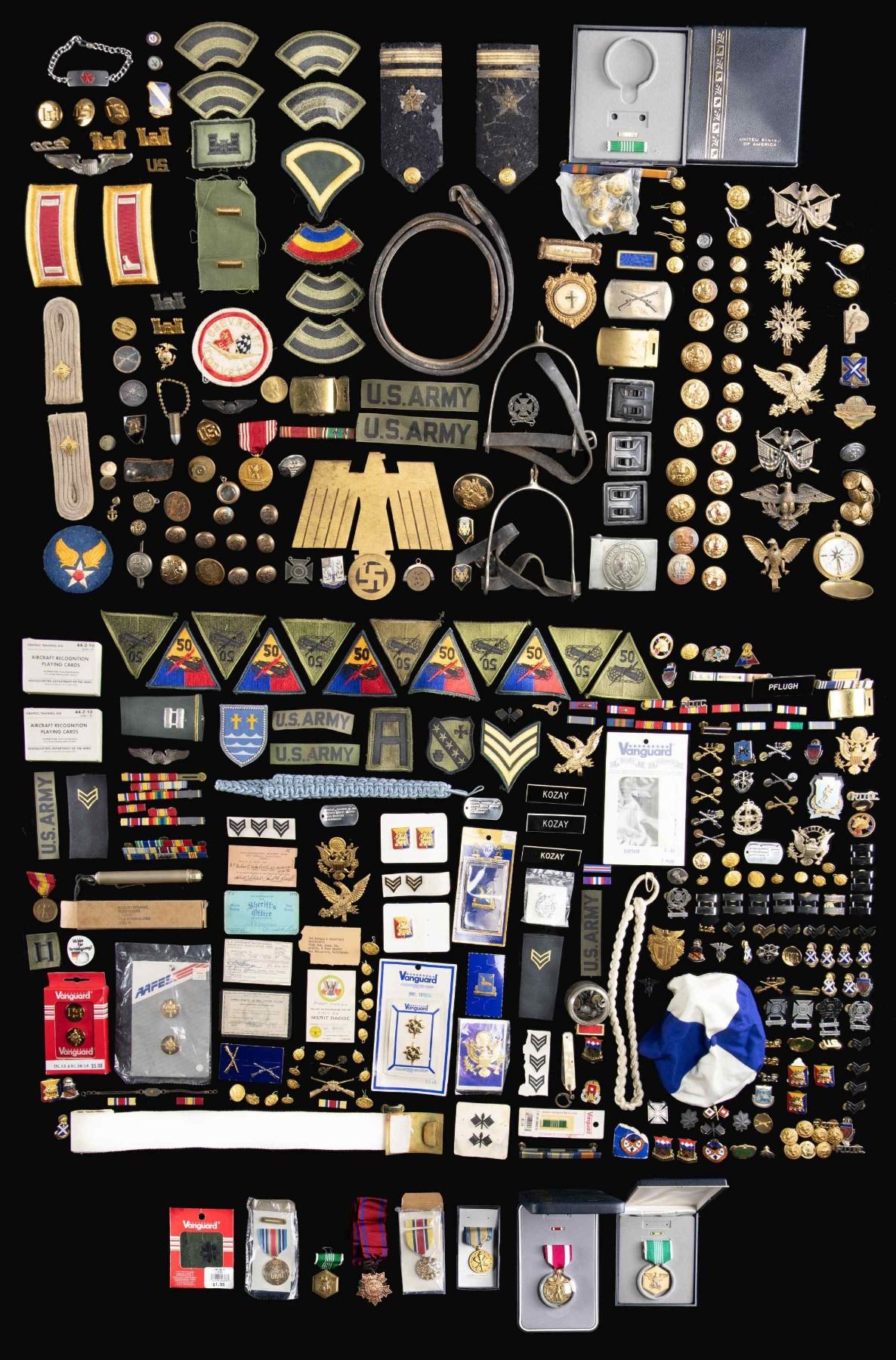 Large lot of assorted pins, badges, medal, etc. Some items are housed within their original boxes. Medals are not named. CONDITION: items appear good, showing scattered handling marks and varying degrees of wear. (02-24526-4/MLW). NON-GUN. $100-200.