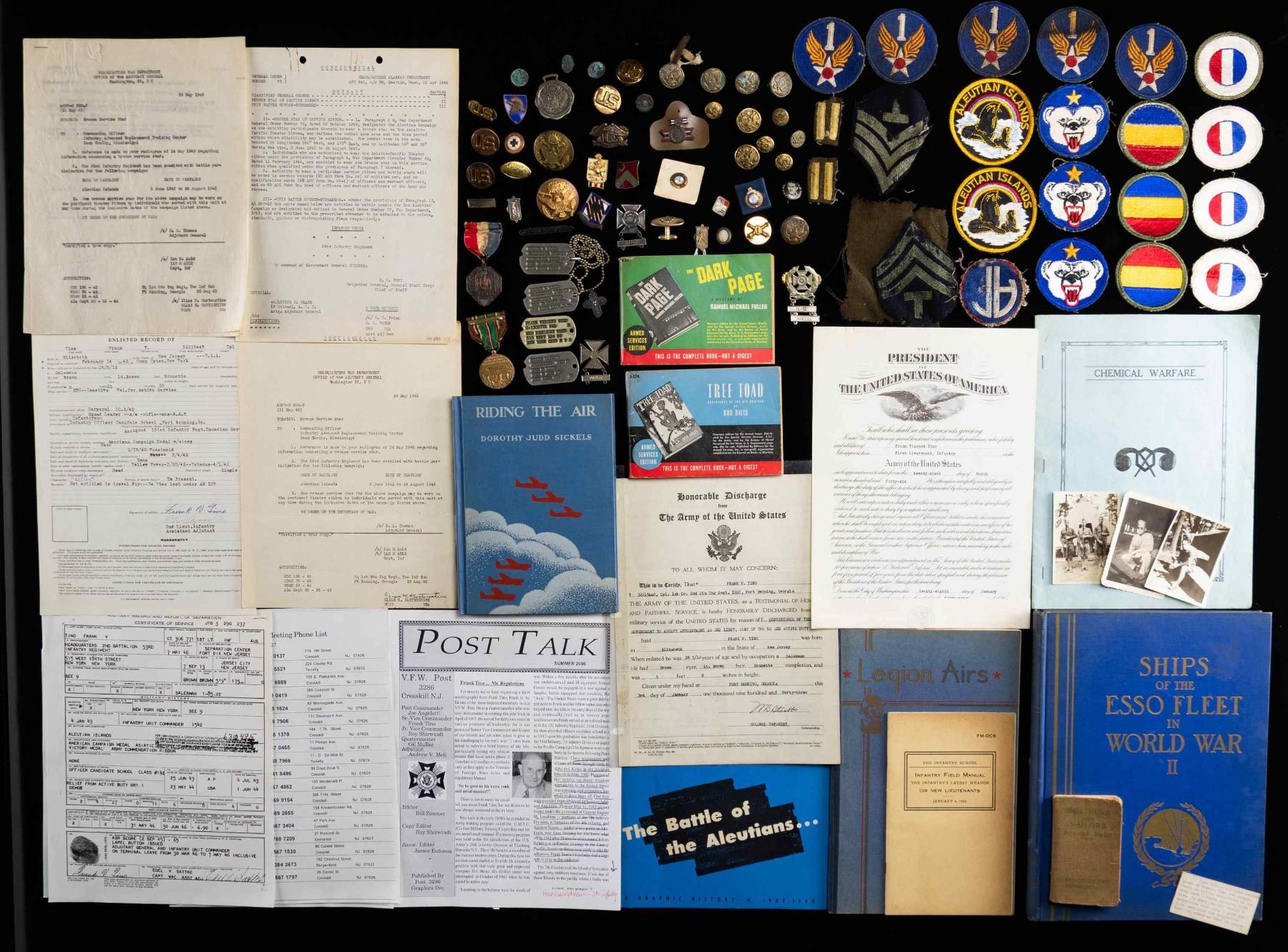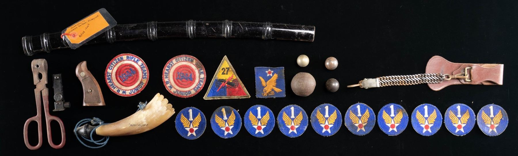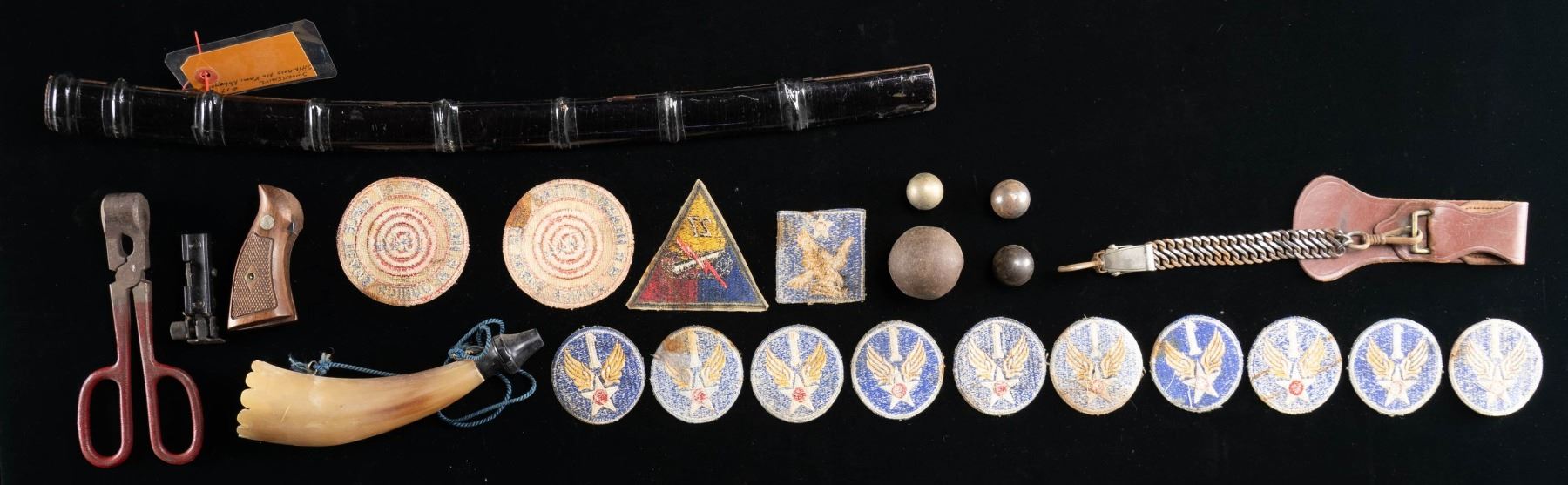 This lot consists of several item including the following: 1) A powder horn that appears newer. 2) A set of S&W diamond center walnut K-frame grips with screw. 3) A bullet mould similar to a set of scissors. 4) A 23 1/2" section of Japanese sword scabbard with open ends at both sides. Consignor states this scabbard came from Shinano Nokami Noboyshi in the 1700's. 5) Several US military patches that appear to be WW2 era including many 1st Air Force & one 27th Armored Division. 6) A box full of varied US Army & Air Corps documents dating from the late 1930's until 1960's. 7) A box containing several older documents including a : 1958 Metrology or Naval Aviators book, a 1923 ad for Plattsburg Military Training Camp, A book on Esso Fleet Ships in WW2, Two WW2 Armed Services Novels, a few other books printed materials such as a 1943 US Infantry Lt. Book & set of dog tags both belonging to Frank Vincent TIno of NYC. CONDITION: paper items show varied degrees of age wear. Other items vary in wear. (02-24526-18/MJC). NON-GUN. $300-500 for lot.