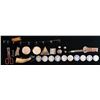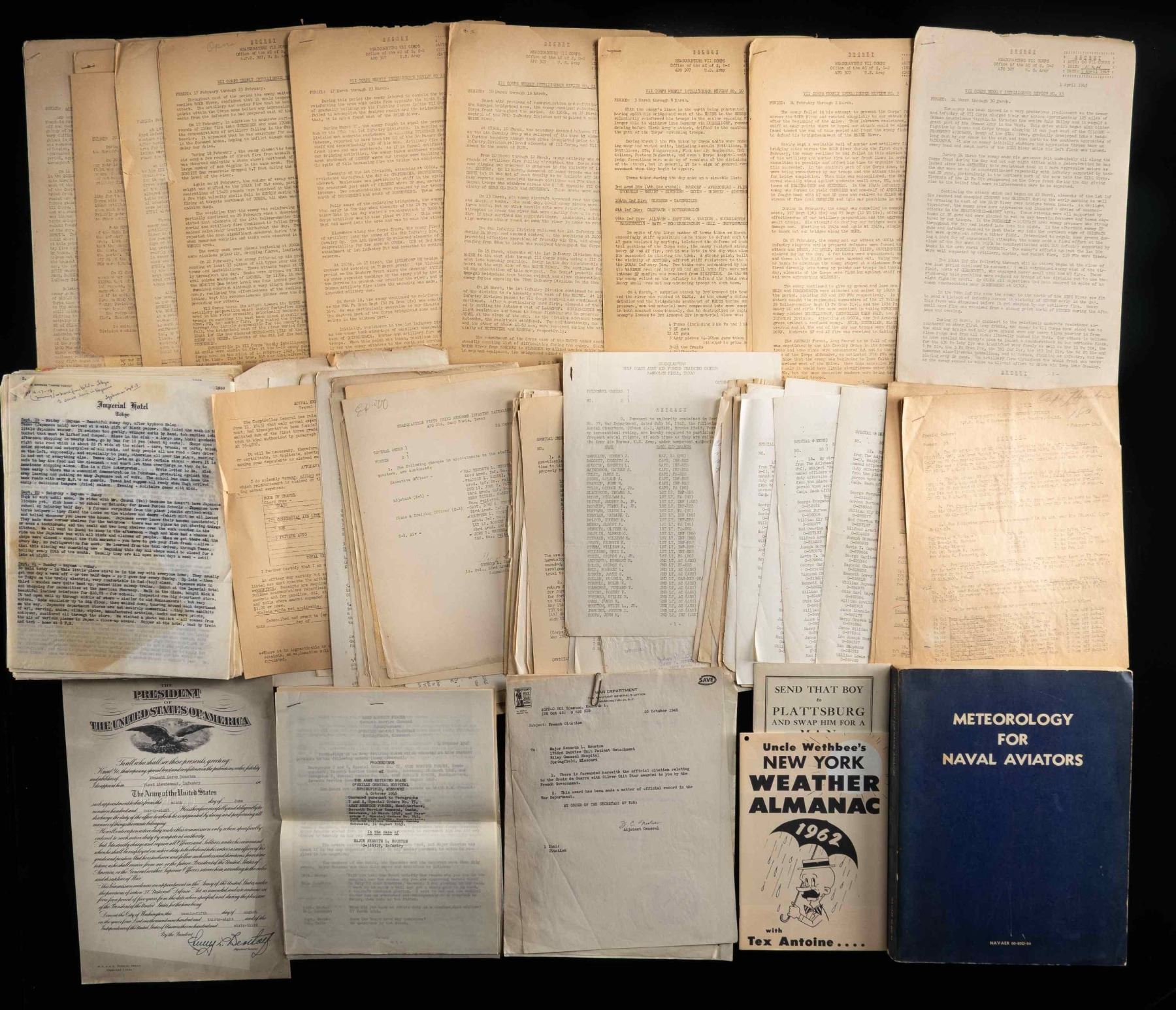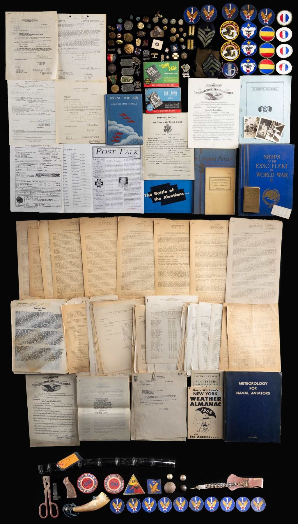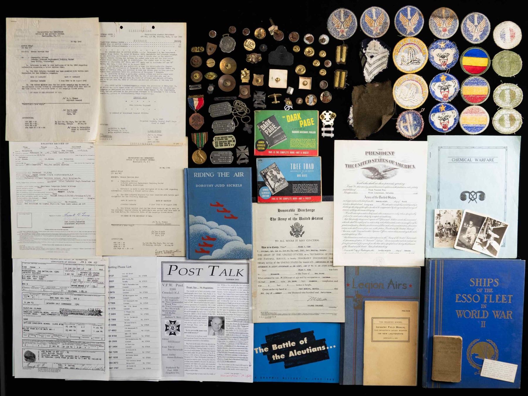 This lot consists of several item including the following: 1) A powder horn that appears newer. 2) A set of S&W diamond center walnut K-frame grips with screw. 3) A bullet mould similar to a set of scissors. 4) A 23 1/2" section of Japanese sword scabbard with open ends at both sides. Consignor states this scabbard came from Shinano Nokami Noboyshi in the 1700's. 5) Several US military patches that appear to be WW2 era including many 1st Air Force & one 27th Armored Division. 6) A box full of varied US Army & Air Corps documents dating from the late 1930's until 1960's. 7) A box containing several older documents including a : 1958 Metrology or Naval Aviators book, a 1923 ad for Plattsburg Military Training Camp, A book on Esso Fleet Ships in WW2, Two WW2 Armed Services Novels, a few other books printed materials such as a 1943 US Infantry Lt. Book & set of dog tags both belonging to Frank Vincent TIno of NYC. CONDITION: paper items show varied degrees of age wear. Other items vary in wear. (02-24526-18/MJC). NON-GUN. $300-500 for lot.