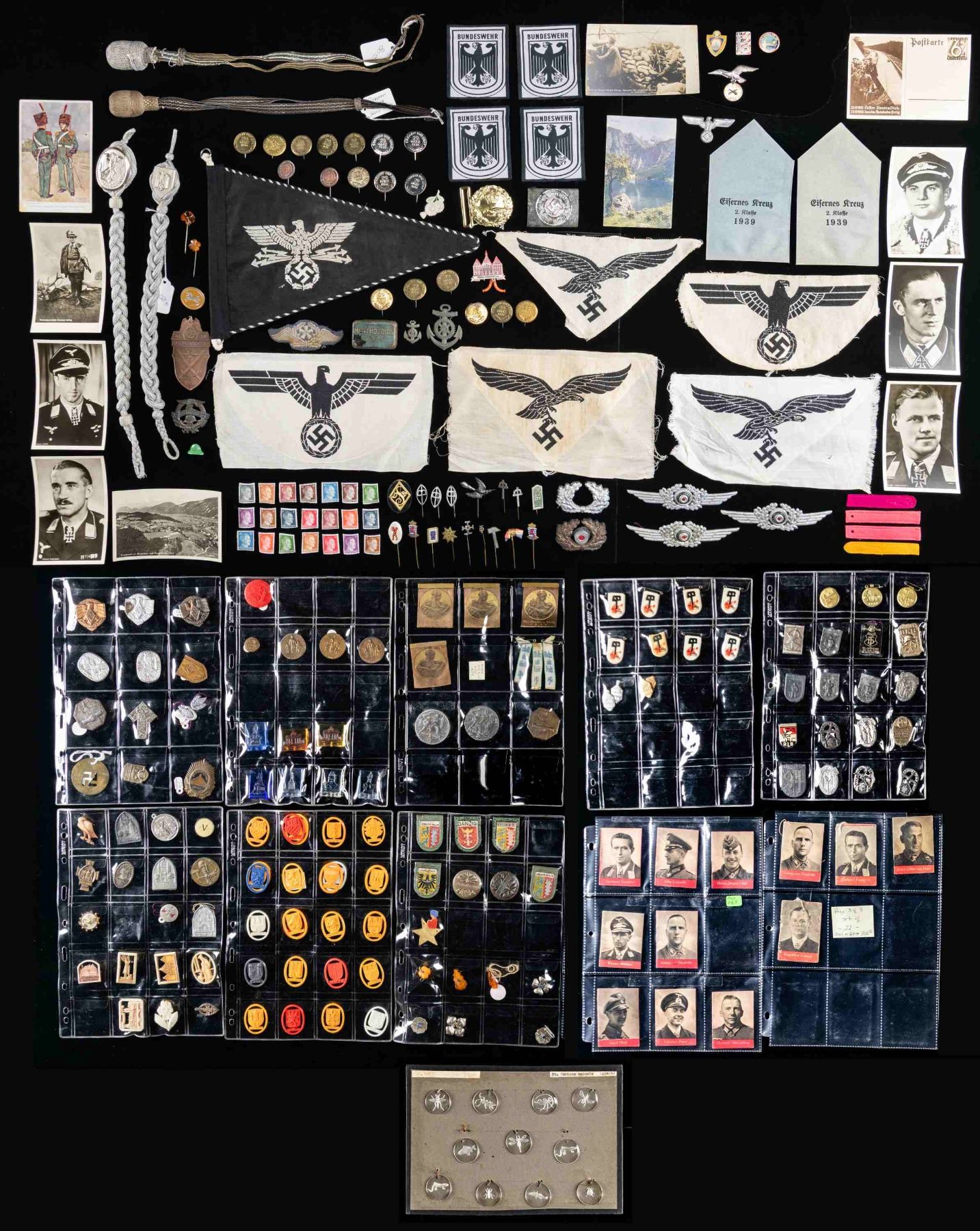 MINI BOOKS AND MORE. This extensive lot includes a loose leaf binder containing approximately 119 tinnies, pins, WHW items, and related items. The binder further includes approximately 33 "Tag der Wehrmacht" Knights Cross winner cards, approximately 53 "Des Fuhrers / Der Fuhrer" mini-books, and 7 "Das Deutsche Lied" mini-books. Along with the binder are 1 Wehrmacht shooter's lanyard, 1 West German shooter's lanyard, 4 Luftwaffe sportshirt eagles, 2 Wehrmacht sportshirt eagle, 1 Postschutz car pennant likely of post WWII manufacture, 2 WWII Iron Cross 2nd Class issue envelopes, 13 large photos from the 1950s showing US troops on winter maneuvers, 2 WWII German press photos, 15 US Army large photos of P-39 aircraft and related scenes, 3 Various large photos, 11 WWII German post cards, well over 100 WWII German Hitler head stamps, 2 Sword knots, 4 West German patches, 1 WWII German 1944 sports book, 3 Luftwaffe cap wreaths, 2 Wehrmacht cap wreaths. 1 Corroded Police belt buckle, 1 Police cap eagle, 1 RAF belt buckle, 1 Demjansk sleeve shield of questionable age, 14 Miscellaneous small items, 1 Luftwaffe specialty patch, 11 WHW style glass disks engraved with insects, 38 Small WWII era German tinnies and pins, and 2 Kriegsmarine machinist mate badges. CONDITION: as expected, items vary greatly in condition, but most show light wear. (02-25736/BF). NON-GUN. $800-1,200.