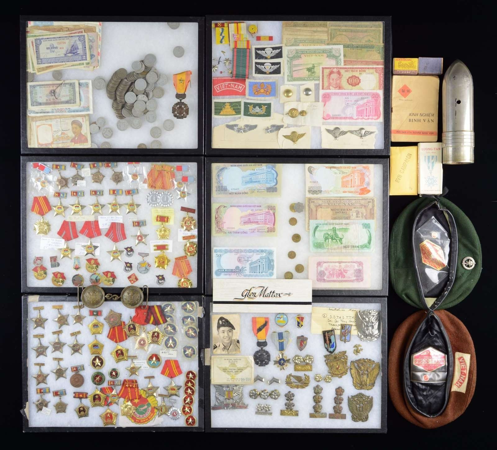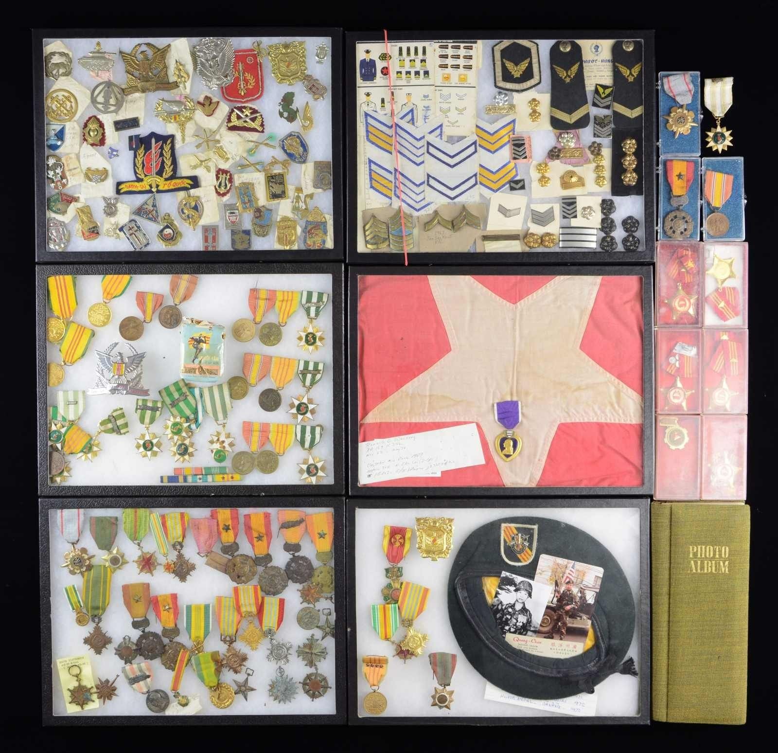 INSIGNIA WITH VARIOUS US MEDALS & RELATED MATERIAL. This huge lot consists of 75+ North Vietnamese medals & badges of various types & styles. / 35+ South Vietnamese medals of various types & styles. / 20+ American Vietnam era medals. / 75+ Vietnamese coins. / 1 Large group of Vietnamese bank notes. / 5 US medals that appear to be excavated. / 1 Captured North Vietnamese flag with the Purple Heart of the man who captured it. / Various North Vietnamese insignia of different styles. / Various South Vietnamese insignia of different styles. / A large variety of unidentified badges & pins from North or South Vietnam. / 3 South Vietnamese Special Forces berets. / 1 Photo album containing pictures of Vietnam. / 1 Photograph of a North Vietnamese officer. / 1 Artillery projectile. / 1 North Vietnamese 2-piece sword belt plate. / 2 Boxes of Vietnamese matches. / 1 Pack of Ruby queen Vietnamese cigarettes. / 10 Vietnamese medals in their original boxes. CONDITION: items generally show light wear; however, some medals & badges show moderate wear. Bank notes are circulated, as are the coins. Please see photographs for details of what is contained in this large lot. PROVENANCE: From the Lifelong Collection of Glen E. Mattox. (02-18638/BF). $600-800.