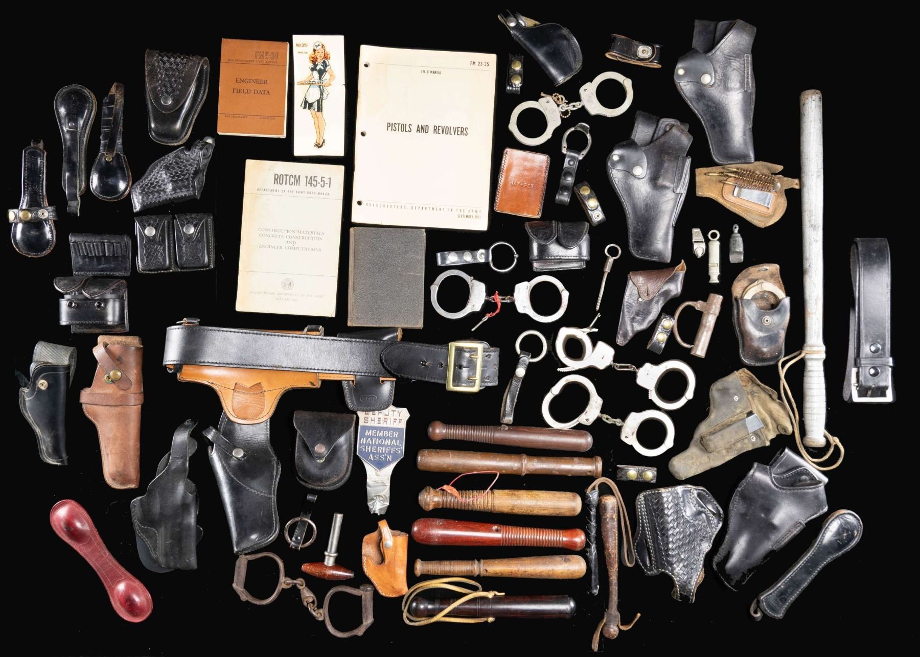 This lot consists of several police related items including the following: 1) Three handcuffs including two Smith & Wesson handcuffs. 2) Five varied batons. 3) About eight varied holsters. 4) A couple cartridge belts & pouches. 5) A hardcover copy of "The Police Prompter" 5th edition. 6) A soft cover 1947 dated copy of FM5-34 Engineer Field Data military manual. CONDITION: items show varying degrees of staining & age related wear such as crazing or oxidation. (02-24526-16/MJC). NON-GUN. $200-400 for lot.
