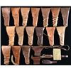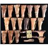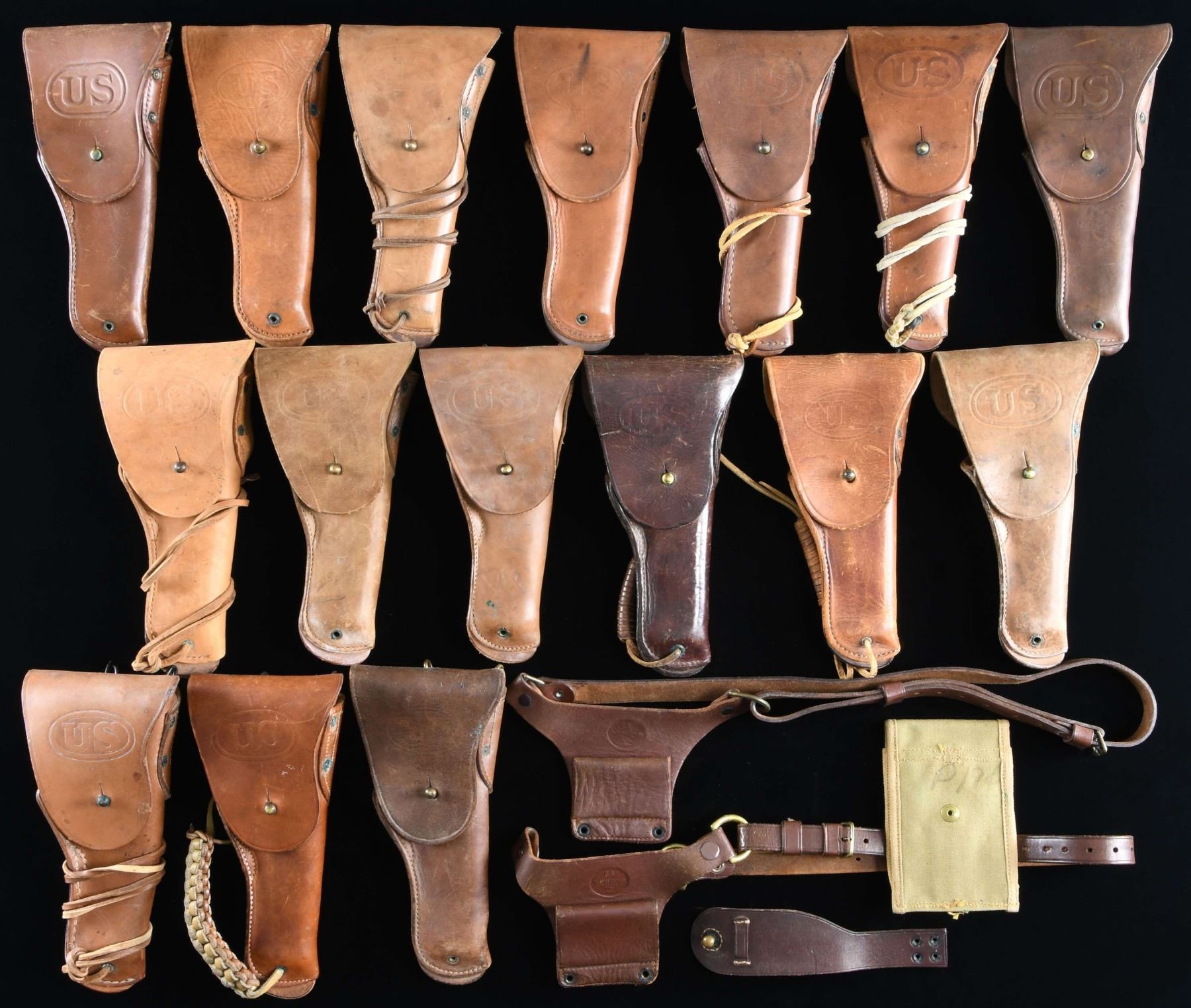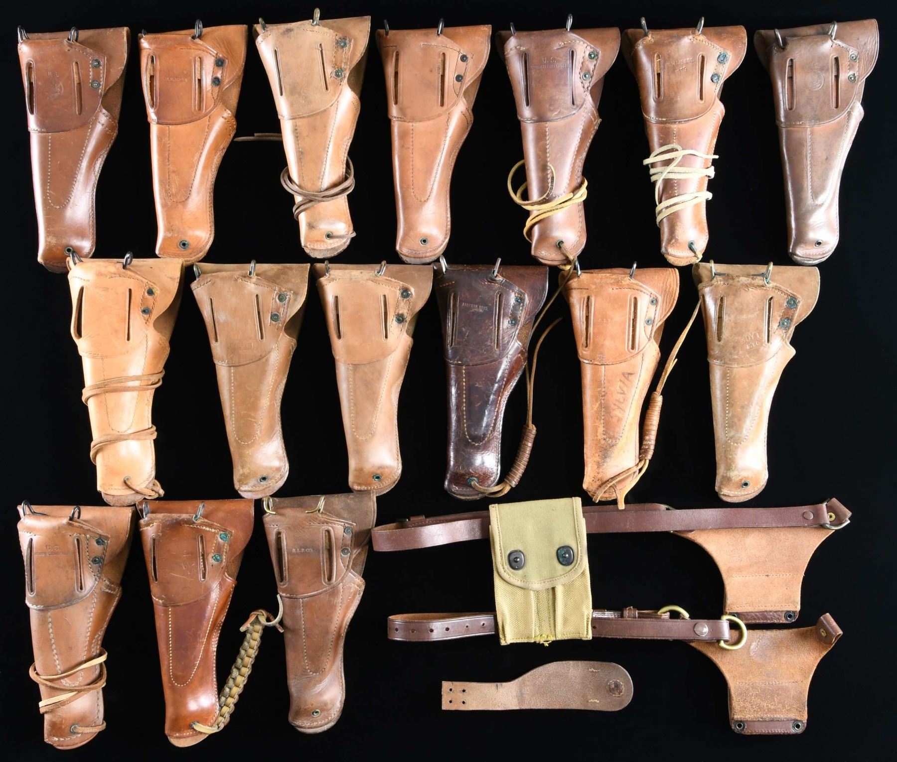 1916 HOLSTERS. Large lot of primarily assorted M1911 Model of 1916 holsters, including: 1) M1911 Model of 1916 holster mfg. by Craighead. Closure flap is embossed with "US" within an oval, with "U.S." above the encircled Craighead logo marked on the rear of the hanger. Brown leather construction, with brass fittings and non-ferrous metal belt hanger. 2) M1911 Model of 1916 holster mfg. by Boyt. Closure flap is embossed with "US" within an oval, with "BOYT/ E.T.C." marked on the rear of the hanger. Brown leather construction, with brass fittings. 3) M1911 Model of 1916 holster mfg. by A.L.P. Co. Closure flap is embossed with "US" within an oval, with "A.L.P. CO." marked on the rear of the hanger. Brown leather construction, with brass fittings. 4) M1911 Model of 1916 holster mfg. by W.H. MCM. Co. Closure flap is embossed with "U.S" within an oval, with "C.E.B." marked just under the closure flap stud, and "W.H. MCM. CO./ WTG" marked on the rear of the hanger. Brown leather construction, with brass fittings. Complete with leg thong. 5) M1911 Model of 1916 holster mfg. by Boyt. Closure flap is embossed with "US" within an oval, with a partially legible "BOY/ E.T." marked on the rear of the hanger. Brown leather construction, with brass fittings. Complete with braided leg thong. 6) M1911 Model of 1916 holster mfg. by A.L.P. Co. Closure flap is embossed with "US" within an oval, with "A.L.P. CO." marked on the rear of the hanger. Interior of closure flap exhibits a handwritten "D - 111 - 4", with "SYLVIA" handwritten on the rear of the holster body in black marker. Brown leather construction, with brass fittings and non-ferrous metal belt hook. Complete with leg thong. 7) M1911 Model of 1916 holster mfg. by Boyt. Closure flap is embossed with "US" within an oval, with "BOYT/ E.T.C." marked on the rear of the hanger. Brown leather construction, with brass fittings. 8) M1911 Model of 1916 holster mfg. by Enger-Kress. Closure flap is embossed with "US" within an oval, with "ENGER-KRESS" marked on the rear of the hanger. Brown leather construction, with brass fittings and non-ferrous metal belt hook. Complete with leg thong. 9) M1911 Model of 1916 holster mfg. by Craighead. Closure flap is embossed with "US" within an oval, with "U.S." above the encircled logo marked on the rear of the hanger. Brown leather construction, with brass fittings and steel belt hook. 10) M1911 Model of 1916 holster mfg. by Warren Leather Goods Co. Closure flap is embossed with "US" within an oval, with "U.S./ WARREN LEATHER GOODS CO." marked on the rear of the hanger. Brown leather construction, with brass fittings and non-ferrous metal belt hook. Complete with leg thong. 11) M1911 Model of 1916 holster mfg. by Boyt. Closure flap is embossed with "US" within an oval, with a faint "BOYT/ A.G.T." marked on the rear. Brown leather construction, with brass fittings. 12) M1911 Model of 1916 holster mfg. by Fink. Closure flap is embossed with "US" within an oval, with "F.I.N.K." marked on the rear of the hanger. Brown leather construction, with blackened brass fittings and non-ferrous metal hanger. 13) M1911 Model of 1916 holster mfg. by Warren Leather Goods Co. Closure flap is embossed with "US" within an oval, with "U.S./ WARREN LEATHER GOODS CO." marked on the rear of the hanger. Brown leather construction, with brass fittings and non-ferrous metal belt hook. Complete with leg thong. 14) M1911 Model of 1916 holster mfg. by Harpham Bros. Closure flap is embossed with "US" within an oval, with "HARPHAM BROS." marked on the rear of the hanger. Brown leather construction, with brass fittings and steel belt hook. Complete with leg thong. 15) M1911 Model of 1916 holster mfg. by A.L.P. Co. Closure flap is embossed with "US" within an oval, with "A.L.P. CO." marked on the rear of the hanger. Brown leather construction, with brass fittings and non-ferrous metal belt hook. 16) M1911 Model of 1916 holster mfg. by Boyt. Closure flap is embossed with "US" within an oval, with "BOYT - J.R.J." marked on the rear of the hanger. Brown leather construction, with brass fittings. Complete with leg thong. 17) Military police holster belt slide and shoulder strap hanger mfg. by The SchoellKopf Co. Front of hanger is marked "U.S./ THE SCHOELLKOPF CO/ DALLAS/ TEXAS/ 1942". Brown leather construction, with brass fittings. Left button on hanger has broken. 18) Military police holster belt slide and shoulder strap hanger mfg. by The SchoellKopf Co. Front of hanger is marked "U.S./ THE SCHOELLKOPF CO/ DALLAS/ TEXAS/ 1942". Brown leather construction, with brass fittings. 19) M1911 khaki canvas 2-cell web pouch mfg. by R.H. Long in 1918. Interior of closure flap is marked with a mostly legible "R.H. LONG/ 8-18" in black ink. Khaki canvas construction, with blackened brass fittings. 20) unidentified brown leather strap, with brass closure stud. Rivets are absent. CONDITION: holsters remain malleable, exhibiting varying degrees of wear, age related cracking, crazing, and marks from handling and storage overall. Brass fittings retain a pleasing mellow patina, with some spots of verdigris. (02-24271-2/MLW). $1,200-2,000.