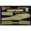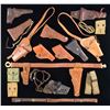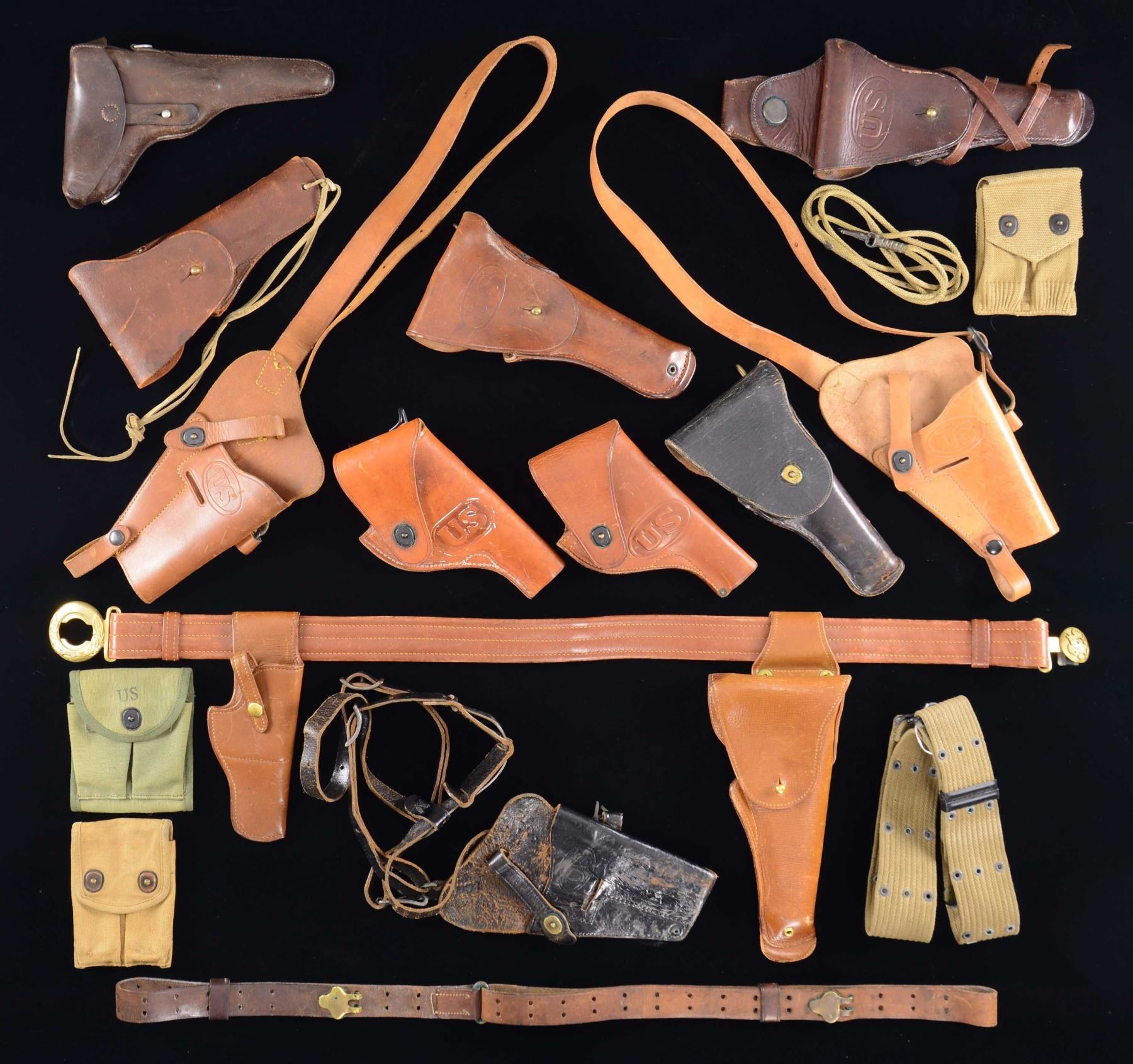 BELTS. Lot of primarily U.S. military holsters and belts consisting of: 1) Model 1912 M1911 holster mfg. by Rock Island Arsenal in 1911. Closure flap is embossed with "US" within an oval, with the rear of the hanger loop marked ""R.I.A./ 1911./ T.C.C." Brown leather construction with brass fittings, steel hook hanger, and drain hole at toe. Leg strap is present. UNATTACHED ACCESSORIES: Mills July 1918 dated 2-cell M1911 canvas web pouch and a canvas lanyard. CONDITION: Holster remains malleable, exhibiting some wear, age related cracking, as well as some scattered spots of mild crazing. Brass fittings exhibit scattered areas of verdigris. Mag. pouch and lanyard exhibit age related discoloration, but otherwise remain sturdy and serviceable. 2) Model 1916 M1911 holster mfg. by Hoyt in 1918. Closure flap is embossed with "US" within an oval, with the body marked "HOYT/ 1918/ J.J.M" beneath the closure flap. Rear of belt loop is inscribed, and appears to read "Kowalczik". Brown leather construction with brass fittings and hook hanger. Leather thong is present. UNATTACHED ACCESSORIES: Mills khaki canvas web belt, canvas lanyard, as well as a 2-cell khaki canvas web pouch containing 2 unmarked 2-tone M1911 mags. with lanyard loops on the pinned floorplates. CONDITION: holster remains malleable, exhibiting some wear, with mild age related cracking and scattered spots of crazing present overall. Brass fittings exhibit scattered spots of verdigris. Web belt and lanyard are very good overall. Mag. pouch exhibits wear and areas of dark discoloration, with the mfg. markings on the interior being illegible. Mags. show some wear and some scattered spots of surface oxidation. 3) Model 1916 pattern M1911 holster mfg. by Brauer Bros. Mfg. Co. Rear is marked "MADE ACCORDING TO U.S. Govt./ SPECIFICATIONS/ BRAUER BROS. MFG. CO./ ST. LOUIS MO.". Brown leather construction with brass fittings. Leather thong is present. CONDITION: holster remains malleable, exhibiting varying degrees of age related cracking and crazing overall. Brass fittings exhibit a mellow patina. 4) Model 1916 M1911 holster mfg. by Boyt in 1944. Closure flap is embossed with "US" within an oval, with "BOYT/ -44-" marked on the rear. Brown leather construction with brass fittings. CONDITION: holster remains malleable, exhibiting light to mild age related cracking and scattered spots of light crazing overall. Brass fittings exhibit areas of verdigris. 5) Model 1916 holster mfg. by Boyt in 1945. Rear is marked "BOYT/ -45-", which is mostly illegible. Black leather construction with brass "LIFT/ THE DOT" fastener and fittings. CONDITION: holster remains malleable, exhibiting wear with scattered spots of age related cracking and varying degrees of crazing present overall. Brass fittings exhibit areas of verdigris. 6) Unmarked General Officers pattern M1911 holster, with belt and additional Colt Model 1903/1908 holster. Brown leather construction with brass fittings and 2-piece Great Seal of the United States buckle. CONDITION: good, with wear, some age related cracking, and some crazing present overall. 7) M3 M1911 shoulder holster mfg. by Enger-Kress. Front is embossed with "US" within an oval, with the rear marked "U.S./ ENGER-KRESS". Brown leather construction with nonferrous metal fittings. Shoulder strap is present. CONDITION: holster remains malleable, exhibiting some wear and scattered areas of discoloration overall. 8) M3 M1911 shoulder holster mfg. by Enger-Kress. Front is embossed with "US" within an oval, with the rear marked "U.S./ ENGER-KRESS". Brown leather construction with nonferrous metal fittings. Shoulder strap is present. CONDITION: holster remains malleable, exhibiting some age related cracking on straps, with mild wear and light crazing present overall. 9) Unmarked M7 M1911 shoulder holster. Front is embossed "US" within a oval. Black leather construction with nonferrous metal fittings. CONDITION: holster remains malleable, exhibiting wear, as well as age related cracking and crazing overall. 10) .38 Caliber Colt/Smith & Wesson double action revolver holster mfg. by Rock Island Arsenal in June of 1954. Front is embossed with "US" within an oval, with "R.I.A./ MRT 6-54" on the rear. Brown leather construction with brass fittings. CONDITION: holster remains malleable, exhibiting scattered handling marks, with a few areas of mild age related cracking and crazing. 11) 38 Caliber Colt/Smith & Wesson double action revolver holster mfg. by Boyt. Front is embossed with "US" within an oval, with "BOYT" within an oval marked on the rear. Brown leather construction with brass leather fittings. CONDITION: holster remains malleable, exhibiting some wear and age related discoloration overall. 12) Swiss Model 1900 Luger holster mfg. by Joh. Blaser in 1905. Rear is stamped "JOH. BLASER/ SATTLER/ BERN/ 05", with a boxed Cross/N on the interior of the closure flap. Belt loops have been modified, with the stitching at the bottom having been replaced with brass studs, and the belt loops having been replaced with straps with slots cut for said studs. CONDITION: holster remains malleable, exhibiting some wear, with light to mild age related cracking and crazing present overall. 13) US Model 1923 OD M1 Garand cartridge belt. OD canvas construction with black painted nonferrous metal fittings. CONDITION: very good, with some age related discoloration and varying degrees of wear to the metal fittings. 14) US Model 1936 olive canvas web belt mfg. by Nasco in 1943. Olive canvas construction, with nonferrous black metal fittings. CONDITION: belt shows some age related discoloration, as well as some wear to the metal fittings, but otherwise remains sturdy and serviceable. 15) 2 unmarked 2-cell US mag. pouches. 1 of khaki canvas construction with brass fittings for the M1911, with the other of green canvas construction with a nonferrous metal fastener. CONDITION: good, with wear and age related discoloration. 16) US Vietnam era green canvas scope carri