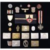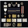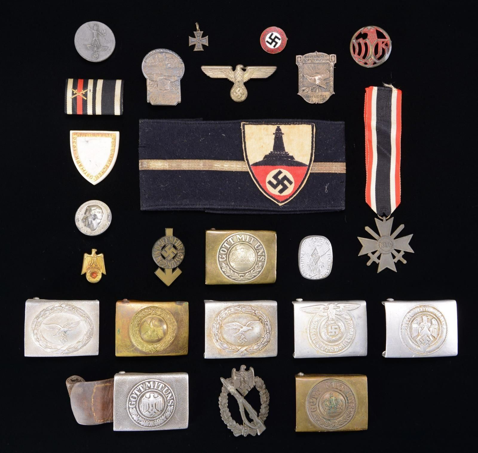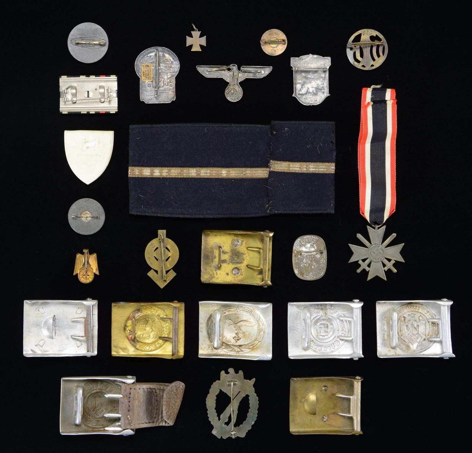 BADGES, MEDALS, & MORE. This lot includes 1 WWII aluminum Army belt buckle with “GOTT MIT UNS” over a central eagle. / 1 HJ belt buckle in aluminum. / 1 Luftwaffe buckle in aluminum. / 1 Luftwaffe buckle in aluminum with the 2-prong keeper missing. / 1 SS belt buckle in aluminum of questionable age. / 1 Prussian police belt buckle of the 2nd pattern in brass. / 1 WWI German brass belt buckle of standard design with a crowned, silvered center and “GOTT MIT UNS” above. / 1 WWI German brass belt buckle of standard design with a crowned center and “GOTT MIT UNS” above. / 1 Kyffhauserbund armband. / 1 Infantry Assault Badge. / 1 War Merit Cross with swords & ribbon. / 1 Ribbon bar for a WWI 2nd Class Iron Cross & a 1914-18 Cross. / 1 Police cap eagle. / 1 HJ Proficiency Badge. / 6 Various tinnies. / 1 WHW pin. / 1 Enamel party pin. / 1 Miniature WWI 2nd Class Iron Cross, no ribbon. / 1 Porcelain 1936 Gautreffen Badge missing its pin. CONDITION: all items generally show light wear, except as noted. (02-20917/BF). $600-900.