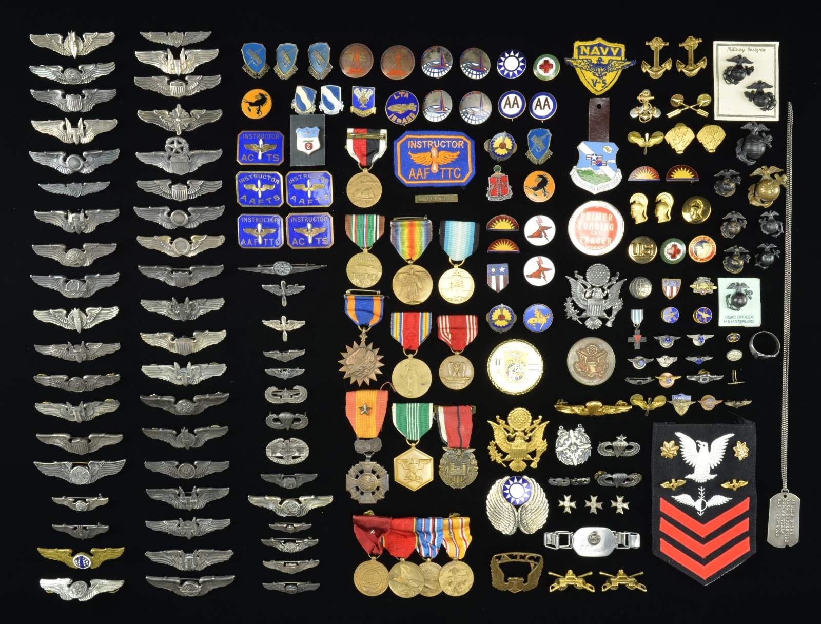 DI'S & MORE. This lg. and varied lot includes 10 Air Gunner wings, 3 Observer wings, 3 Navigator wings, 3 Bombardier wings, 6 Pilot wings, 1 Senior Command Pilot wings, 6 Air Crew wings, 2 Enlisted Reserve Wings & 17 other wings of several sizes & types. / 15 Medals including Antarctic Service, WWI Victory, Air medal, Vietnamese Cross of Gallantry & more. / Approx. 30 DI’s of various types, periods & units. There are 5 enamel pins for an instructor for the AC TS along w/ a similar patch. / Finally, there is a bag of over 65 various military pins, insignia, miniature wings & related items. CONDITION: generally items show very light wear, are complete & undamaged. PROVENANCE: Collection of Brian C. Pinkerton. (02-15439-1/BF). $600-800.