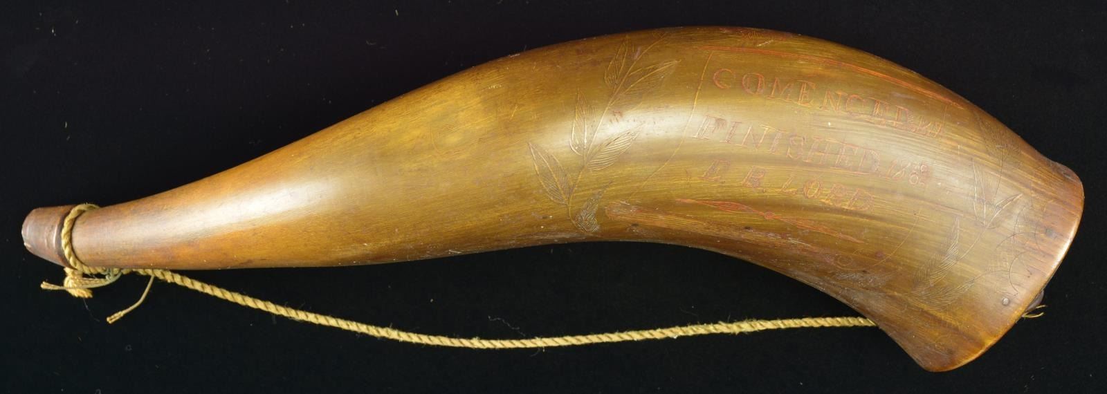 LARGE POLYCHROME CARVED HORN WITH EAGLE & PANOPLY