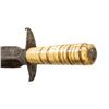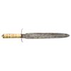 MADE FROM FILE. 15.5" overall, 11" double edged blade .30" thick ricasso, carved turned bone handle, 3" forged cross guard with turned down quillons, lead around peened tang. Pictured on page 147 of James Johnston's "ACCOUTREMENTS II". Interesting early American knife that maker signed "JH" on ricasso. CONDITION: very good overall, "as found", blade well worn, rounded point, still sharp with nicks in cutting edge, large age crack through handle. PROVENANCE: James R. Johnston collection. (02-26007/JS). NON-GUN. $800-1,200.