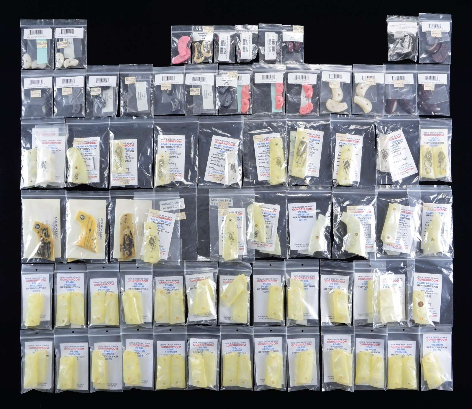 WIDE RANGE OF HANDGUNS (TOTAL: 71 Pairs). 26 Pairs of N.C. Ordnance white pearl premium reproduction grips for Colt Mustang Pocketlite (one w/ Colt logo). / 2 Pairs N.C. Ordnance Model Python w/ Grim Reaper motif. / 3 Pairs of N.C. Ordnance 380 Gov't Model w/ Grim Reaper motif. / 2 Pairs of Colt Officer's Model w/ Grim Reaper motif. / 3 Pairs of Colt Mustang w/ nude motif. / 1 Pair of Colt 380 Gov't Model plain. / 1 pair Colt 1911 Officers Model plain white. / 2 pair Colt 1911 .45 w/ Grim Reaper motif. / 1 pair Colt 1911 w/ nude motif. / 1 Pair Ruger Super Black Hawk in white. / 1 Pair Smith & Wesson J Frame square butt in white. / 1 Pair Smith & Wesson K&A frame square butt in white. / 1 Pair Colt 1911 faux stag. / 1 Pair Ruger Black Hawk faux stag Ruger medallion. / 1 Pair Ruger Black Hawk faux aged ivory Star medallion. / 2 packages of 4 silver colored grip screws. / 24 Pairs N. American Arms simulated pearl grips in white & burgundy. TOTAL: 71 Pairs of grips. CONDITION: all appear to be unused in near new condition. PROVENANCE: the Collection of Gun Sport Ltd owned by Jon R. Thomas. (02-20860/RW). $1,000-2,000.