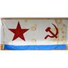 This large cotton flag measures 5’ x 10’ and features a red star and sickle on a white field with a blue bar below. This is the standard flag flown by Soviet naval vessels. The flag has reinforced corners and a heavy cotton hoist. The hoist is stamped “FLAG, NAT’L U.S.S.R., ENSEN, COTTON, 5’ X 10’ CONTRACT NO. 8131-78 8345-00-408-5277 DEFENSE PERSONNEL SUPPORT CENTER”. CONDITION: flag is sound but shows significant staining. (02-16843-2/BF). $100-200.