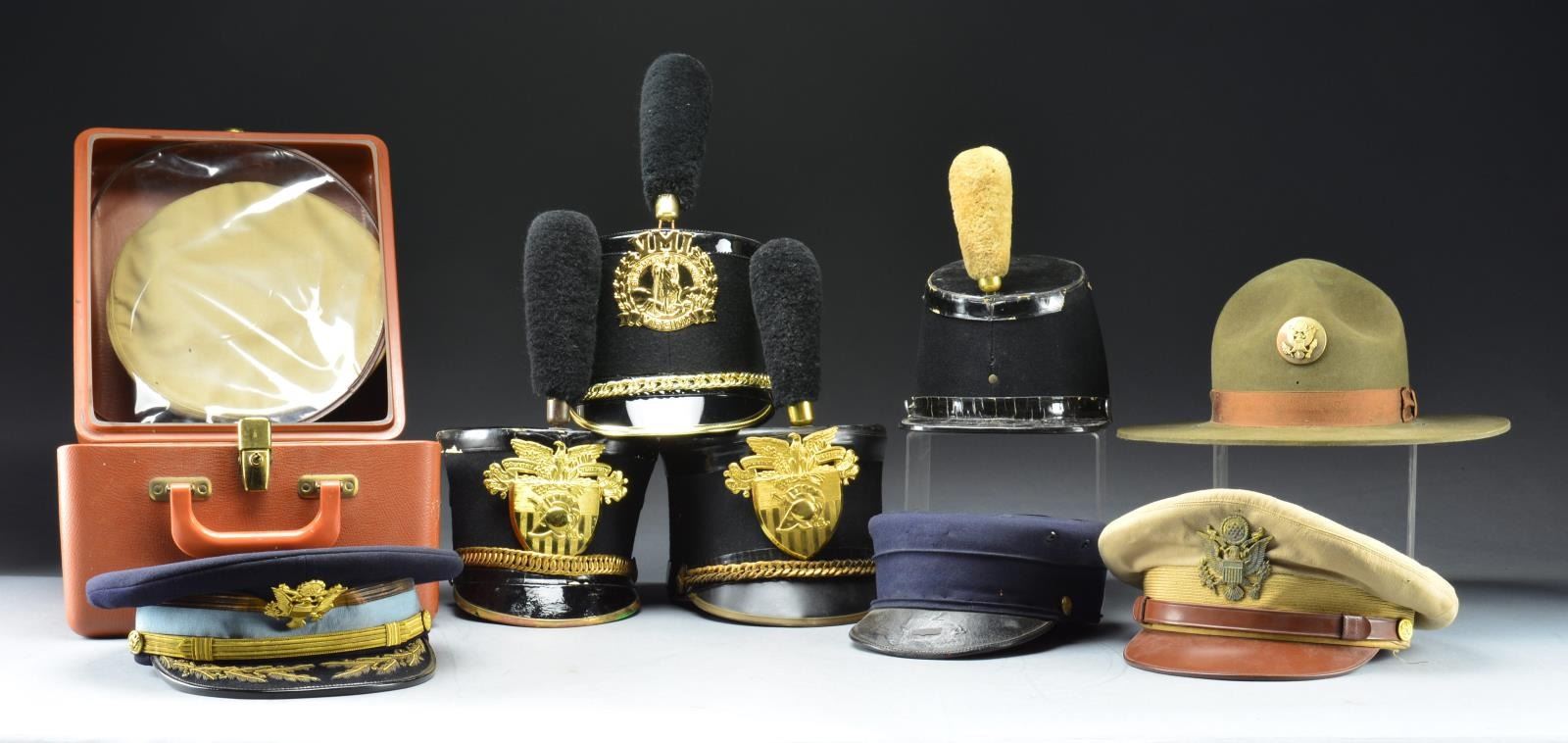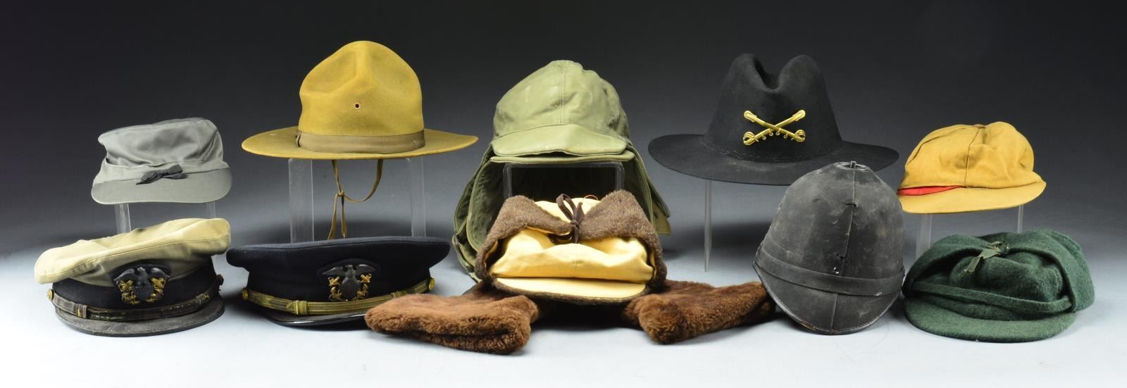 This lg. & varied group of hats includes 1 WWII era Navy officer’s hat w/ black crown. Visor is split. / 1 WWII era field grade Army officer’s hat w/ dark blue crown & gold bordered, light blue band. Visor has heavy gold bullion oak leaves & acorns. / 1 WWII Navy officer’s hat w/ green crown. Hat is heavily worn. / 4 WWI or WWII era campaign hats. / 1 Khaki crown for a Navy officer’s hat. / 1 GAR type slouch hat w/ crossed sabers on the front. / 1 WWII khaki enlisted man’s visor cap. Visor is partially detached. / 1 WWI era New York enlisted man’s visor cap w/ no insignia, chinstrap or visor. / 1 WWII artillery officer’s visor cap w/ dark blue crown & gold bordered red band. / 1 Reversible khaki ball cap. / 1 WWII era Army officer’s visor cap w/ khaki crown. / 1 OD foul weather hood. / 2 Gray/green insulated hunting caps. / 1 WWII era officer’s khaki visor cap w/ no insignia. Cap shows heavy wear. / 1 WWII officer’s visor cap w/ brown felt crown. Cap is well worn. / 1 Civil Defense armband. / 2 US Navy foul weather hats. / 10 Overseas caps, 1 w/ mouse damage. / 1 Pair of heavy winter mittens w/ matching cap. / 1 Army green ball cap. / 1 Body only for a New York militia M1881 spike helmet w/ notable insect damage. / 1 Body for an M1881 enlisted spike helmet w/ an eagle front plate for the 8th Cavalry partially attached to the front. / 1 WWII era Coast Guard officer’s visor cap w/ no front insignia. / 1 WWI/WWII campaign hat. / 1 M1872 militia helmet body w/ plume. / 1 WWII front seam, fixed bail helmet shell w/ the remains of white paint & a red cross on either side. Helmet has paint loss & dents on the top. / 1 M1895 Army cap w/ no insignia. / 1 Body only for a M1887 sun helmet. / 3 Loose sweatbands. / 1 Khaki visor cap crown. / A partial cavalry hat cord. / 1 Plastic carrying case containing 2 WWII Navy visor caps. / 1 VMI shako w/ black plume. / 2 USMA shakos w/ black plumes. CONDITION: as expected, condition varies greatly in this lot. Most hats show light to moderate wear except as noted. (02-15734/BF). $500-800.