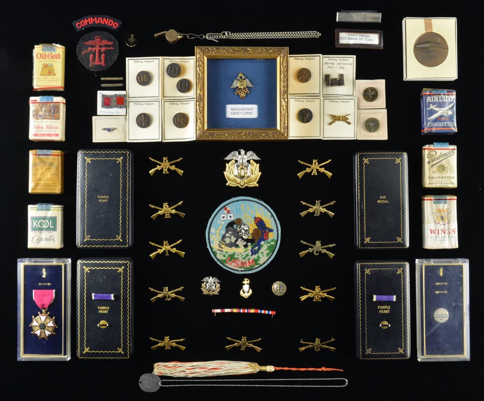 12) MILITARY MEDALS, HATS & RELATED MATERIAL. This group consists of 9 overseas caps. / 1 Sm. cadet belt & buckle. / 1 Secret compartment belt buckle. / 6 Leather sheaths. / 1 Israeli Knesset medal. / 1 US Legion of Merit medal. / 1 Air medal w/ 3 oak leaves in original box. / 3 Award boxes for purple hearts w/ no medals. / 2 US Navy ditty bags. / 6 Packages of unopened WWII era cigarettes. CONDITION: all items show light wear. (02-15466/BF).