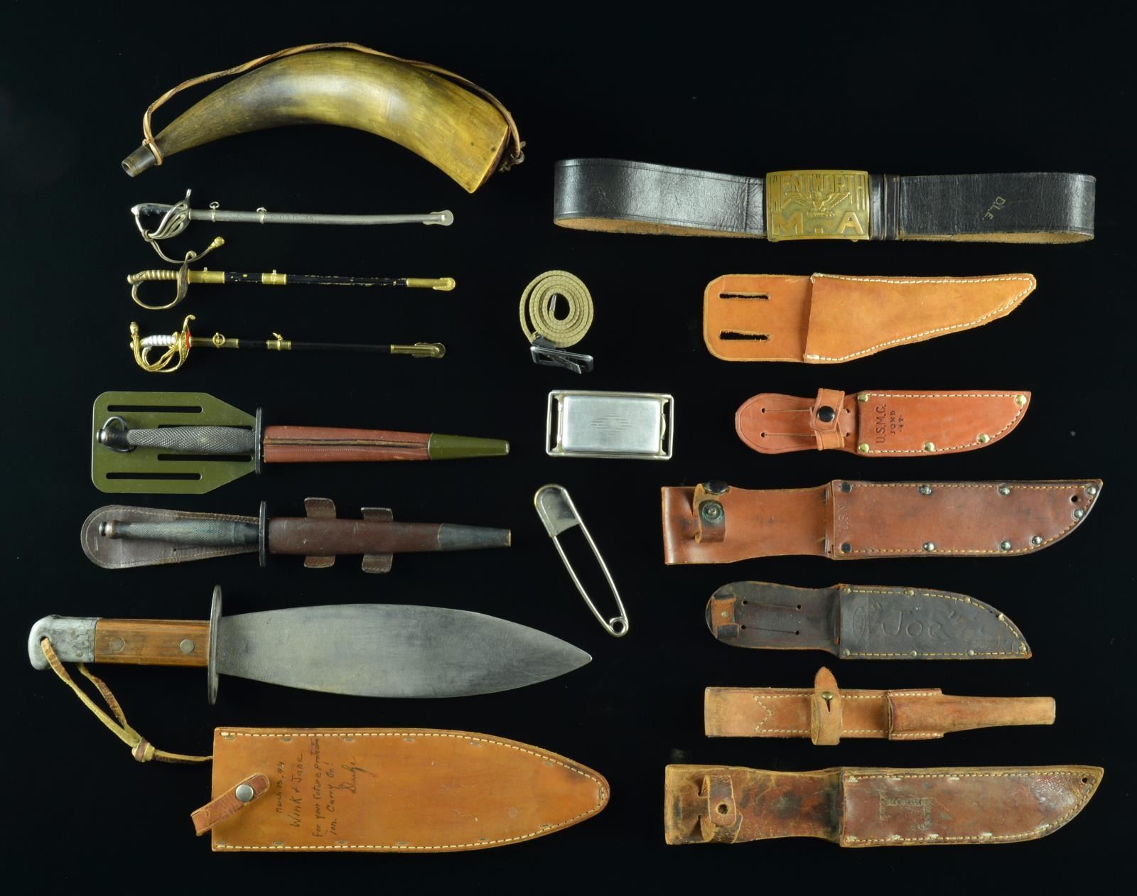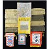 10) MILITARIA. A bag of mixed militaria that includes 2 Son in Service banners. / 1940 Proud American banner. / Amphibious Force patch. / 1973 Graduation tassel. / 19th Century knife w/ sheath. / WWII Marine dog tag for Edward J. Rowe. / Commando patch. / Whistle & chain. / 2 Burma campaign pins. CONDITION: items show light wear overall.