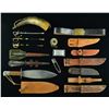 1) WWII US OSS STILETTO. Overall length: 12 3/8". Stiletto features a pancake flipper sheath. Knife has a darkened bronze grip w/ crosshatching, unmarked crossguard & blued blade. Sheath has green painted metal “flipper” w/ leather body. We believe this knife to be of post WWII mfg. CONDITION: stiletto shows very light wear.