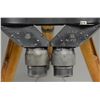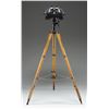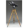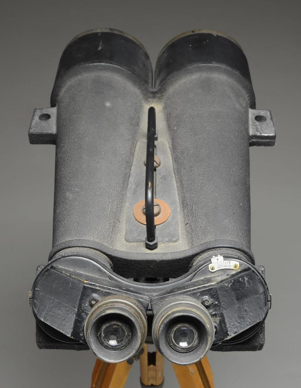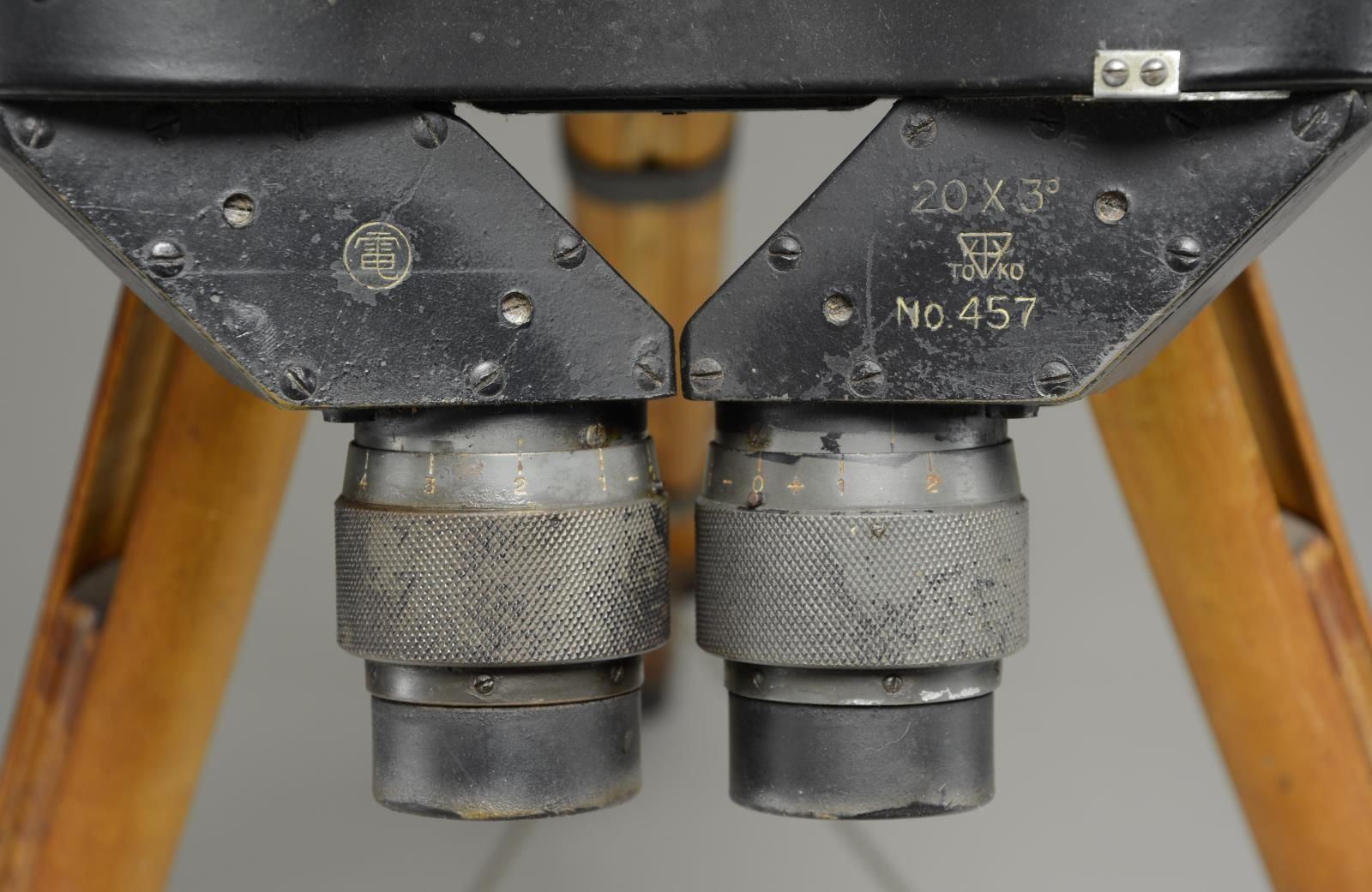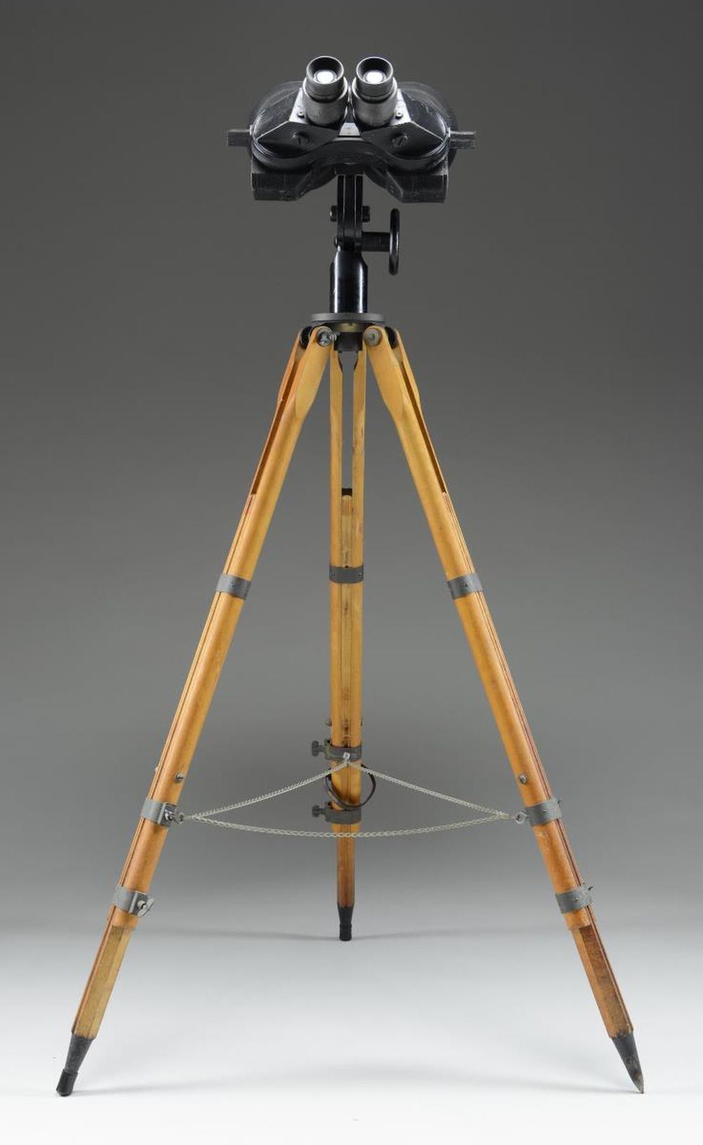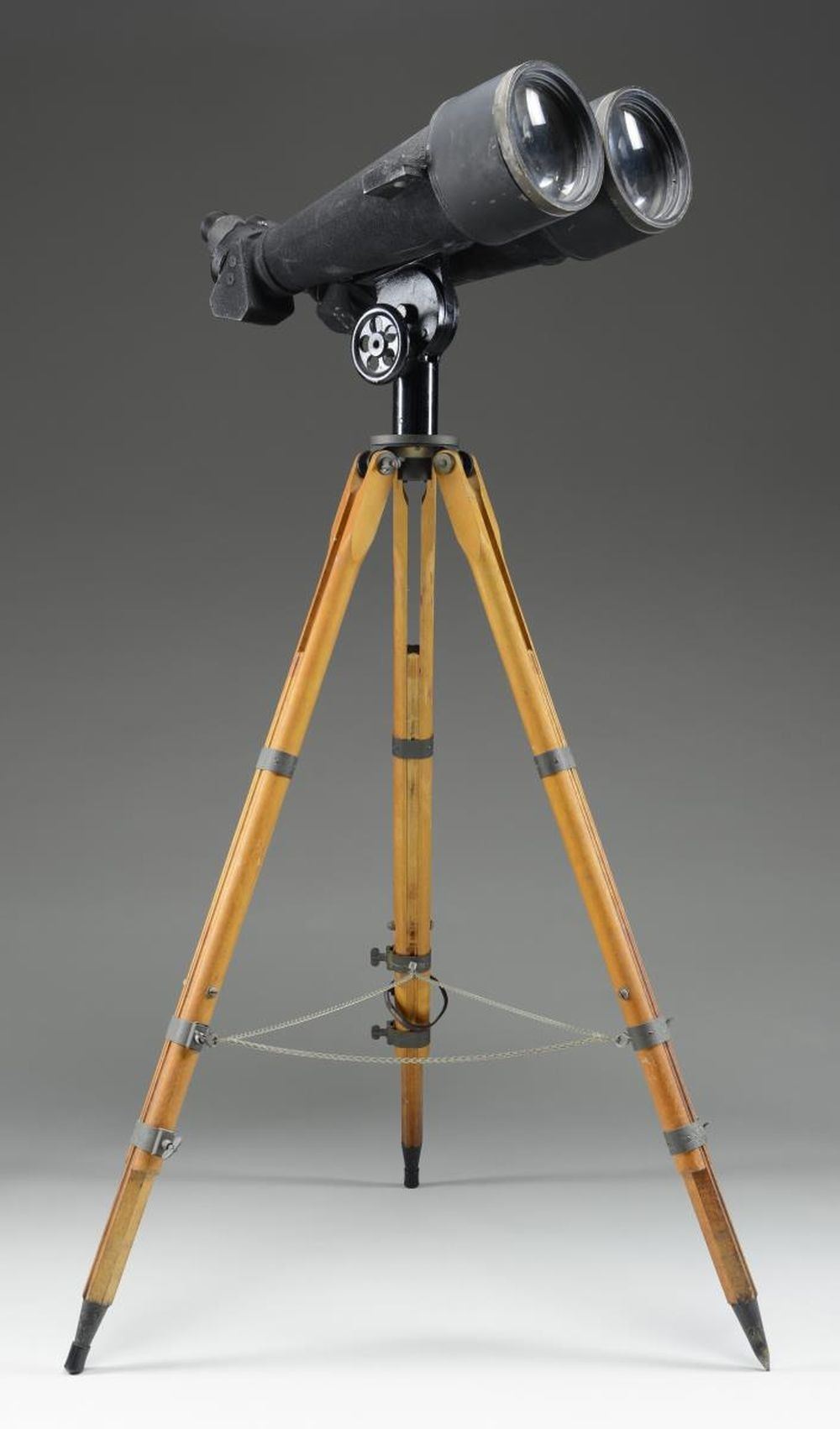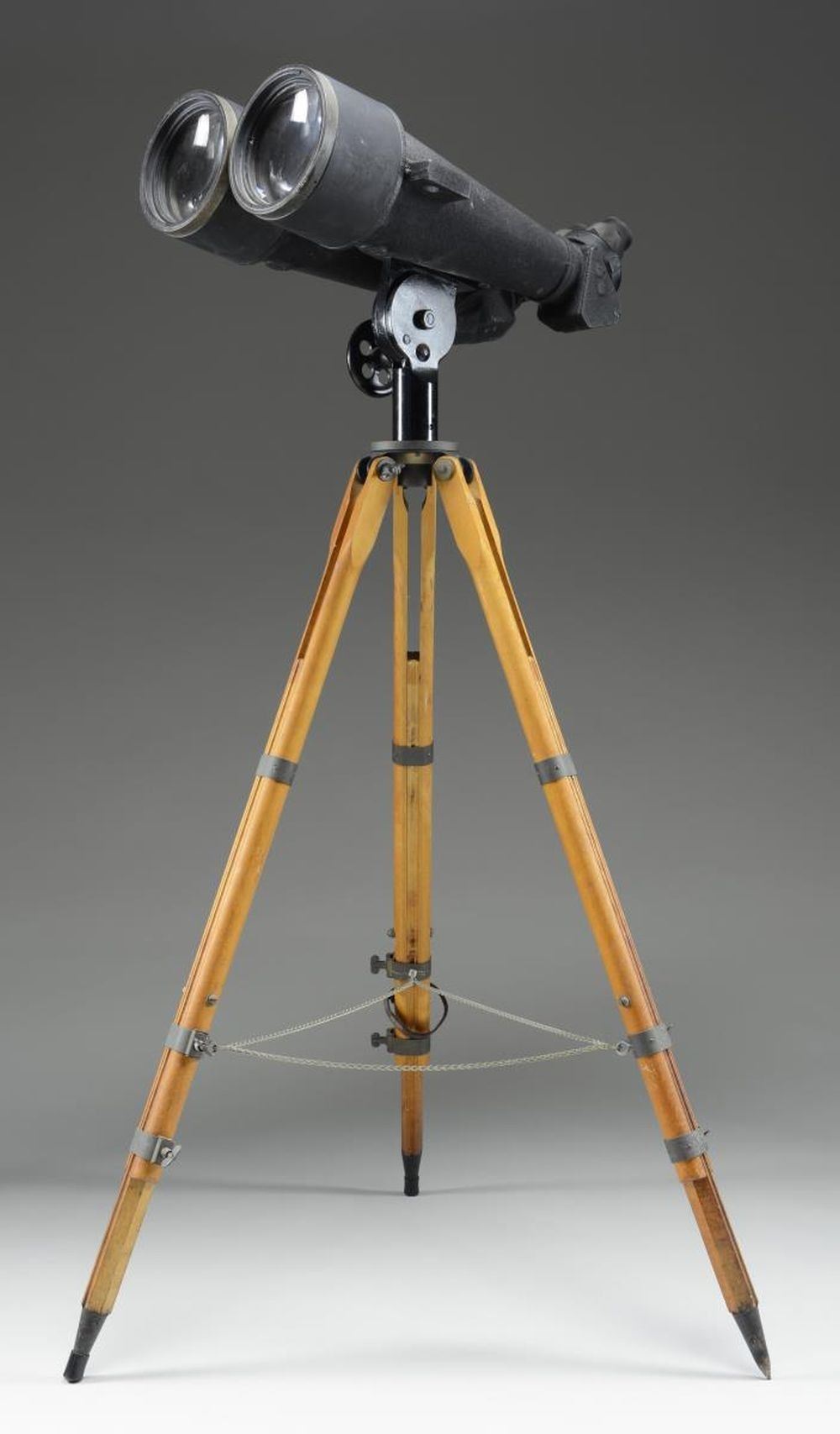 Giant Japanese 20x power binoculars of the type used on naval vessels. Purportedly this example came off a Japanese destroyer. Binoculars are marked "20X3 TOKO NO 457" & w/ a Japanese symbol. Optics are cloudy. Binoculars measure about 24" in length & 12" in width. Front of lenses measure 5 1/2" in width. Rear measures about 1 1/2". Lens knobs turn w/ right knob being a bit stiff. Binoculars have a pebbled black finish on tubes & black enamel finish on other parts. American made Dietzgen U.S.C.E replacement tripod present in good condition w/ scattered wear. CONDITION: enamel parts show scattered flaking, other parts show scattered oxidation & staining. (02-19770/MJC). $1,500-2,500.