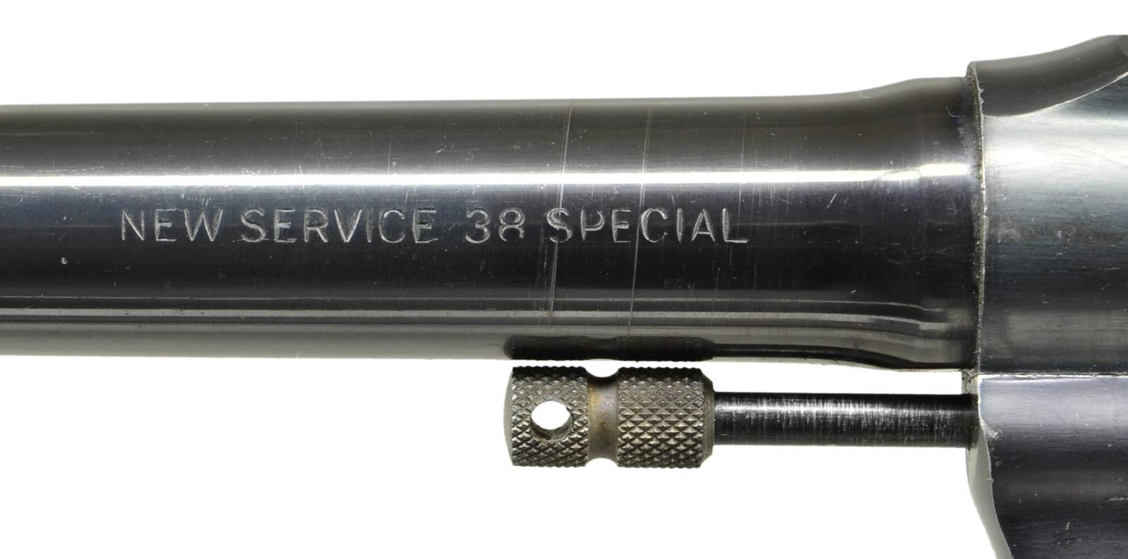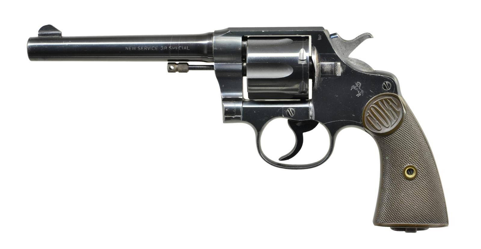 Cal. 38 Spl. S# 356362 (1944). Per "The Book of Colt Firearms Third Edition by R.L. Wilson" The New Service model was mfg. 1898-1944 from S# range 1 - 356,000. This revolver's configuration is different than the 38 Special Models being produced at the time. Bbl. 6" w/ serrated ramp front sight. Left side of bbl. marked "NEW SERVICE 38 SPECIAL" & 1 line address on right side of bbl. While this revolver is "blued", there are 3 distinct tones: bbl. has a "black" appearance, frame has a "rust blue" appearance while the side plate has a purple tone. 6 Shot fluted swing out cyl., sighting groove on top strap & lanyard ring at butt. 2 Piece "COLT" marked hard rubber grips scratched on back "8846". Frame on left side above cyl. latch has a "W" inside crown proof. CONDITION: good to very good overall appearance w/ moderate handling marks, scratches, cyl. turn line & pinprick oxidation. Very good grips. Very good bore. (22-2013/MD). CURIO. $800-1200.