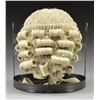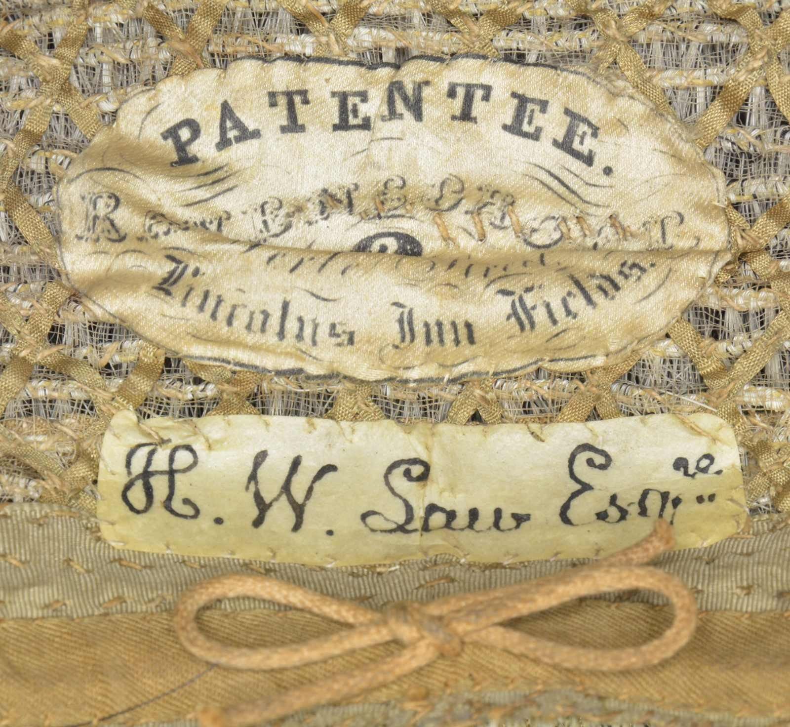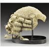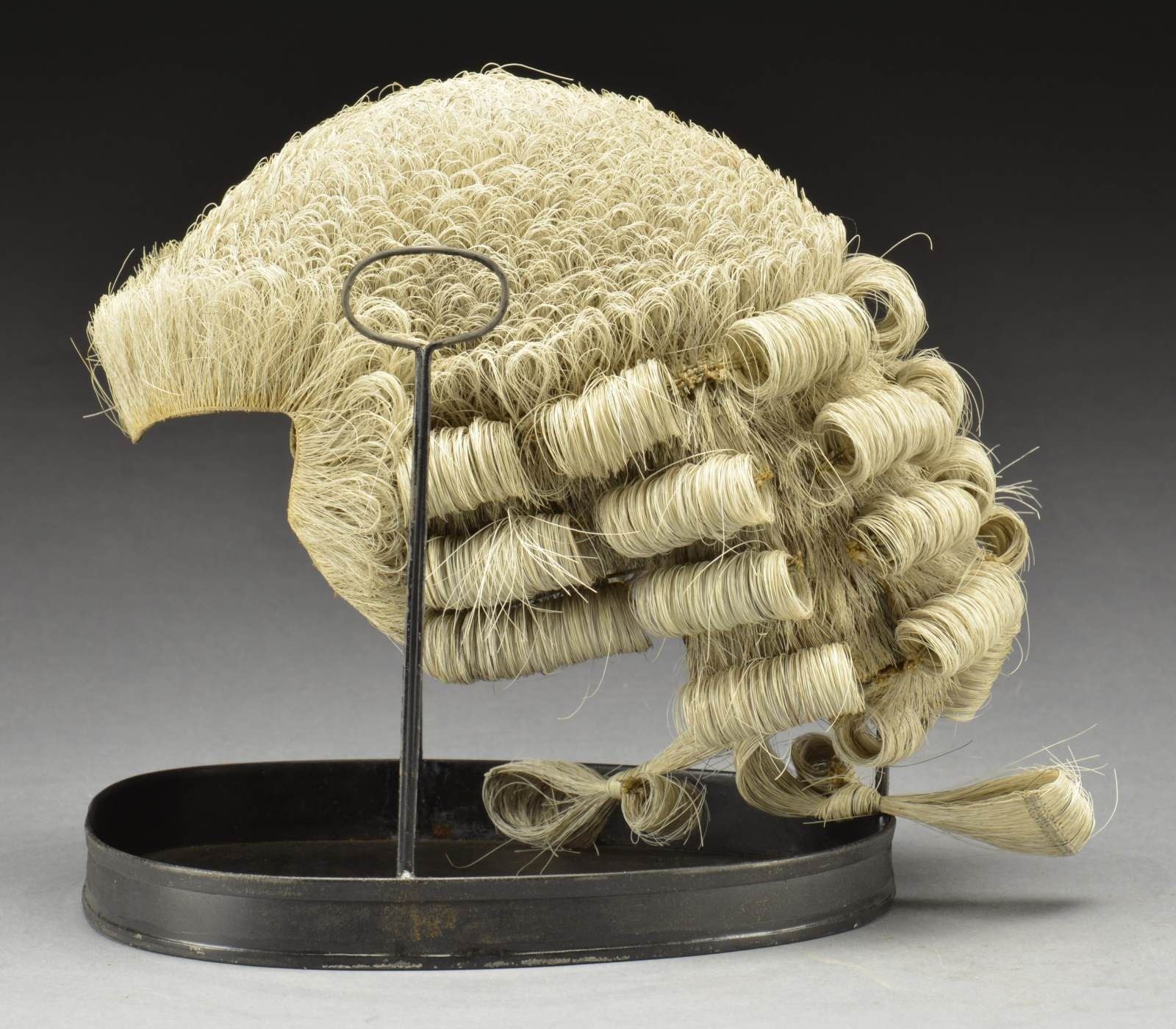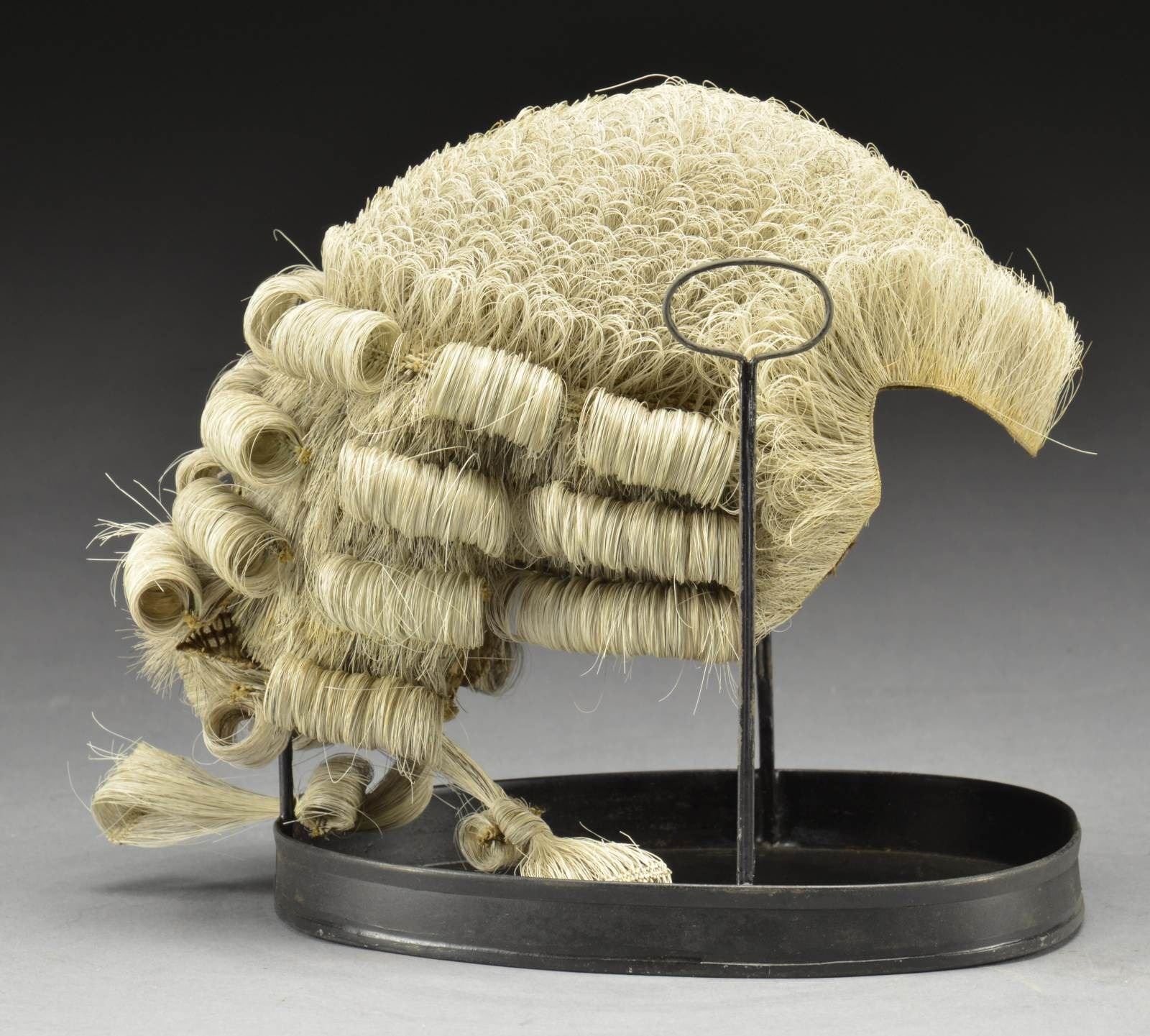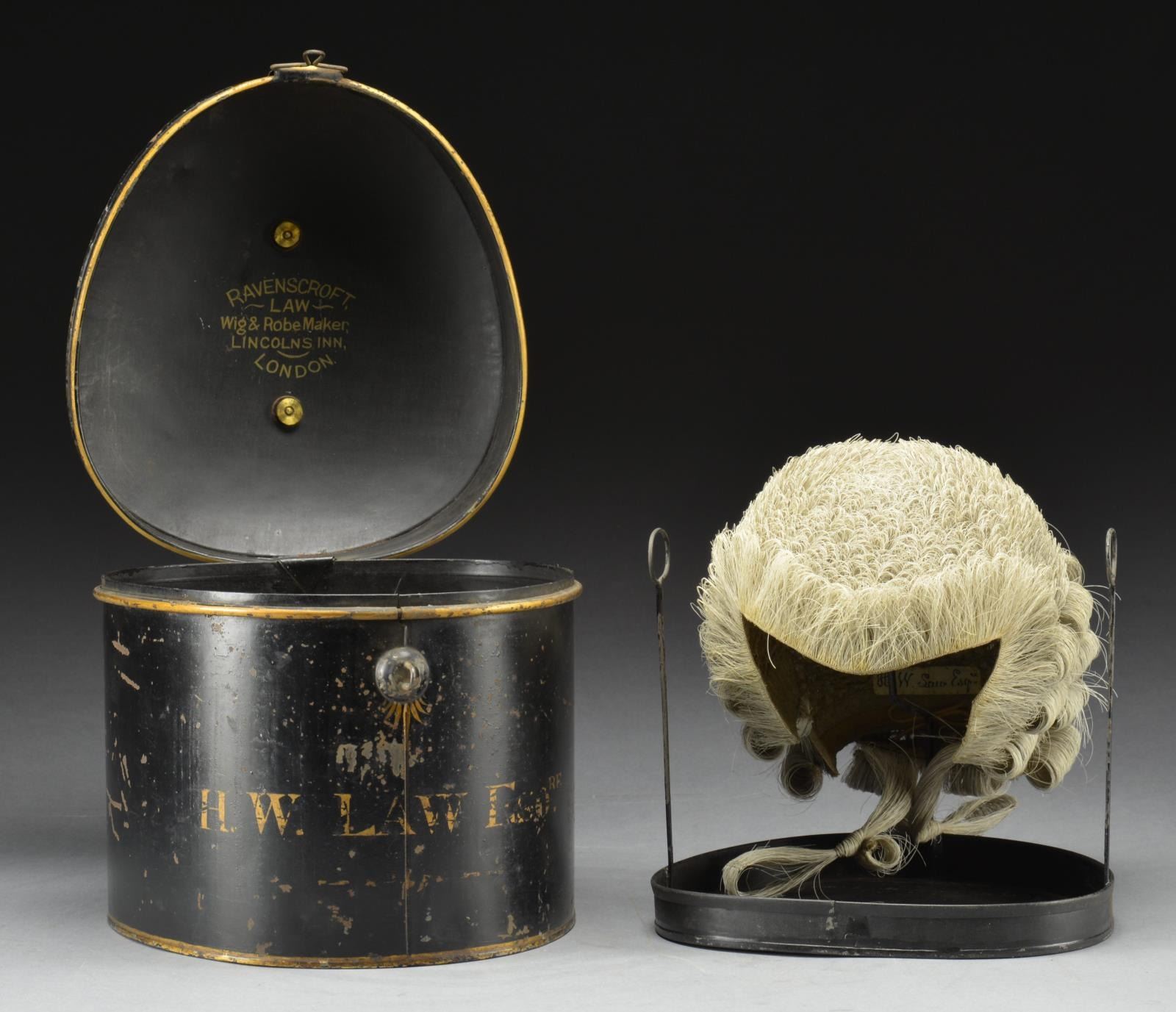 ORIGINAL TIN BOX. A wonderfully preserved example of a turn of the century British barrister’s wig belonging to Henry William Law, Esquire, from Hampshire, England. He had a privileged education attending the Harrow School until 1887. He received his BA in 1890 from Trinity College. Law was “called to the bar” at Inner Temple in 1895. It is quite likely the wig dates from that time period. He was a greatly respected lawyer who wrote, “Carson’s Real Property Statues” in 1927. The wig itself is made of horsehair & has a label on the inside that reads, “PATENTEE. RAVENSCROFT LINCOLN’S INN FIELDS 3 SERLE ST.”. There is also a parchment name tag that reads, “H.W. LAW ESQR.” sewn into the lining of the wig below the maker’s tag. The wig comes in its original tin box painted black w/ gold edging w/ gold letters on the front spelling out, “H.W. LAW ESQRE.”. The box also contains a lift out wig stand & 3 white barrister collars. UNATTACHED ACCESSORIES: documents relating to the Law family as well as Henry William Law’s life & education. There are also several pages of information about barrister wigs in general. CONDITION: the wig is in truly amazing condition for its age showing minimal wear. The collars are a bit discolored but undamaged. The box shows minor paint loss w/a few scuffs & scrapes but no notable damage. (02-15663). $1,000-1,400.