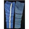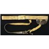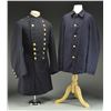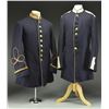 ASSOCIATED WITH THE KENTISH GUARD OF RHODE ISLAND. This group of uniforms appears to date from the 1880’s to just past the turn of the century. Most of the uniforms seem to have an association with the Kentish Guards, a well known Militia organization from East Greenwich, RI. The group includes 1 Officer’s frock coat with white & gold bullion collar trim. There is one row of bullion adorning the sleeves. There are 9 Kentish Guard buttons down the front and 6 on the tail. The interior is lined with white cotton. / 1 Private’s frock coat with white shoulder tabs, white cuff trim, and white piping. The 9 button coat is missing 5 buttons but 3 loose buttons are attached to the coat. The cuff buttons and shoulder tab buttons are small Kentish Guard types. There are also 6 coat sized Kentish Guard buttons on the tails. The coat is lined with white polished cotton and is quilted. / 1 Enlisted sack coat with 5 1872-1902 buttons down the front and 3 incorrect staff buttons on each sleeve. Coat has a sewn hem and a dark blue wool lining. / 1 Dark blue officers double breasted frock coat with 18 buttons down the front (4 missing). Each cuff has 3 small Kentish Guard buttons and the tail has 4 coat sized buttons. The shoulders have sewn on attachments for epaulets. Black polished cotton lining with some quilting. / 1 Pair of blue wool pants with 1" wide white wool stripes down the outside of each leg. Pants have a 5 button fly and provisions for a belt. / 2 Pair of blue wool trousers with an adjustment strap at the rear waistband. 5 Button fly on one and 4 button with a snap on the other. / 1 Officers belt & buckle dating from 1880-1902 complete with sword straps and M1851 style buckle made by Henry V. Allien. CONDITION: all uniforms show some degree of wear and most have some moth damage. Several buttons appear to have been resewn or replaced. One of the blue wool pants has severe moth damage. (02-18135-2/BF). $600-900.