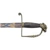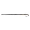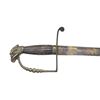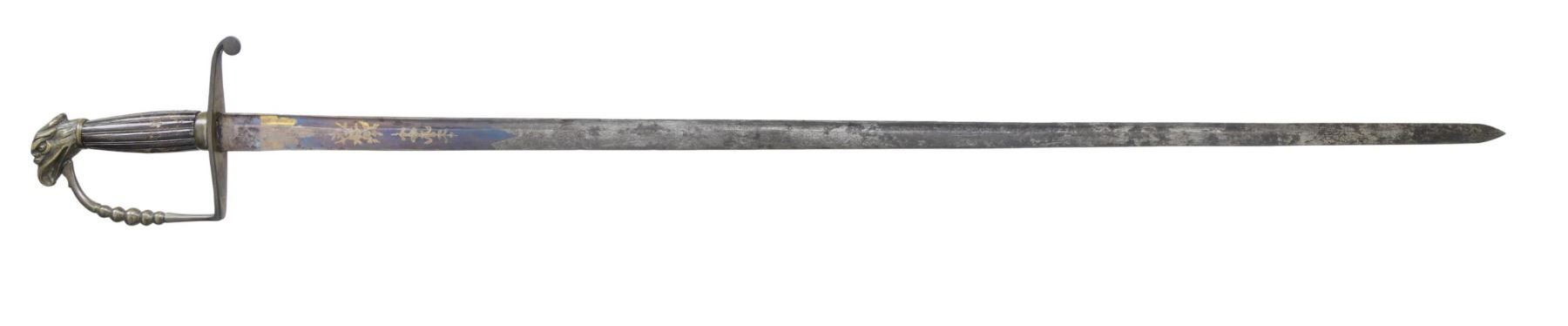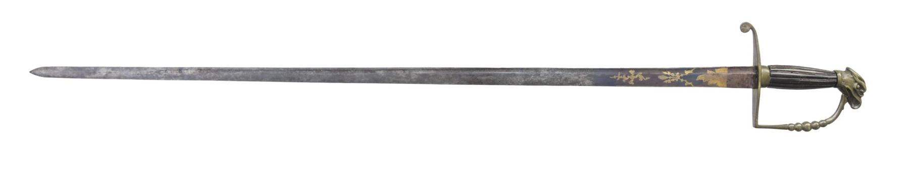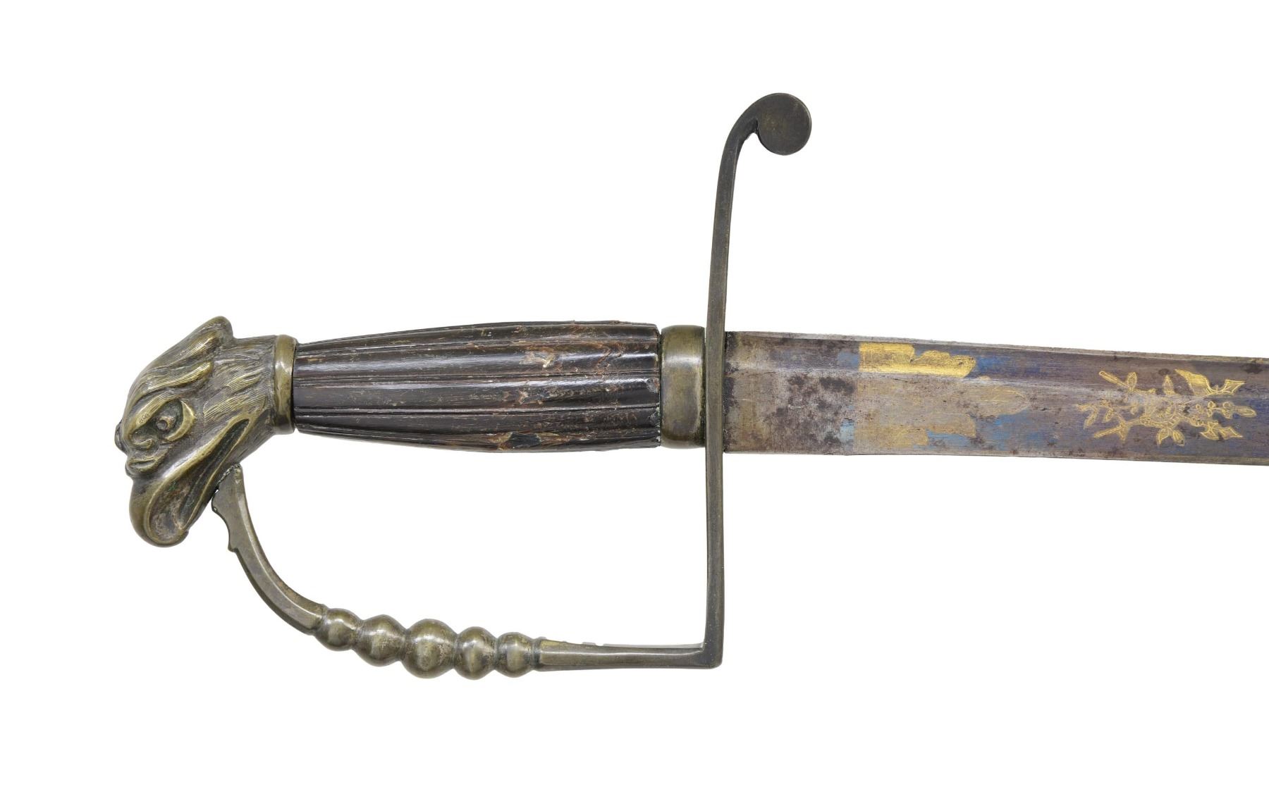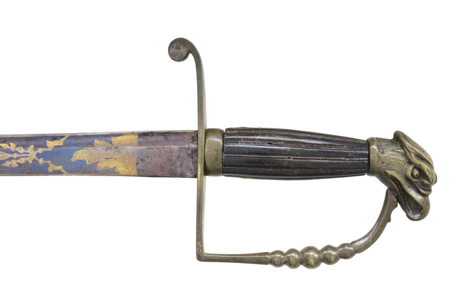 SWORD. Overall length: 37 1/2". Blade length: 32 1/2". Blade has a single, narrow fuller and features gold-highlighted etching on a blued field. Etching includes foliate and military motifs, and the blued field extends 7 1/2" up the blade. Gilded brass hilt with plain guard and downturned quillon. Five-ball knuckle bow and classic eagle pommel. Vertically reeded, dark horn grip. No scabbard. CONDITION: blade has a smooth, dark patina with traces of the blued field remaining and ample gilding highlighting the etched decoration. Hilt retains nearly no original gilding but is undamaged. Grip is intact but shows the usual dents and dings. (02-23024/BF). $400-600.