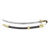 Overall length: 37”. Blade length: 30 5/8”. Blade has a single wide fuller with vestiges of gold-highlighted etching on a blued field over the first 15 1/2". Etching includes various foliate, military, and patriotic motifs, including sprays of arms. Brass hilt was likely originally gilded. Crossguard, with downturned quillon, and the knuckle bow are quite plain. The backstrap is also plain but leads to a very well-articulated eagle head pommel. Carved bone grip with a 2” section on one side having a dark epoxy repair. Brass-mounted leather scabbard. CONDITION: blade has a dark, mottled patina with only traces of gilding and bluing remaining. Crossguard is slightly bent. Repaired grip. Scabbard remains quite solid with minimal flaking and flexing. (02-22348/BF). $500-750.