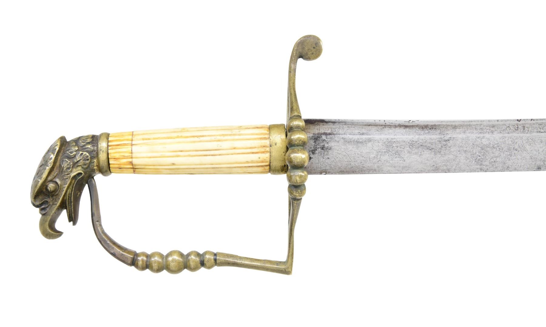 Overall length: 32 3/4". Blade length: 27 1/2". Blade has a single, narrow fuller near the spine and traces of etched decoration. Gilded brass hilt of classic 5-ball design featuring a 5-ball guard with downturned quillon and 5-ball knuckle bow. Well-articulated eagle head pommel above a vertically reeded bone grip. No scabbard. CONDITION: blade has a light gray, cleaned patina with barely visible but discernible etched decoration. The hilt retains no gilding but is undamaged. Grip has an old 1/2" repair at the top. (02-23026/BF). $300-500.