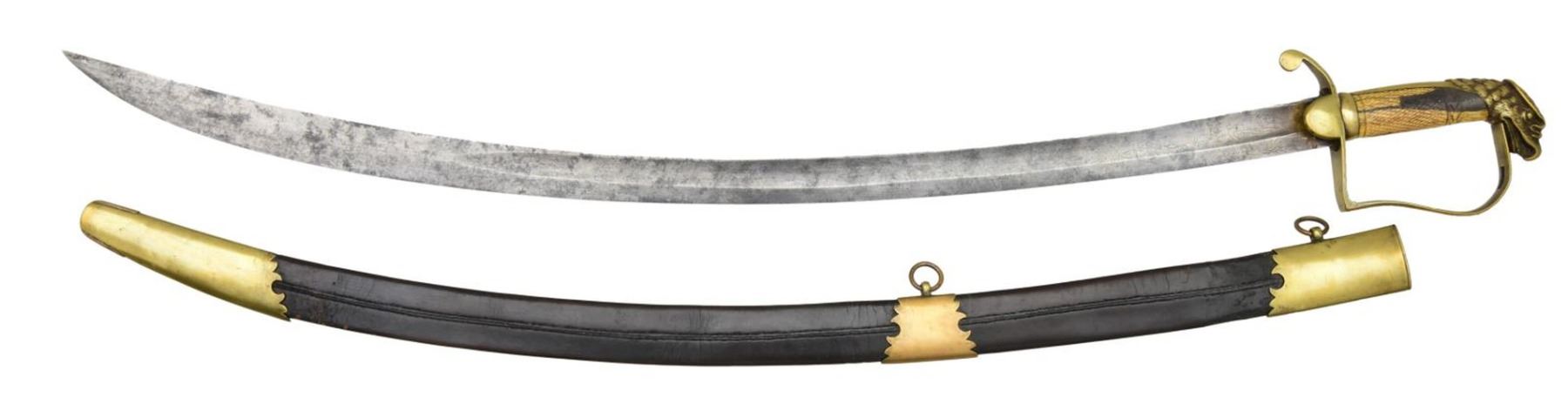 Overall length: 37". Blade length: 30 5/8". Blade has a single wide fuller with vestiges of gold-highlighted etching on a blued field over the first 15 1/2". Etching includes various foliate, military, and patriotic motifs, including sprays of arms. Brass hilt was likely originally gilded. Crossguard, with downturned quillon, and the knuckle bow are quite plain. The backstrap is also plain but leads to a very well-articulated eagle head pommel. Carved bone grip with a 2" section on one side having a dark epoxy repair. Brass-mounted leather scabbard. CONDITION: blade has a dark, mottled patina with only traces of gilding and bluing remaining. Crossguard is slightly bent. Repaired grip. Scabbard remains quite solid with minimal flaking and flexing. PROVENANCE: Lifelong Collection of Robert "Mike" Bricker. (02-22348/BF). $400-600.