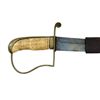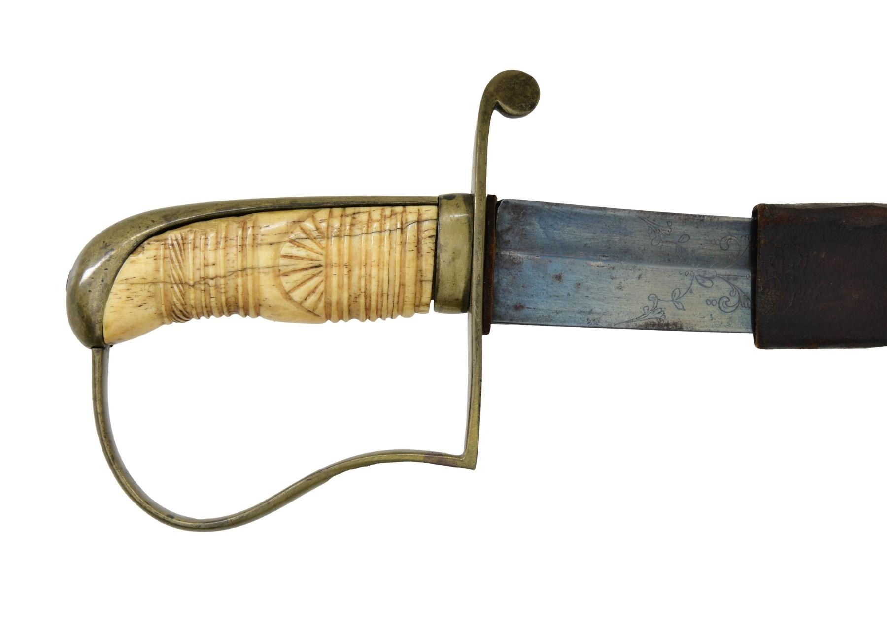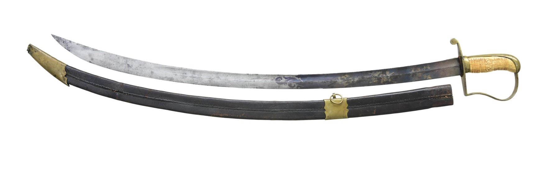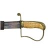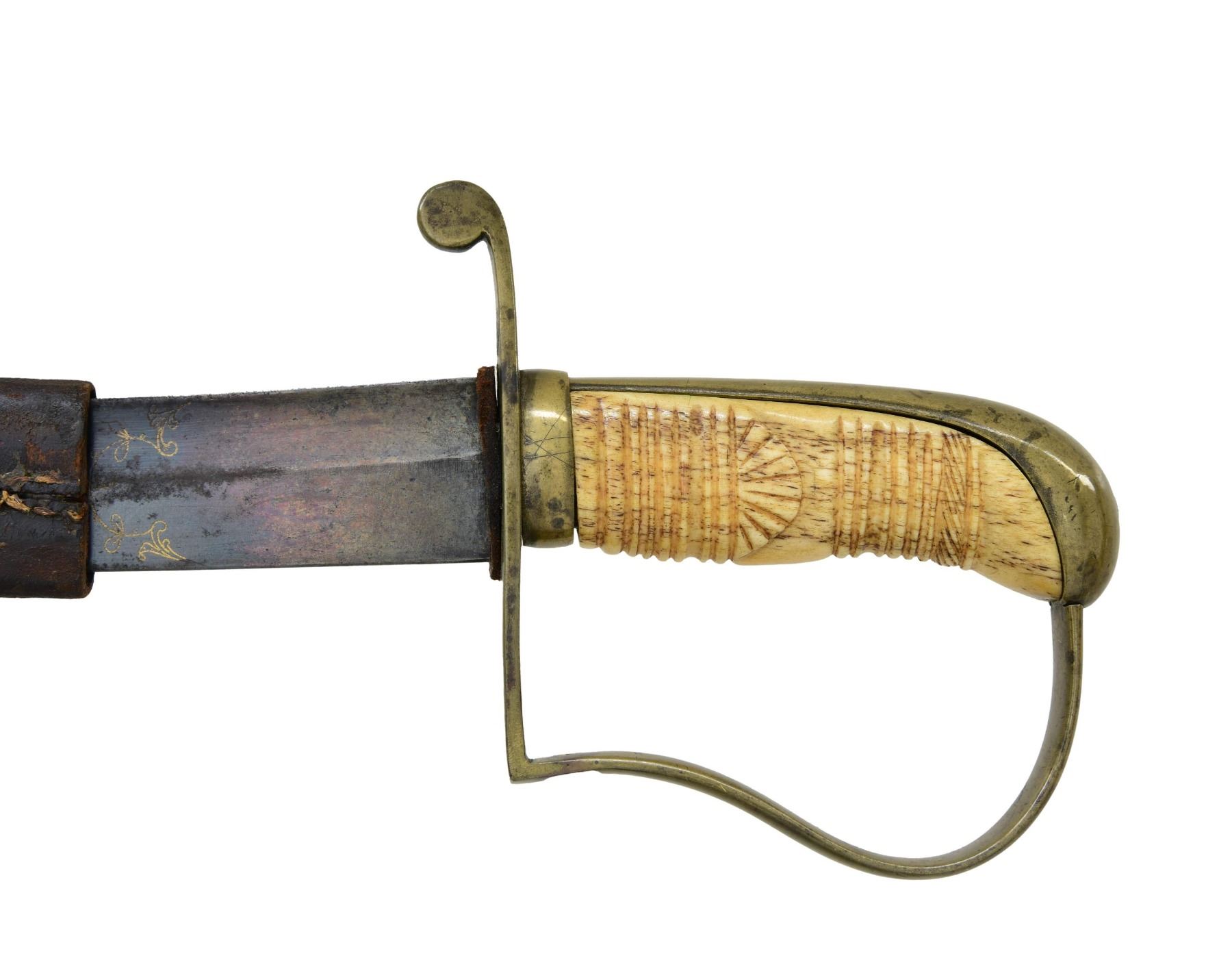 Overall length: 36 1/2". Blade length: 30 1/8". Blade has a single, medium fuller and shows gold-highlighted etching on a blued field. Etching includes foliate, military, and patriotic motifs, including an American shield. Gilded brass hilt featuring a plain guard with a downturned quillon. Plain, reverse P knuckle bow and bird’s head pommel with plain, integral backstrap. Well-carved bone grip. Gilded brass-mounted, leather scabbard missing the top mount. CONDITION: blade has a medium gray patina. Both the blued field and gilded etching are easily discernible. Hilt shows only traces of the original gilded finish. Grip shows expected tight age cracks. Scabbard is quite solid, but the two extant mounts show no original gilding. The brass tip has some damage to the extreme tip. (02-23023/BF). $500-800.