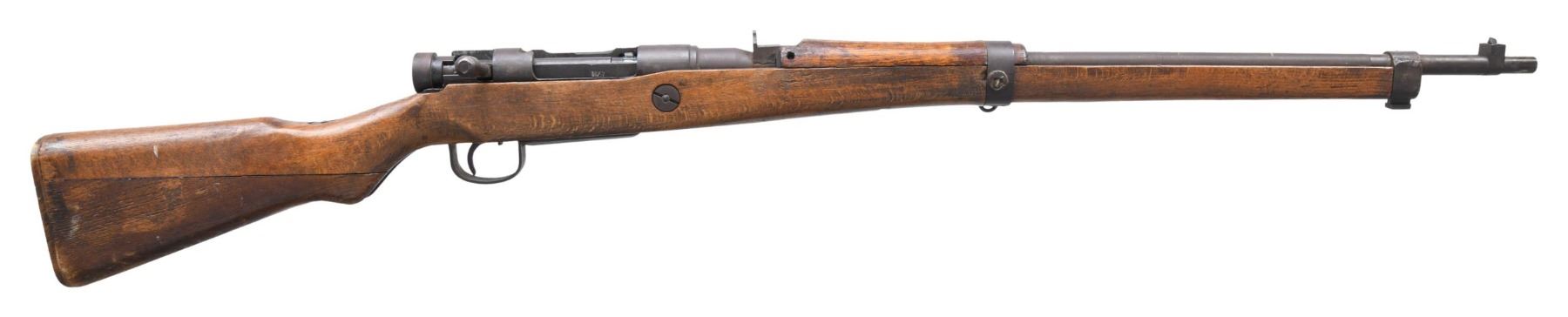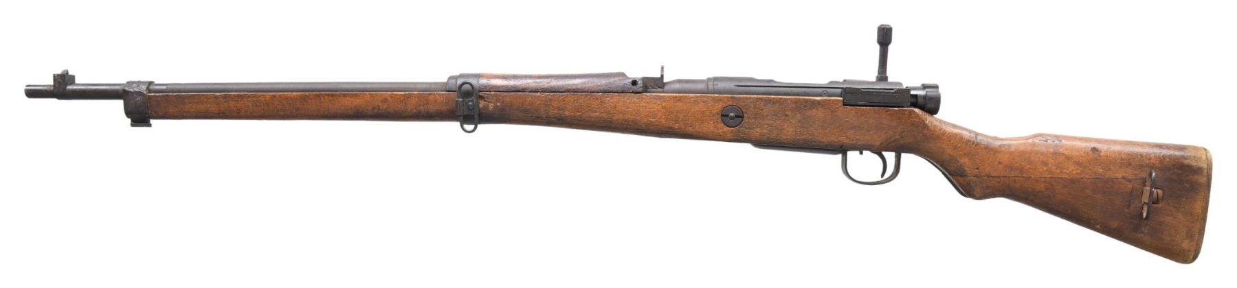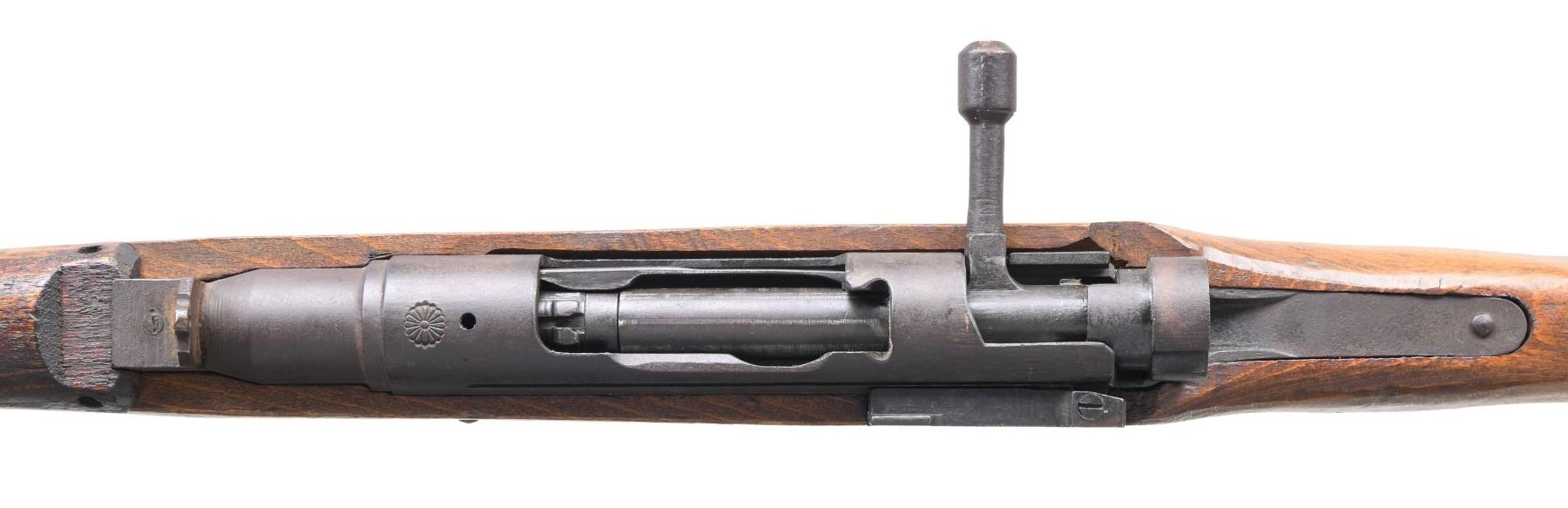 Cal. 7.7 Jap. S# 7126. Bbl. 25 1/2". Blade front sight without protective ears. Fixed aperture rear sight. Bolt parts are mismatched & bayonet lug unnumbered. Late war "Last Ditch" Type 99 rifle. Receiver top has fully intact mum. Left side of receiver has 10th series & Nagoya markings. Late war blued finish. Asian hardwood stock set with two piece butt, separate forend & left side sling swivels. CONDITION: stock show scattered dings, handling marks & some light flaking on butt. Metal is mostly a dull gray color with traces of original blue, some white staining & light oxidation. Action is stiff but functional when hand cycled. Bore shows scattered dried grease & oxidation but evident rifling. (25-2577/MJC). CURIO. $200-300.