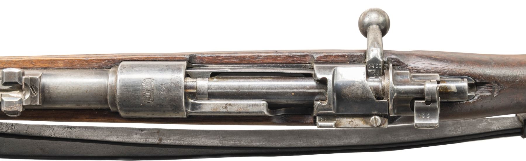 Cal. 8x57 (8mm Mauser). S# 89433. Bbl. 23 5/8". Blade front sight with base slotted for hood but no hood present. Tangent rear sight graduated to 2000m. All visible matching numbers. 1934 production Banner K rifle without any organizational stamps. It is believed these later rifles were used by German police & other agencies. Receiver ring has 1934 date & Mauser Banner. Left side of receiver has BUGN proofs. Walnut stock set with left side sling provisions & leather sling that shows heavy wear. No cleaning rod present. CONDITION; stock set has a cleaned appearance with the name "HIRT" lightly carved on underside of butt, a crack behind upper tang, a small crack at handguard tip, some light chips, dings, moderate abrasions & handling marks. Metal has a silvery-cleaned appearance with scattered oxidation, some light pitting, traces of original bluing, handling marks & some light scratches. Action functions properly when hand cycled. Bore shows some pitting & frosting but good rifling. (25-6167/MJC). CURIO. $700-1,000.