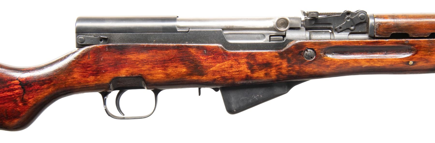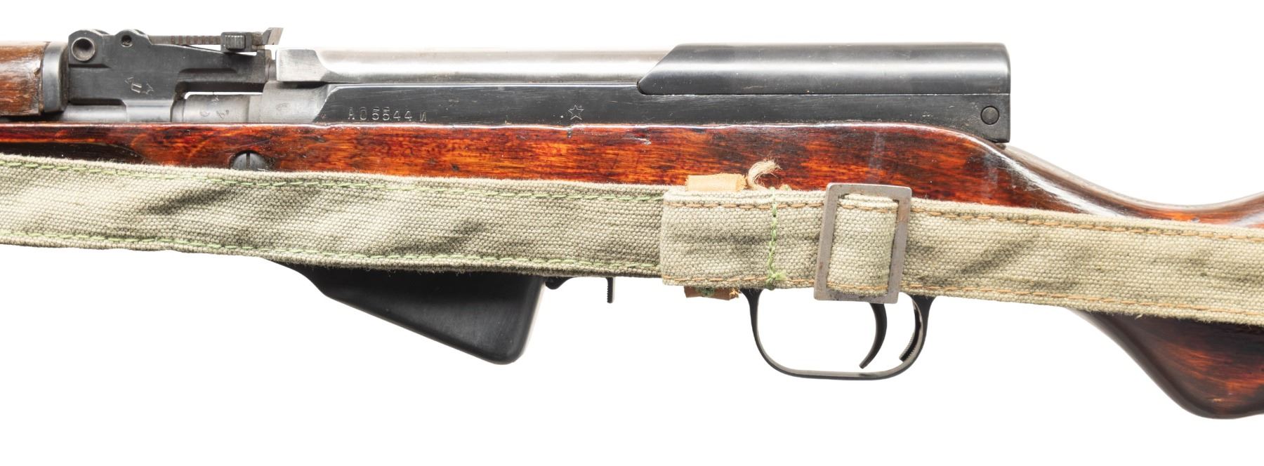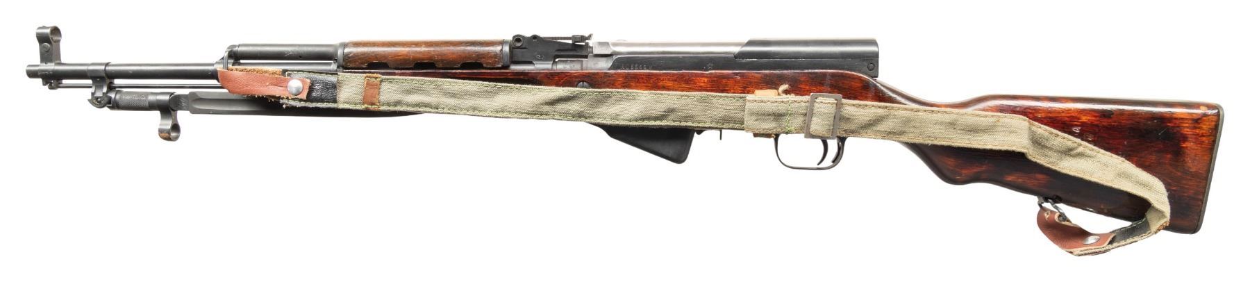 Cal. 7.62x39. S# A05544. Bbl. 20 1/2" with Century import marking. Standard SKS sights. All visible matching numbers with stock being arsenal force matched. Late production Tula SKS without date. Left side of receiver has Tula star. Top cover has boxed arsenal refurb marking. Metal has mix of arsenal rework finishes. Hardwood stock set with faint Tula star on left side of butt, bottom mounted sling swivels & canvas sling. Folding blade bayonet present with enamel finish. Cleaning rod present. CONDITION: stock has thick arsenal rework style finish with scattered flaking, handling marks & dings. Metal retains 90% arsenal rework finishes with scattered handling marks, oxidation, fading & edge wear. Action functions properly when hand cycled. Bright near excellent bore. PROVENANCE: Paul Birkenstamm Collection. (25-6311/MJC). CURIO. $400-600.