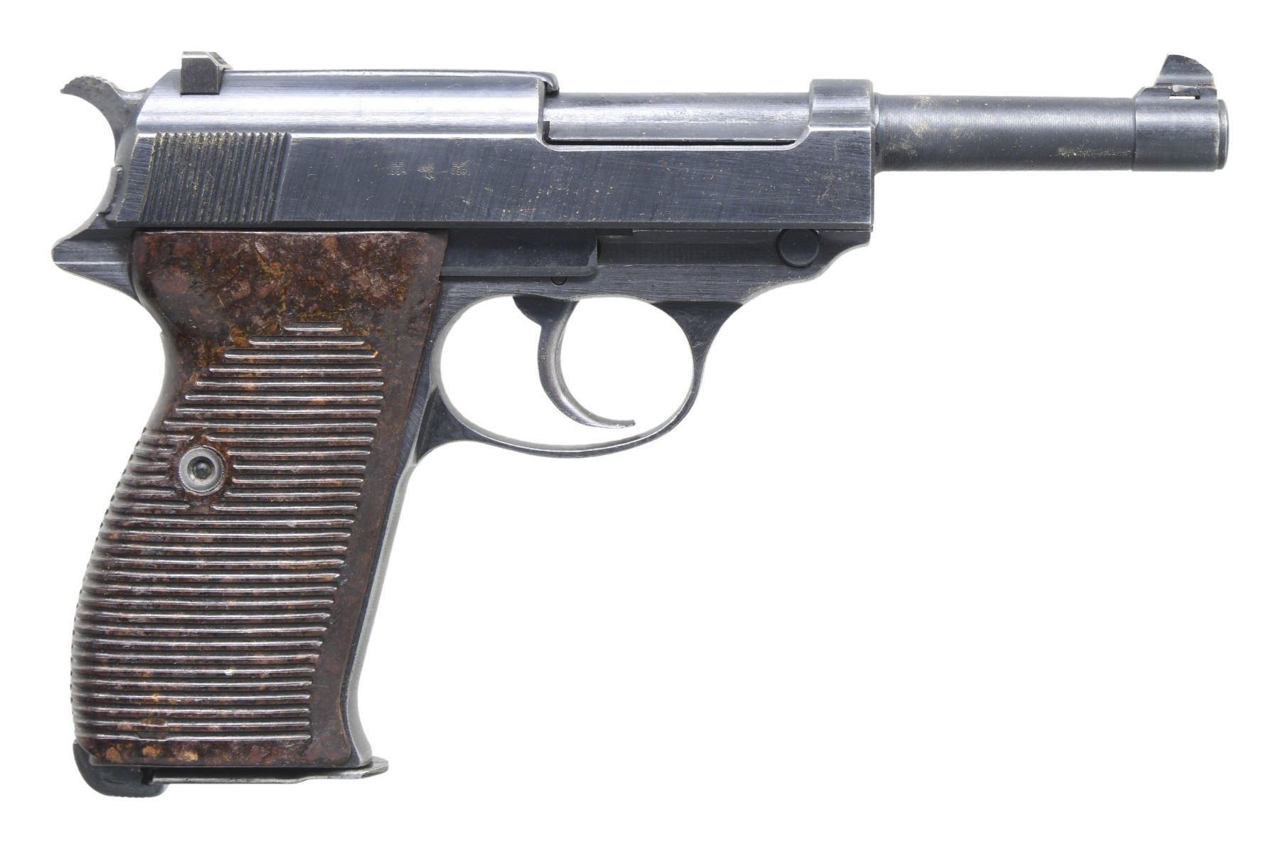 Cal. 9mm Para. S# 6030. Bbl. 5". Blade front sight. Fixed rear sight. All matching numbers. Left side of slide has single line "ac 45" marking denoting 1945 mfr. by Walther. Right side of slide has two eagle "359" inspection stamps. Dull late war blue finish. Grooved brown durofol grips. MAGS: 2-8 rd. One mag marked "jvd" on left side". Other mag marked "WaA706/jvd" on spine & "P38" on left side of body. UNATTACHED ACCESSORIES: leather wartime holster in worn condition with broken strap & some personalized writing. CONDITION: grips show scattered handling marks & light wear. Metal retains 92% late war blue with some edge wear, fading on grip straps & scattered light oxidation. Action functions properly when hand cycled. Very good bright bore. (25-3728/MJC). CURIO. $700-1000.