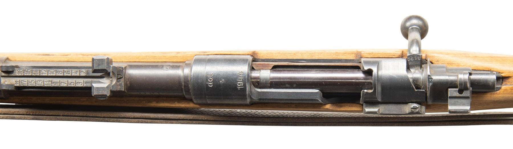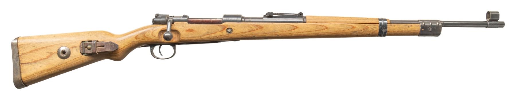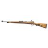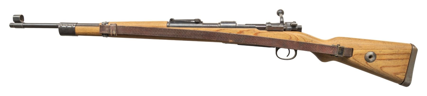 Cal. 8x57 (8mm Mauser). S# 65618. Bbl. 23 1/2". Standard K98k style sights with hooded front. Matching numbers on bolt parts & bbl. Other parts are unnumbered as is-typical for late war rifles. Semi-Kreigsmodell "dot 1944" rifle with stock having a takedown disc but no bayonet lug. Trigger guard & floorplate both marked "byf". Metal has a mix of original & reblue finish. Laminated stock set with faint eagle "H" on right side of butt, left side sling provisions & leather 98k style sling. CONDITION: sanded stock set shows some light laminate separations on butt, scattered handling marks & dings. Bottom metal & rear band retain 90% reblue with scattered edge wear & oxidation. Balance of metal retains 75% original blue with scattered edge wear, handling marks & oxidation. Action functions properly when hand cycled. Near excellent bright bore. (25-6186/MJC). CURIO. $700-1,000.