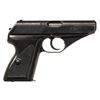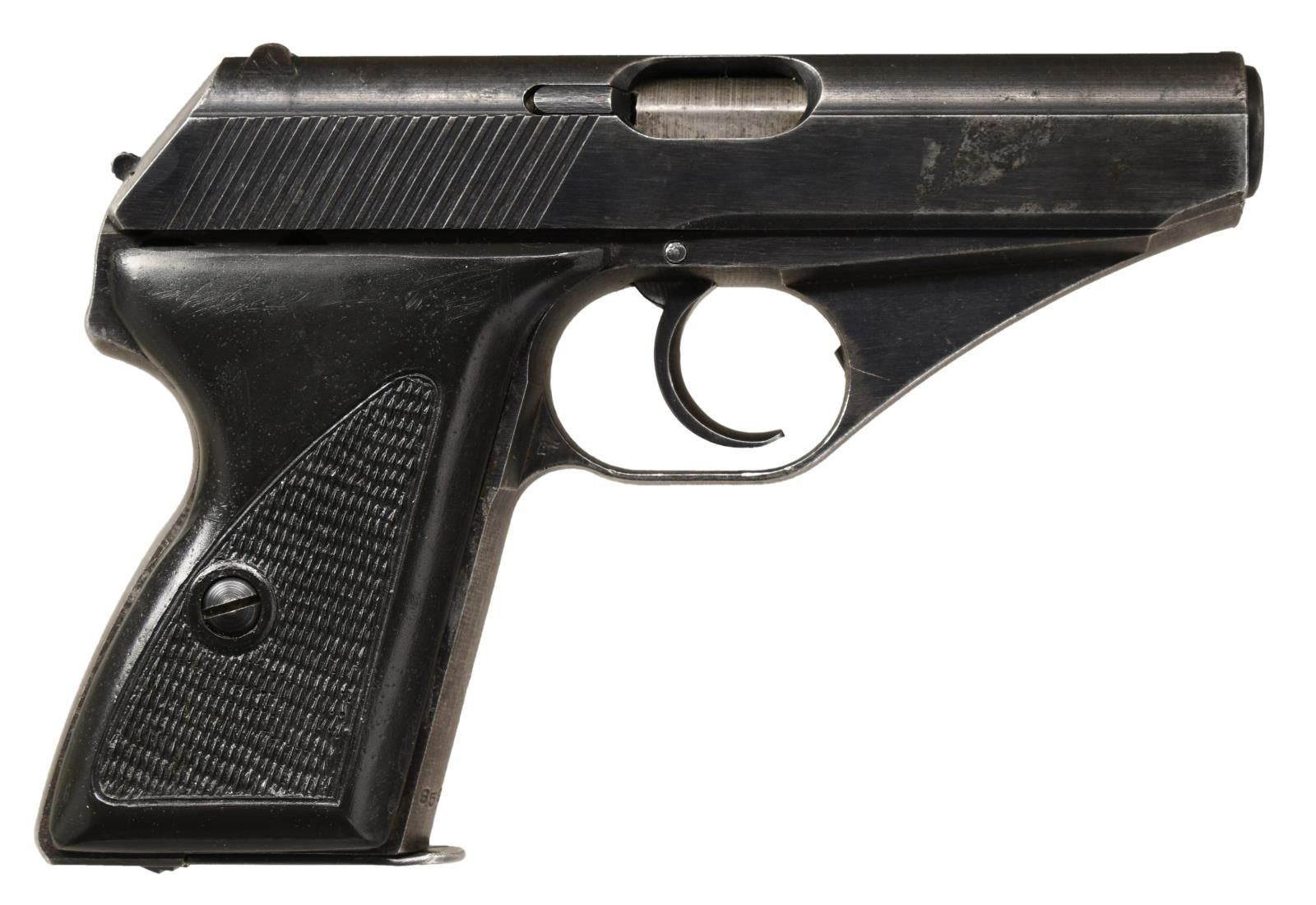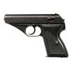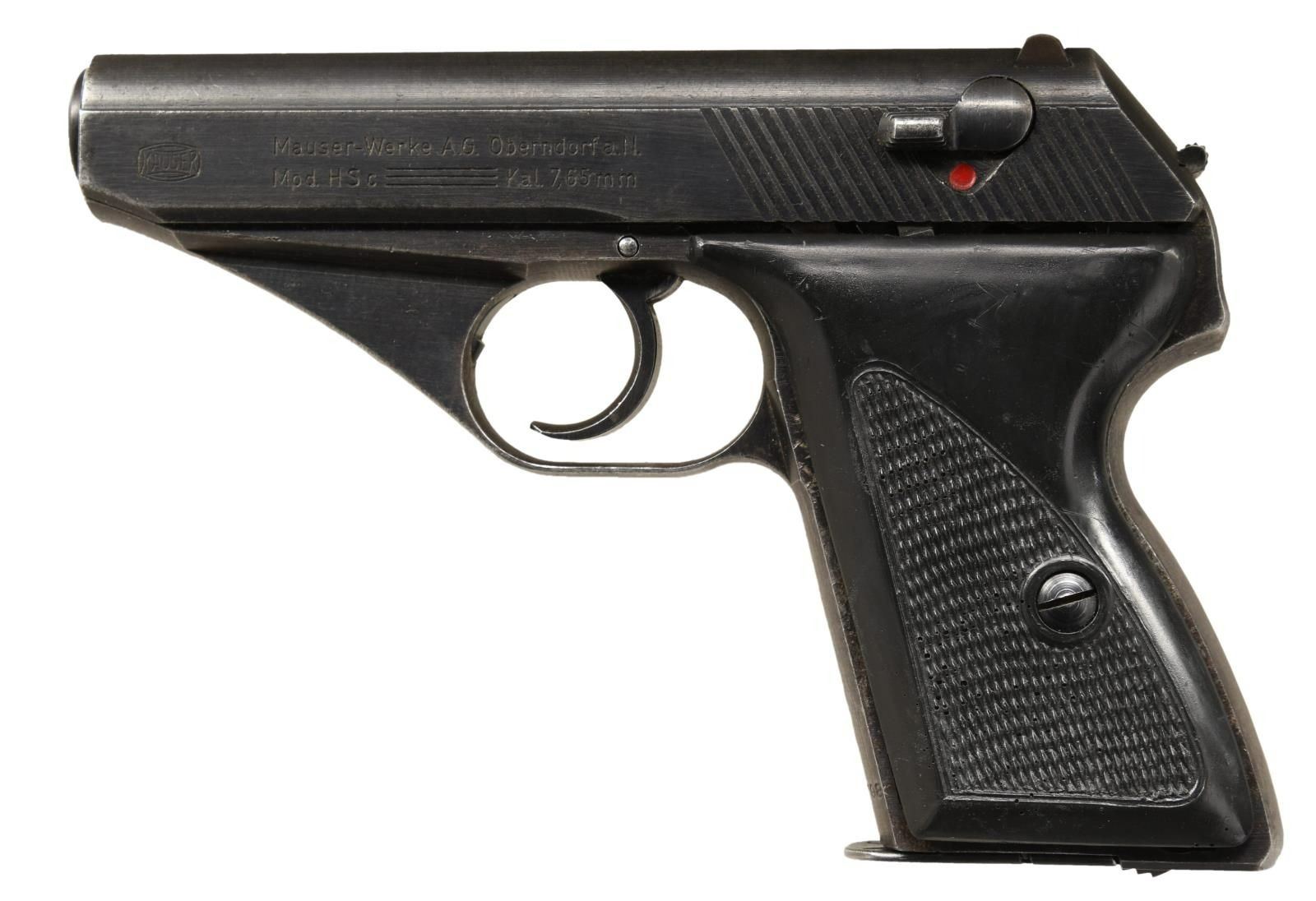 SEMI-AUTOMATIC PISTOL. Cal. 7.65mm. S# 859798. Bbl. 3 1/4". Model HSc semi-automatic pistol mfg. by Mauser during late World War II for commercial sales. The left side of the slide is marked with the Mauser banner logo, followed by Mauser's mfg. information above the model and cal. designations, which are separated by 3 horizontal lines. Right side of frame exhibits an Eagle/N commercial nitro proof on the rear trigger web. Metal components exhibit a blued finish. Frame is mounted with 2-piece checkered black plastic aftermarket grips. All numbers are matching and include the frame, slide, and bbl. MAGS: 1-8rd. CONDITION: metal components retain large amounts of their original factory blue finish, exhibiting wear and thinning overall, with scattered spots of light surface oxidation and a few areas of pitting. Very bright bore, exhibiting good rifling throughout. Grips show scattered marks from handling and storage, but otherwise remain sturdy and serviceable. (23-6233/MLW). CURIO. $300-400.
