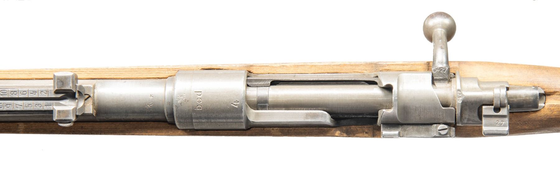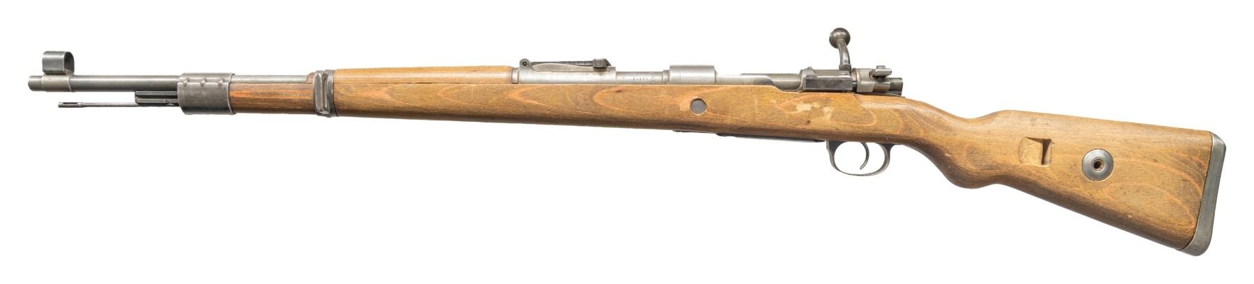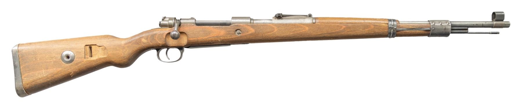 Cal. 8x57 (8mm Mauser). S# 30427. Bbl. 23 1/2". Standard K98k style sights with hooded front. Matching numbers on bbl. & bolt parts. Trigger guard & forward action screw are numbered differently. Balance of other parts are unnumbered. BCD 4 coded receiver. Blued bottom metal. Balance of other parts have phosphate finish. Laminated stock set with left side sling provisions. Right side of butt has faint eagle "H" cartouche & underside has proper "C" marking. Cleaning rod present. CONDITION: butt shows a couple long laminate cracks on top & bottom, stock set otherwise shows a few other laminate cracks, some light chipping at toe, scattered dings, finish loss, handling marks & wear. Metal retains 50% phosphate with cleaned areas, scattered thinning, edge wear, fading & oxidation. Action functions properly when hand cycled. Bright near excellent bore. (25-6182/MJC). CURIO. $800-1,200.