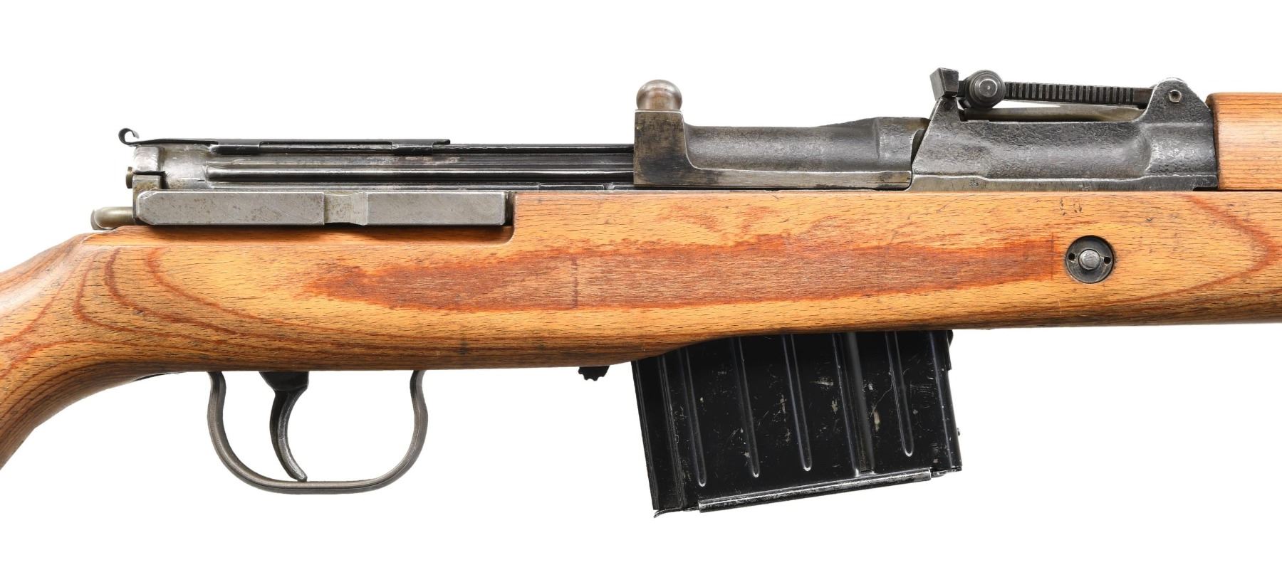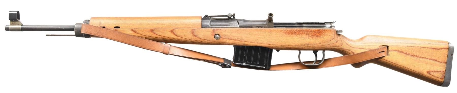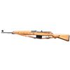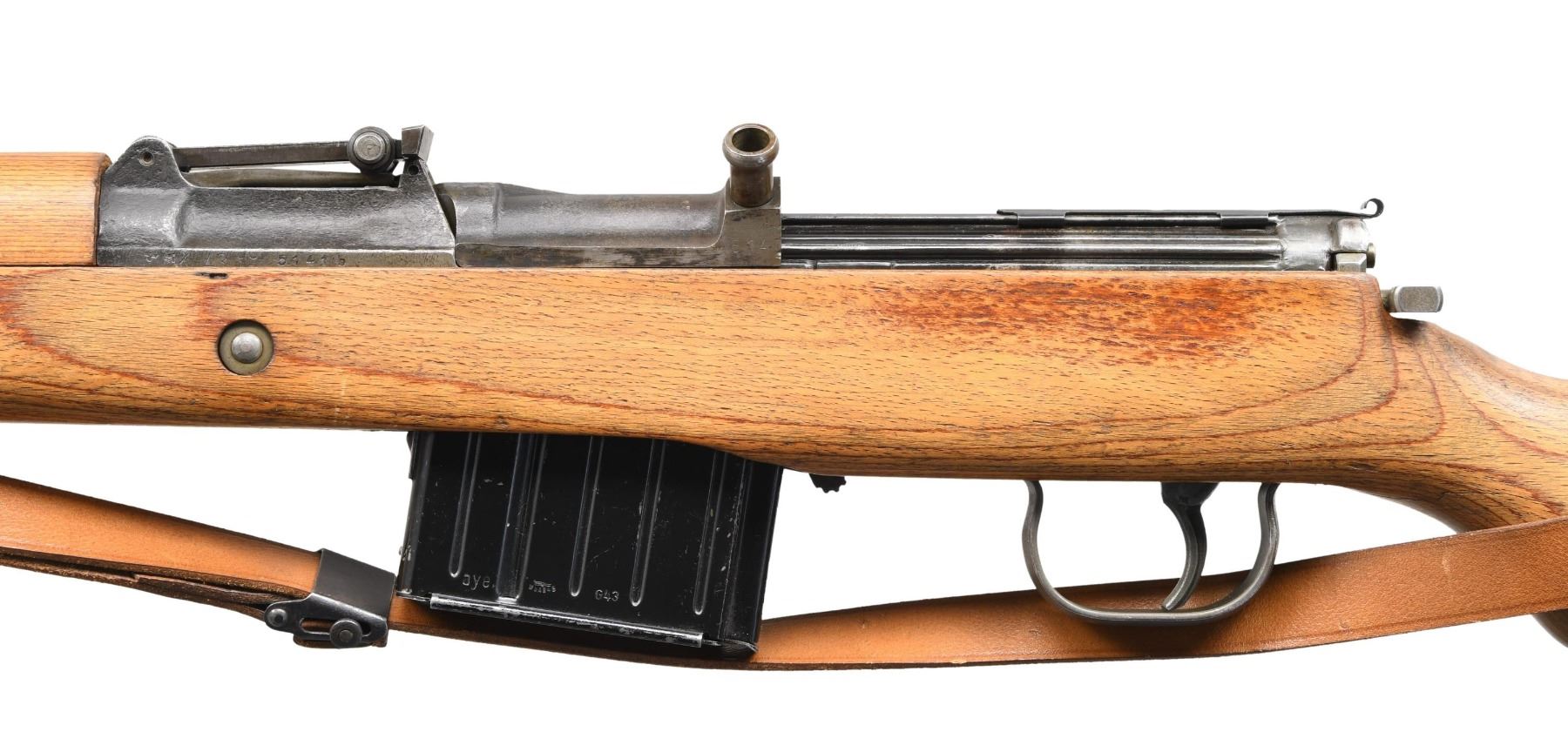 Cal. 8mm Mauser. S# 5141b. Bbl. 23 1/4". Blade front sight with hood. Tangent rear sight graduated to 1200m. Left side of rear sight base has "K43" & "ac 45" markings. Stamp matching numbers on bolt, rear sight base & bolt carrier. Electropencil matching numbers on both locking lug & firing pin housing. Phosphate & blued finish. Laminated stock set with faint inspection stamp on underside of wrist. Left side sling provisions with repro sling. Cleaning rod present. MAGS: 1-10 rd. coded "aye". CONDITION: stock appears cleaned with a 2" crack on left side of wrist, a 2" crack on top of wrist, a few dings & some handling marks. Metal retains 50% phosphate & blued with some pitting flaws, scattered thinning, fading, edge wear & light oxidation. Action appears to function properly when hand cycled. Very good bright bore. PROVENANCE: From the Collection of Mark Ivey Godfrey. (24-5253/MJC). CURIO. $2500-3500.