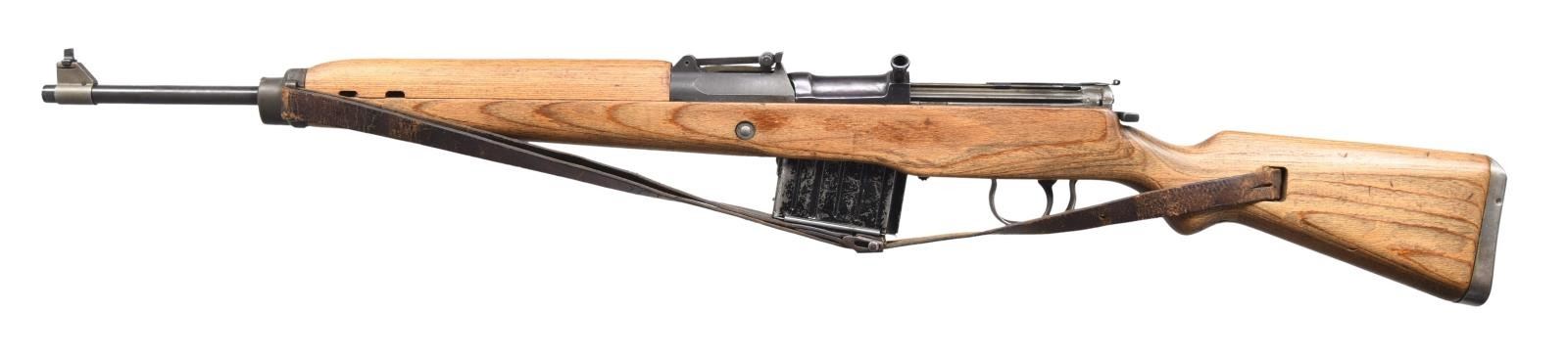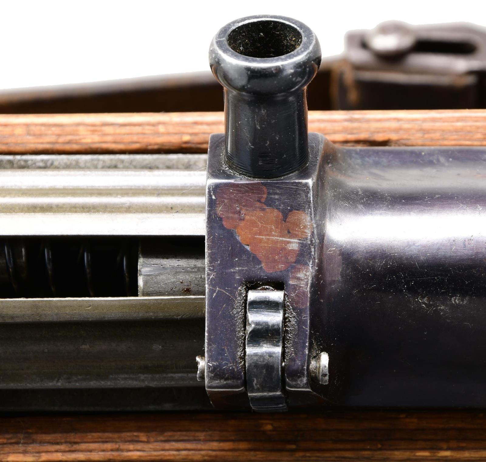 Cal. 8mm Mauser. S# 616d. Bbl. 21 3/4". Blade front sight. Tangent rear sight graduated to 1200m. Bolt has takedown latch, reblue finish & appears unnumbered. Left side of receiver has "ac45 G43" markings & serial. It is worth noting most guns in this serial ranger are marked "K.43" rather than "G43". Balance of metal has phosphate finish. Laminated stock is correctly unnumbered & has a faint Waffenamt on the toeline that appears to be "WaA359" for Walther. Leather K98k style sling present. No front sight hood & cleaning rod present. MAGS: 1-10 rd. detachable marked "aye WaA843 & K43". CONDITION: stock set appears lightly sanded w/ a laminate crack at toe, a couple laminate cracks on handguard, some scattered dings & handling marks. Bolt carrier retains 90% reblue w/ what appears to be a weld repair near latch, some pitting beneath finish, thinning & oxidation. Balance of metal retains 75% blue & original phosphate w/ scattered thinning, fading & edge wear. Bbl. band shows some chipping at top front. Good bore that is bright for much of its length but has a couple patches of light pitting. (24-1653/MJC). CURIO. $2750-3750.