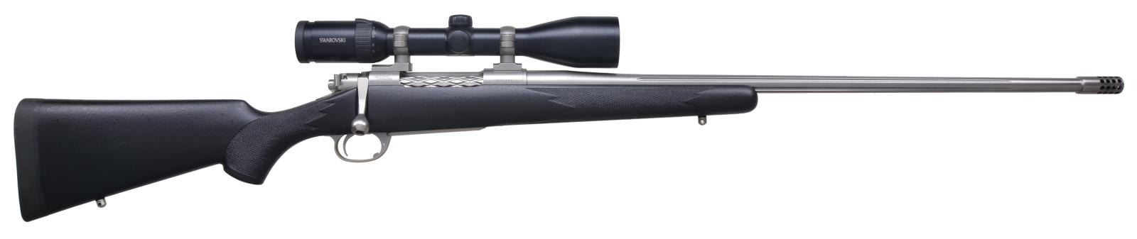 Ca. 8.59 Titan. S# L2005126. Bbl. 27 1/2" of Match Grade fluted stainless steel with ported muzzle brake. Stainless steel construction. Features include diamond jeweled bolt, 3 position safety, Jewel competition trigger and hinged floorplate. Swarovski Z6 2-12X50 matte finished scope with fine duplex reticle on 2 piece stainless mounts. Slimline straight comb cheekpiece stock with swivel bases. LOP: 13 3/4" over solid black Limbsaver pad. Weight with scope: 8 lbs., 13.2 oz. Lazzeroni is known for their proprietary cartridges that are extremely effective at long ranges. CONDITION: near new retaining nearly all finish. Bright near excellent bore. Scope has bright optics. (22-3012/DS). MODERN. $4,000-6,000.