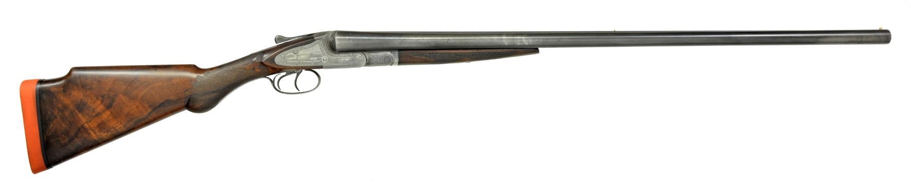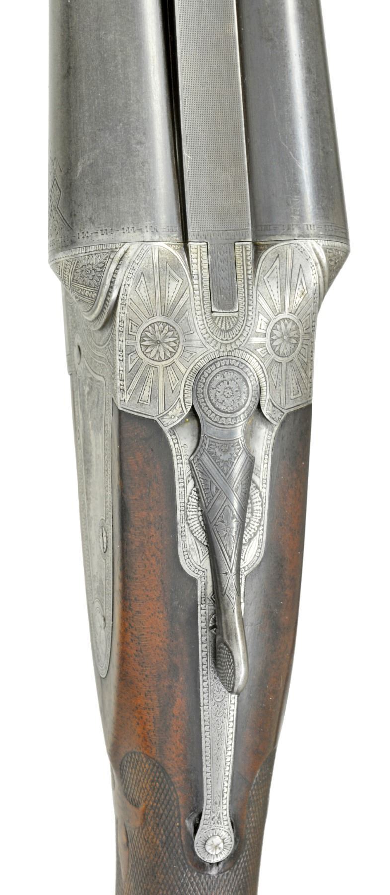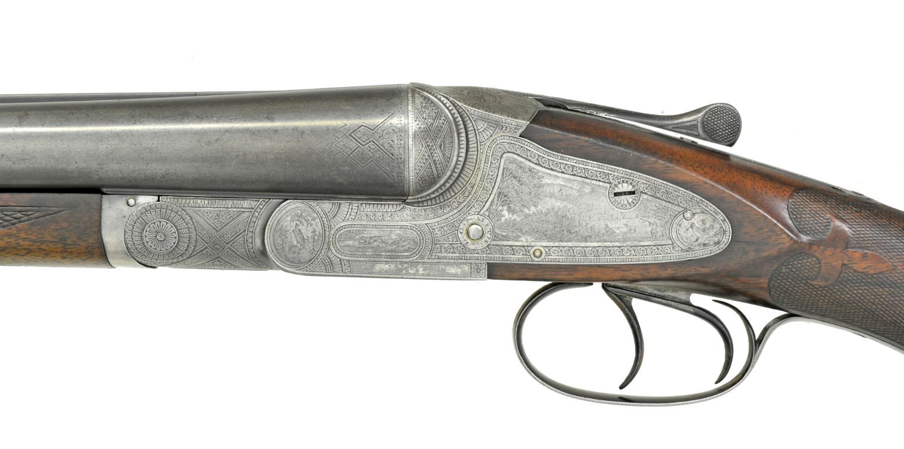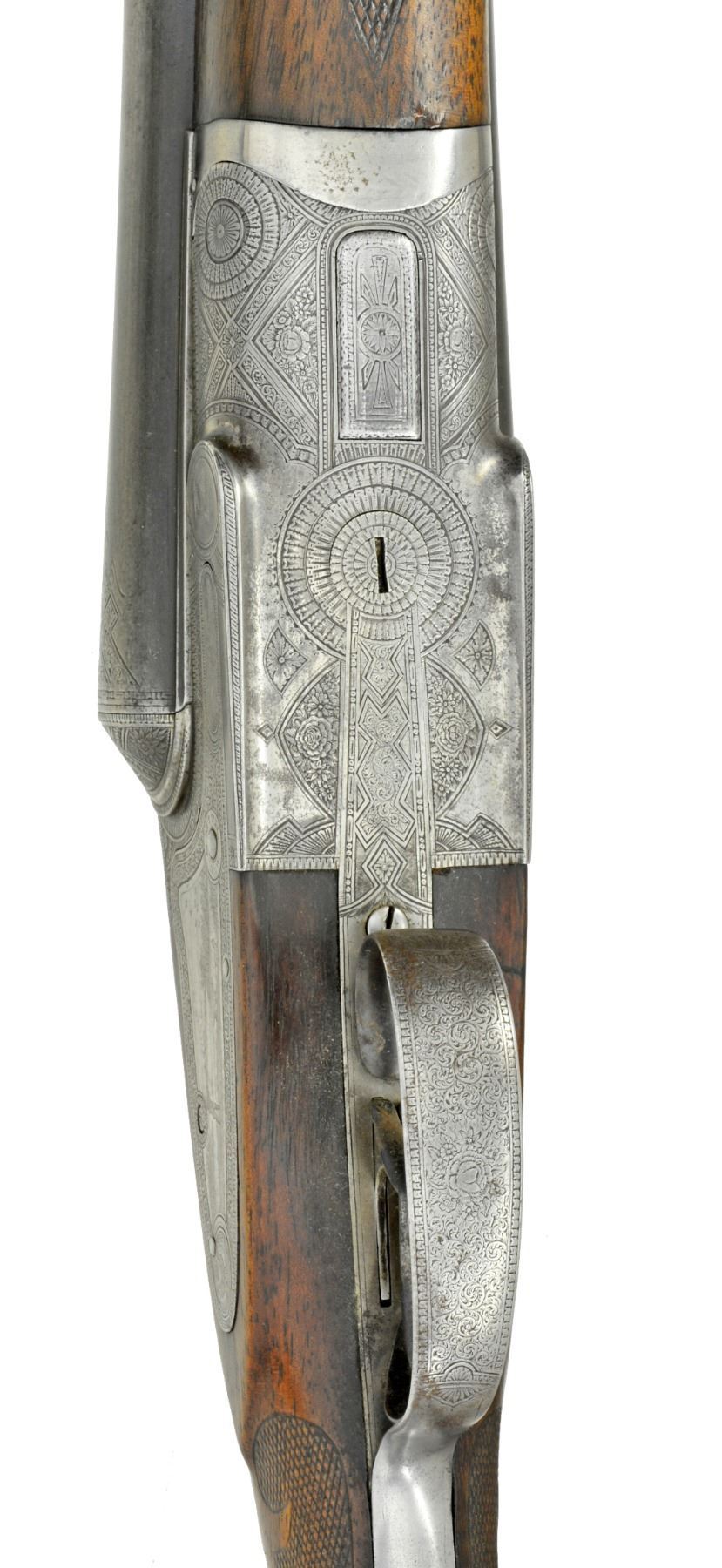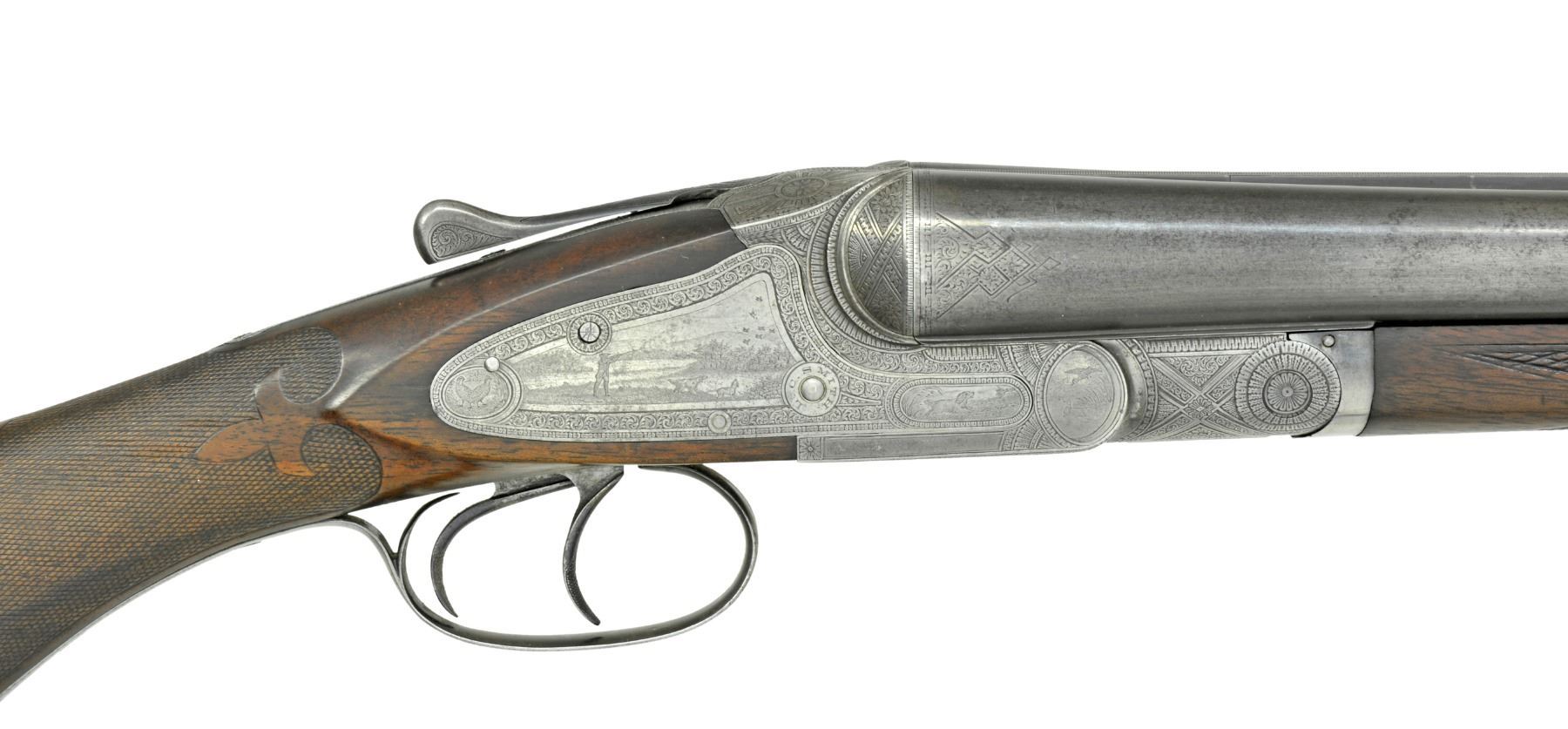 Cal. 12 Ga. S# 984. Bbls. 30" of Sir Joseph Whitworth Fluid Compressed Steel. The A2 Ejector Gun was the 2nd highest grade of LC Smith shotgun produced by Hunter Arms Company prior to 1913. The LC Smith Production Records by James Stubendieck states that only 213 A-2 Grade guns were mfg. 1891-1916. He further states that "Because of the elaborate engraving, the A-2 is highly sought by the LC Smith collector". Sidelock action w/ special order engraving showing hunting scenes on lock w/ vignettes of quail, hunting dog chasing woodcock & mallards on right side, left side has vignettes of woodcock, hunting dogs & partridge. Scenes & vignettes are surrounded by fancy borders, arabesque scroll, geometric designs w/ rose & scroll engraving on upper & lower areas of action & trigger guard bow. Action is made w/out safety having dbl. triggers & selective ejectors. Bottom of bbls. is stamped "A2". Monte Carlo half pistol grip stock of finely grained Circassian walnut w/ elaborate segmented fleur-de-lis hand checkering. Splinter forearm is of post 1913 vintage replacement marked "FIELD" w/ added number to match the gun. LOP: 14 5/8" over added London style solid red pad. DAC: 1 13/16". DAMC: 2". DAH: 2 7/8". Stock is cast off. Bbls. have front & mid beads. Chambers & forcing cones are lengthened. WEIGHT: 8 lbs., 0.1 oz. Bore diameters: right - .728 , left - .730 Choke constrictions: right - .032, left - .013. Minimum wall thickness: Right bbl: .029 at 8-1/2" from muzzle. Left bbl: .030 at 11" from muzzle. UNATTACHED ACCESSORIES: 2 Marlin Firearms Company letters from the Cody Firearms Museum. 1 Letter states the following: "The statistical data for L.C. Smith Shotgun, serial number 984, as extracted from original L.C. Smith Company records housed in the museum, are as follows: A2 Grade / 12 gauge / 30-inch barrels / 7 pounds, 12 ounces / 14 1/4" x 1 1/2" x 2 1/4" / Ordered on February 22, 1893 / Shipped on September 30, 1893 / Sold to H. McM. Ex c/o Von Lengerke & Antoine / Extra set of barrels, A2, 12 gauge, 30-inches, 14" x 2 1/4"pg. 38 ordered March 1 1894 / Shipped to Von Lengerke & Antoine on March 1, 1894.". The 2nd letter states the following: "A2 Grade / 12 gauge / 30-inch / shipped from the company 1892". CONDITION: bbls. retain 40% dull blue w/ fading in carry areas showing spots of freckling, light pitting & scratches. Action finish has faded to mottled silver gray. Stock has moderately worn finish & checkering showing dents & handling marks w/ sm. chips & cracks behind locks & top tang. Replacement forearm has moderate finish & checkering wear w/ chips at iron. Action is off face w/ bbls. loose on frame. Bores are generally bright. Bbls produce a dull tone indicating looseness. (01-17418/DS). ANTIQUE. $4,000-6,000.