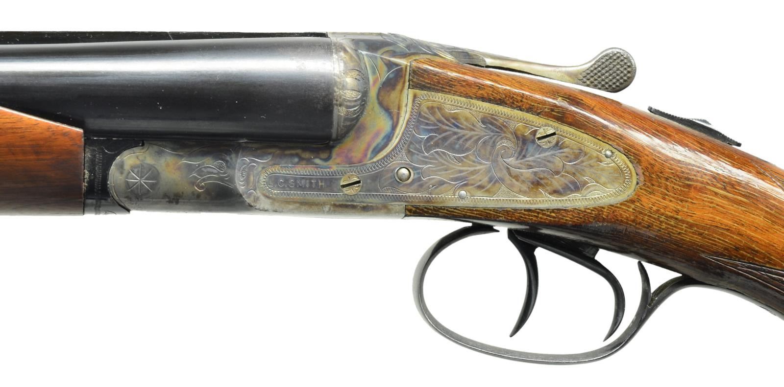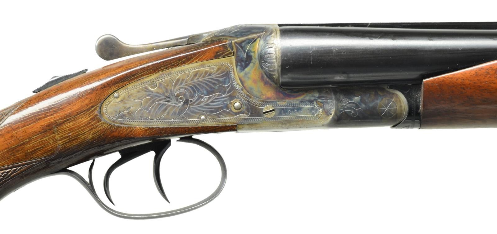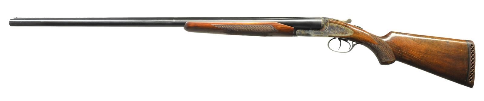 Cal. 12 Ga., 2 3/4". S# FWS4521. Bbls. 30" of London Steel w/ fixed mod. & full chokes. Brass bead. Case colored sidelock action w/ open floral pattern engraving. Dbl. triggers. Extractors. Aftermarket beavertail walnut forearm w/ point pattern hand checkering. Original hard rubber capped pistol grip walnut stock w/ hand checkering. LOP: 14 3/8" over an aftermarket Kagen's brown ventilated pad. DAC: 1 1/2". DAH: 2 1/2". Neutral cast. WEIGHT: 7 lbs., 10.5 oz. Mfg. 1946. CONDITION: over 90% bbl. blue showing sm. spots of wear & freckling. Action retains over 90% bright case colors showing light carry wear & spots of corrosion. Original stock finish shows age related checkering w/ scattered scratches & marks. Forearm has good custom finish w/ a crack extending from forearm iron into the checkering area. Action is tight w/ top lever sitting just barely left of center. Nice bright bores. (21-4580/DS). CURIO. $1,500-2,200.