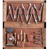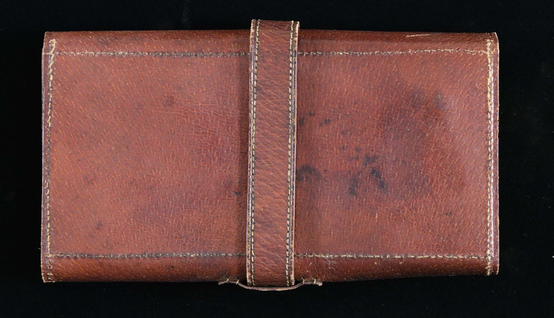 Brown leather pouch appears unmarked. Pouch contains 2 sections. One section has 6 spare mainsprings of 2 different sizes. Other sections has 3 spare sears, 3 pouches, spare springs & takedown tool. CONDITION: parts appear in near excellent condition. Pouch in good intact condition with wear & stains. PROVENANCE: from the renowned collection of quality sporting arms from Lewis Drake together with inventory of Lewis Drake Associates. (02-23534/MD). $300-400.
