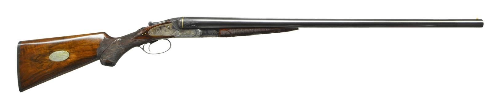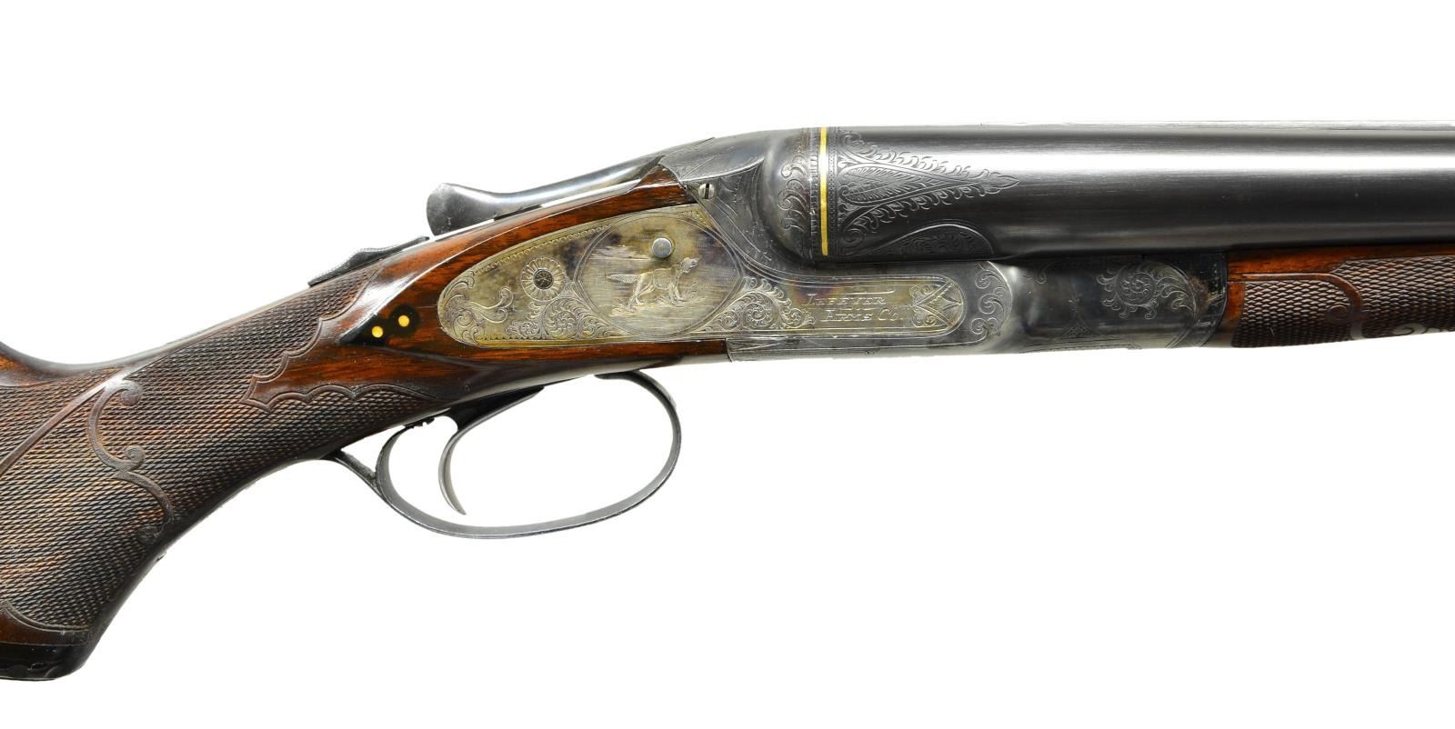 PRESENTATION SHOTGUN. Cal. 12 Ga. 2 3/4". S# 37969. This gun appears to be an Ithaca put together gun with later addition of presentation info and some upgrade work. The 28" barrels with flat matted rib having gold pigeon inlaid on extension base, are engraved "Lefever Arms Co Krupp Fluid Steel" and "Presented to William Wagner 1902" on tops. Breech ends of barrels are decorated with an inlaid gold band, 2" triangles of acanthus scroll, and incised cyma curved flourish in the style of that found on Lefevers grade E and above. Bottoms of barrels are stamped with S# and additional number "53601". Case hardened ejector action with late type cocking hook, is fitted with non automatic safety and "Infallible" single trigger, with selector on left side of top tang. Action is engraved with flourishes of scroll, geometric borders, and single dog in oval on each lockplate; a pointer on left, setter on right (as is most usually found on guns of E grade). Lightly streaked European walnut capped pistol grip buttstock measures 13 1/4" over Lefever hard rubber buttplate. There are white dot inlaid horn "clock hand" drop points behind each lockplate. Grip is checkered in Optimus style with crenelated borders and ribbons through pattern. Removal of grip cap reveals grade marking "B". A silver plated oval on right side of butt is engraved "Presented to" "William Wagner" "High Constable" "CHICAGO, IL 1902". Matching splinter forend has friction release. Bore diameter: L .729". R .729". Bore restrictions: L .005" (IC). R .005" (IC). Wall thickness: L .042". R .039". DAH: 2 5/8". DAC: 1 9/16". LOP: 13 1/4". Weight: 7 lbs. 7 oz. CONDITION: very fine, as refurbished and augmented. Metal parts retain nearly all good quality blue and recolor. Buttstock retains a considerable amount of what appears to be its original finish with some oil rubbed in. Checkering is as new, still light in color. The presentation plaque on stock appears to have been added along with new engraving and gold inlay on barrels. Forend wood matches well. (22-5602/MGM). CURIO. $3,000-5,000.