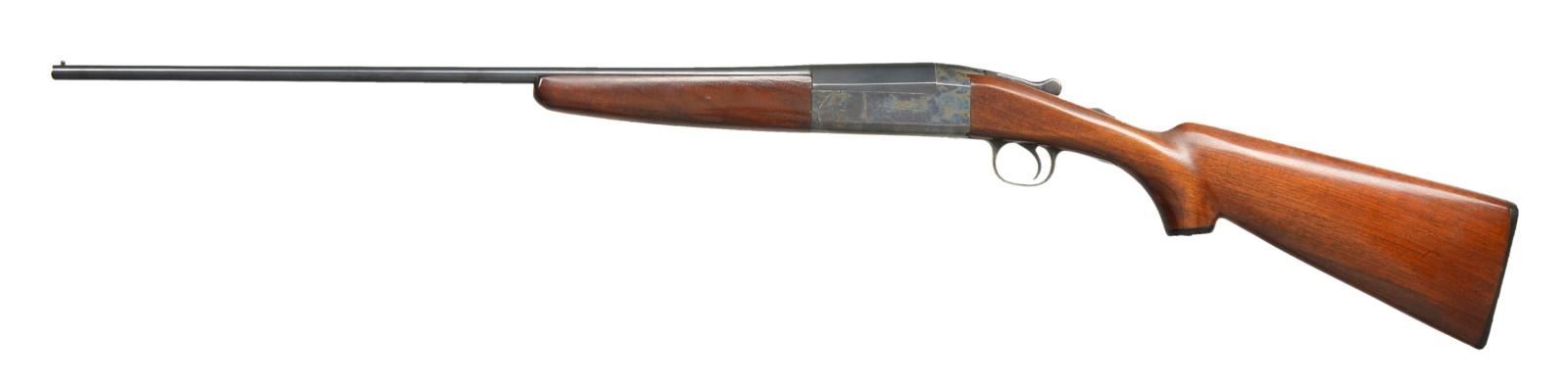 Cal. 410, 3". S# 9573. The 26" bbl. has brass bead & full choke. Hammerless top lever action w/ automatic trigger & ejector. Walnut stock set w/ grip cap. LOP: 14.5" to buttplate. Discontinued 1942. CONDITION: Very good reblued bbl. finish over light pitting. Very good case colors on receiver w/ marks to pivot pin. Sanded & refinished wood has very good finish. Very good shiny bore. (22-5605/MD). CURIO. $400-600.