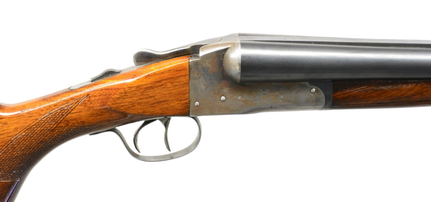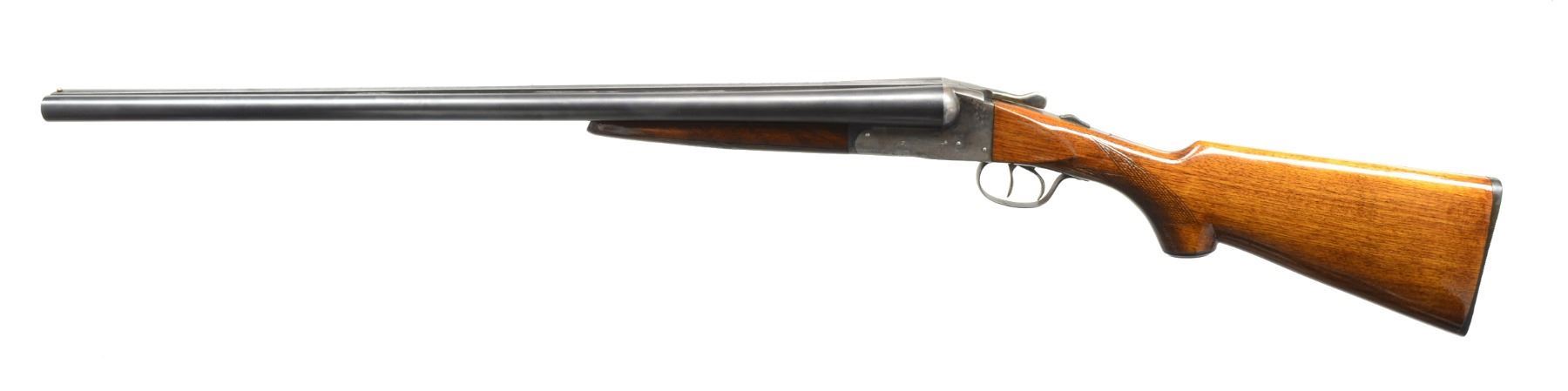 Cal. 12 Ga., 2 3/4". S# 294192. Bbls. 24", marked w/ model & Lefever Ithaca address on tops. Bbl. flats stamped w/ S# & choke markings "0" & "2" (cyl & mod). Casehardened action marked w/ flying goose on each side, features automatic safety & dbl. triggers. Plain American walnut capped pistol grip stock measures 14 1/8" over ribbed hard rubber buttplate. Matching splinter forend has friction release. Bore diameters: left - .731, restriction: .027 (mod), right - .730, restriction: .000 (cyl). Minimum wall thickness: left - .030, right - .031. DAH: 3 1/8". DAC: 1 7/8". WEIGHT: 6 lbs. 13 oz. CONDITION: fine as partially refinished. Bbls. have over 90% original blue. Action has about 50% case color. Stocks refinished & shiny. Checkering lightly worn. Bright shiny bores. Action is tight. (20-871/MGM128). CURIO. $250-450.
