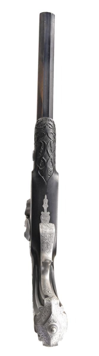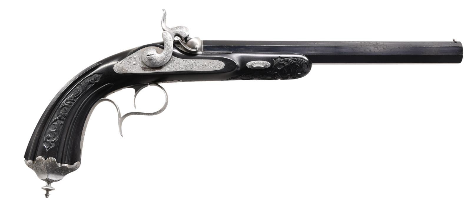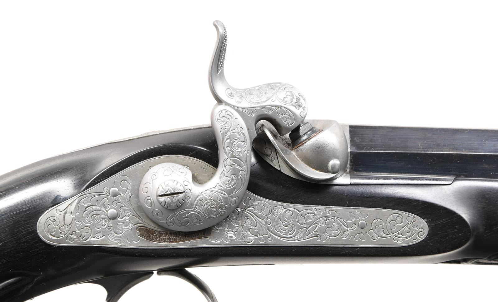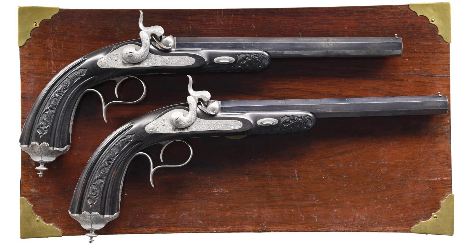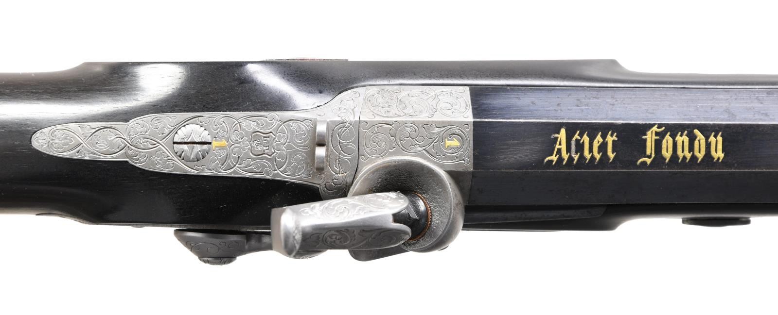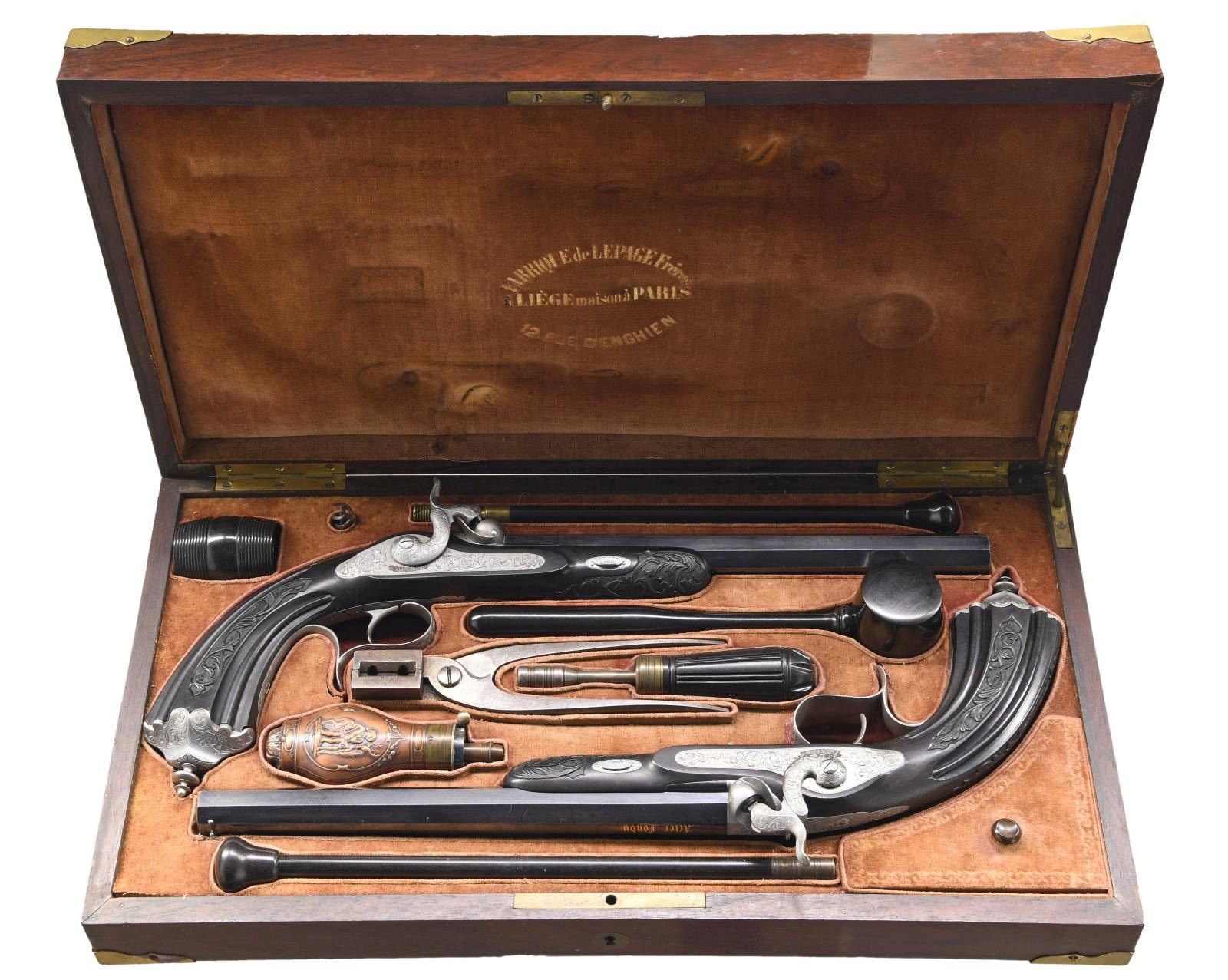 Cal. 50. NSN. Bbls. 10" octagon. Bead front sights & fixed V notch rear sights. Top flats are gold marked "Acier Fondu". Breech end of bbls. & top tangs are marked in gold "1" or "2". Island locks. Locks, hammers, breech plug, top tangs, ornate butt caps & fancy finial trigger guards have generous coverage of vine type foliate scroll hand engraving. Bbls. have finely polished blue finish. Other metal parts have French Gray finish. Wedge fastened ebony stocks w/ deeply fluted grip sections. Flats of grip section & forearm tips have deep relief foliate carving. Overall length is 15 1/2". WEIGHT: 2 lbs, 3 oz. UNATTACHED ACCESSORIES: original wood casing w/ brass trim. Inside lid is marked "FABRIQUE de LEPAGE Feres. / LIEGE miason a Paris / 12, RUE D'ENGHIEN". Red cloth cover fitted interior. Ebony accessories include cleaning rod, ramrod, mallet, rd ball box & ebony handled nipple wrench. Also included is 2 cavity bullet mold, powder flask, cap tin, glass oil bottle & retailer tag. Case interior has largely faded from red to beige. CONDITION: both pistols retain over 90% bbl. blue showing light edge wear w/ scattered spots of freckling. Other metal parts retain a very good French Gray finish. Ebony stocks are in near excellent condition. Sound locks. Bores retain strong rifling showing a slightly frosted appearance. PROVENANCE: The Collection of Edward Scott Meadows. (01-24709/DS). ANTIQUE. $5,000-8,000.