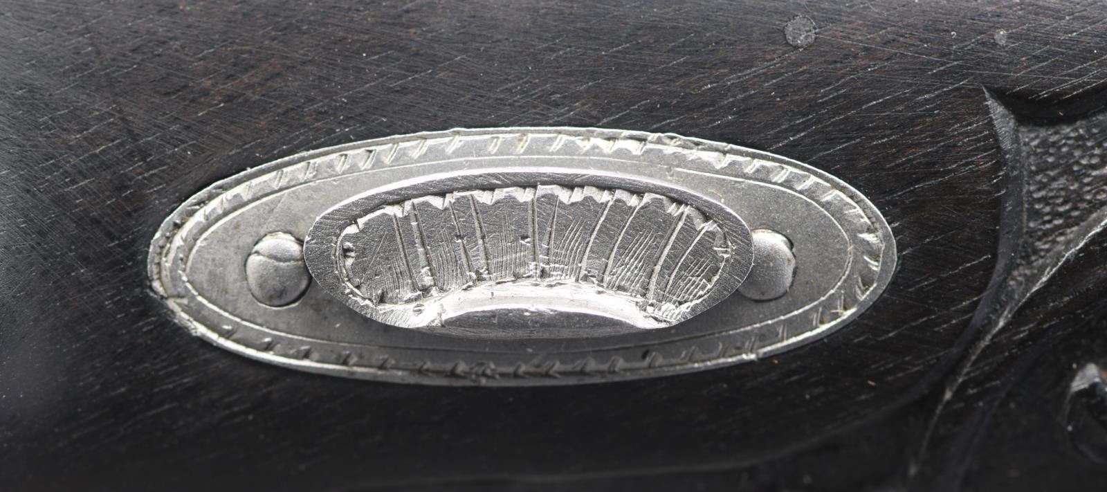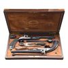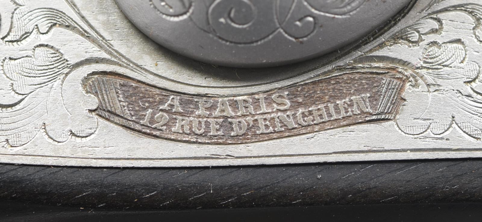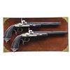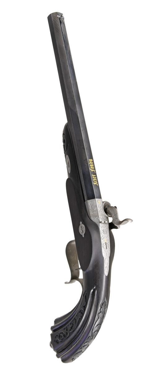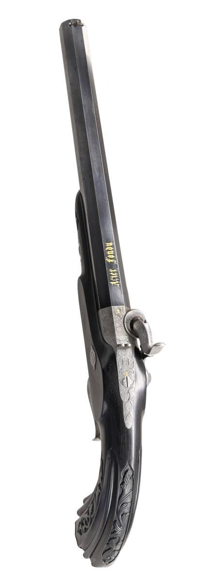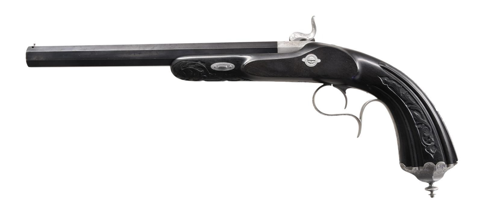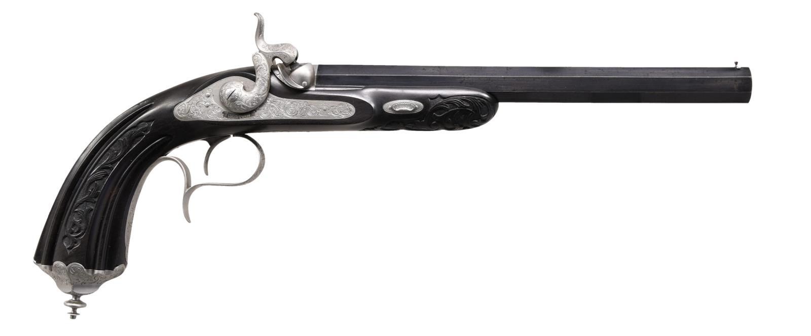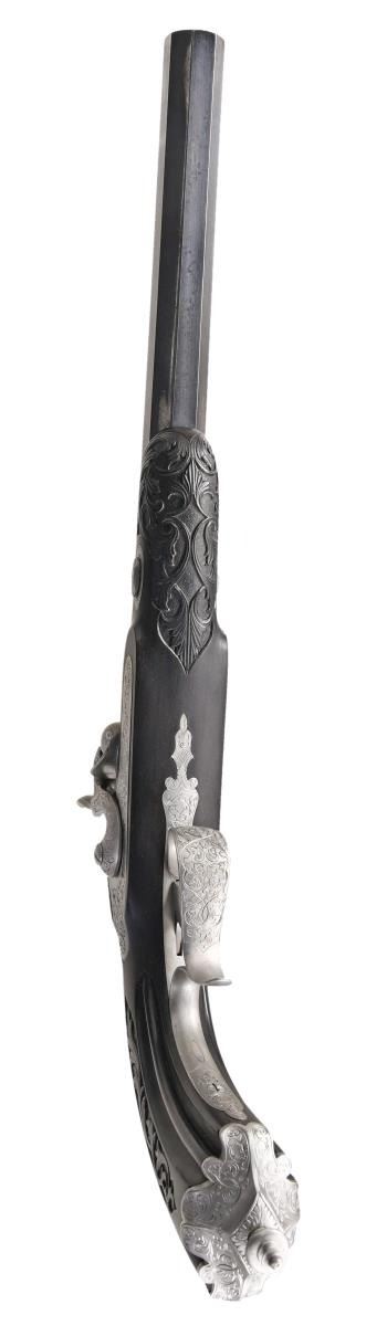 Cal. 50. NSN. Bbls. 10" octagon. Bead front sights & fixed V notch rear sights. Top flats are gold marked "Acier Fondu". Breech end of bbls. & top tangs are marked in gold "1" or "2". Island locks. Locks, hammers, breech plug, top tangs, ornate butt caps & fancy finial trigger guards have generous coverage of vine type foliate scroll hand engraving. Bbls. have finely polished blue finish. Other metal parts have French Gray finish. Wedge fastened ebony stocks w/ deeply fluted grip sections. Flats of grip section & forearm tips have deep relief foliate carving. Overall length is 15 1/2". WEIGHT: 2 lbs, 3 oz. UNATTACHED ACCESSORIES: original wood casing w/ brass trim. Inside lid is marked "FABRIQUE de LEPAGE Feres. / LIEGE miason a Paris / 12, RUE D'ENGHIEN". Red cloth cover fitted interior. Ebony accessories include cleaning rod, ramrod, mallet, rd ball box & ebony handled nipple wrench. Also included is 2 cavity bullet mold, powder flask, cap tin, glass oil bottle & retailer tag. Case interior has largely faded from red to beige. CONDITION: both pistols retain over 90% bbl. blue showing light edge wear w/ scattered spots of freckling. Other metal parts retain a very good French Gray finish. Ebony stocks are in near excellent condition. Sound locks. Bores retain strong rifling showing a slightly frosted appearance. PROVENANCE: The Collection of Edward Scott Meadows. (01-24709/DS). ANTIQUE. $5,000-8,000.
