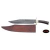 Overall length: 17.25". Damascus 11.75" blade with clip point, false edge & sculpted spine. German silver overall double hilt, bolster & pommel. Sculpted rosewood handle. Dark brown leather sheath with "Lewis Drake" stamped on left side & logo on right. CODITION: Near excellent blade having vivid patterns. Good German silver appearance showing tarnish & verdigris on leather contact points. Handle has 2" crack extending from pommel; balance very good. Near excellent sheath with mildew on hilt contact point. PROVENANCE: from the renowned collection of quality sporting arms from Lewis Drake together with inventory of Lewis Drake Associates. (02-23552/MD). $250-500.