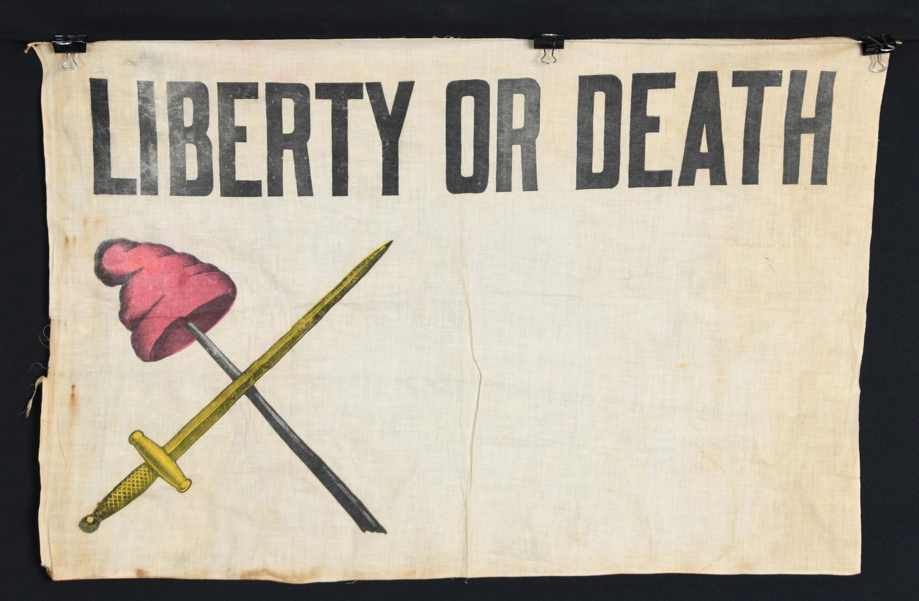 This very interesting flag is printed on white cotton and measures approx. 35" x 23 1/2". It appears to date to the late 19th to the early 20th century. It is a style of flag known to have been used at the Battle of White Plains, NY, and was captured from a New York militia unit by Hessians on 28 October 1776. The top of the flag has black 4 3/4" letters that read "LIBERTY OR DEATH". The lower left quadrant of the flag has a yellow-colored sword crossed with a broken pike having a red liberty cap perched upon it. A very interesting piece worthy of further research. UNATTACHED ACCESSORIES: an envelope that the flag was stored in for many years. CONDITION: Cotton is a bit discolored and shows some very minor water damage. The hoist end has a few tears and tiny losses at the corners. (02-23640/BF). $500-1,500.