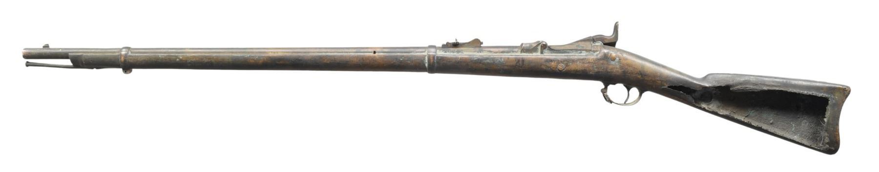 SINGLE SHOT BREECHLOADING RIFLE. Life size casting of a Springfield Trapdoor single shot breechloading rifle measuring approx. 51 1/4" in length. Left side of bbl. exhibits a screw hole from prior mounting. Left side of buttstock exhibits a 10 1/4" by 2 3/4" hole. CONDITION: bronze exhibits a mottled brown patina, with scattered spots of verdigris overall. (02-23251/MLW). $300-500.