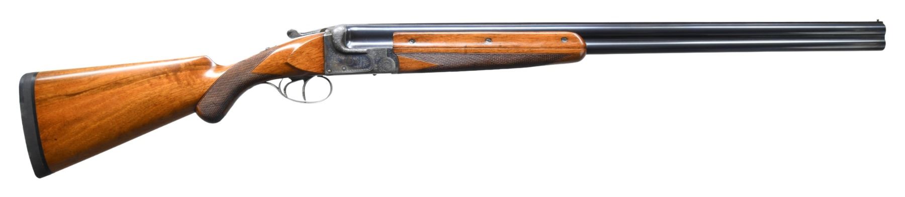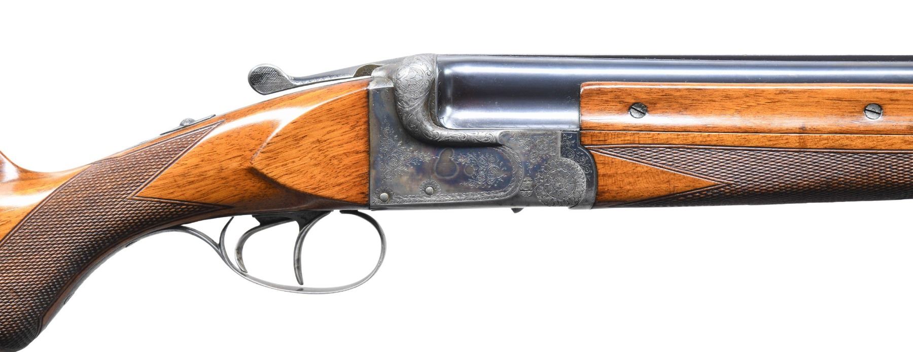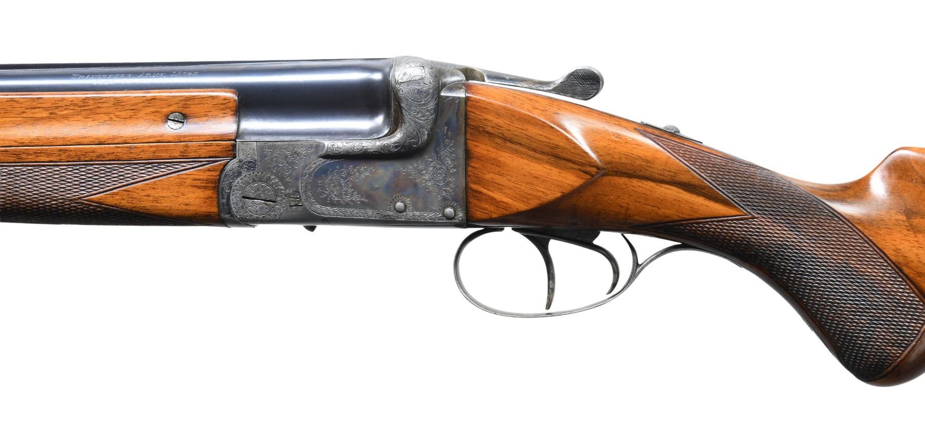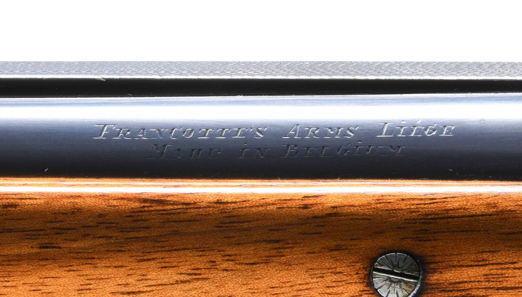 EJECTOR GAME GUN. Cal. 20 Ga. 2-3/4". S# 22182 (1948). The 26-1/4" demi-block O/U barrels with narrow matted solid rib are engraved "Francotte's Arms Leige" "Made in Belgium" on top barrel to the left of rib. Bottom barrel is stamped with 1948 Belgian nitro proofs for 2-3/4" chambers. Crowned "AF" mark is on bottom of barrel along with S#. Case hardened boxlock action with squared double Kirsten bolt and double under lugs features automatic safety ("S" in gold), reinforced action and double triggers. Action is engraved with about 50% coverage simple scroll with line and feather borders. Fences are engraved with acanthus. Floorplate is engraved "Made in Belgium". Steel trigger guard has S# on tang. Round knob pistol grip buttstock made of lightly streaked and figured European walnut measures 14-5/8" over black Decelerator pad. Point pattern checkering is at grip. Three piece ejector forend has Deeley release. MEASUREMENTS: BBLS: Bore Diameter: O .641. U .636. Restriction: O .028 (full). U .018 (mod). Wall thickness: O .023. U .028. STOCK: DAH: 2-3/16". DAC: 1-7/16". CAST: neutral. LOP: 14-5/8". WEIGHT: 6 lb. 4 oz. CONDITION: very fine. Barrels retaining over 90% original blue; show high edge wear. Action retains over 80% original case hardening color; silvering around bottom and on fences. Most original blue remains on top lever and trigger guard. Thumb piece silvered and trigger guard tang is completely silvered to gray. Stocks retain nearly all their original finish with some light marks; perhaps with some added oil. Bores are bright and shiny. Action is tight. Mechanically fine. (25-4449/MGM). CURIO. $2,000-3,000.