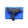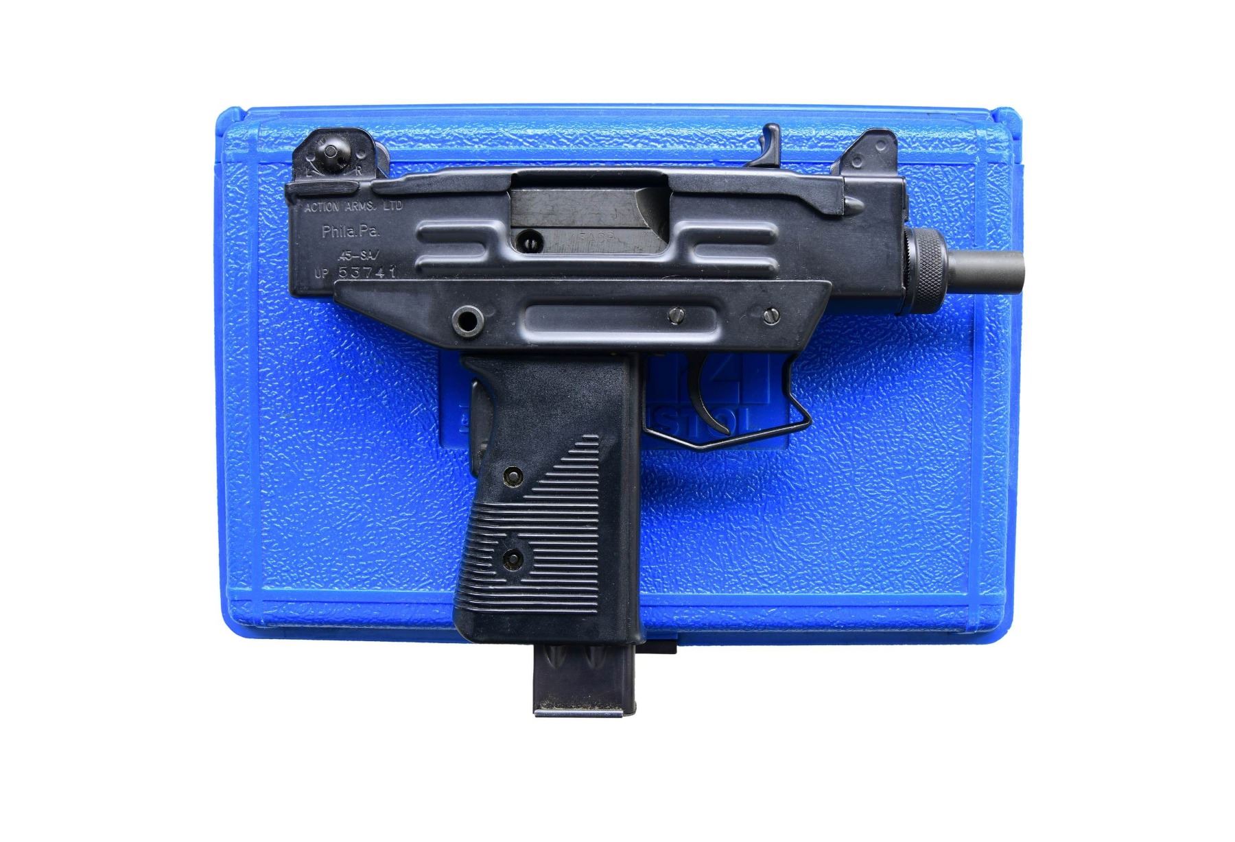 Cal. 45 ACP. S# UP53741. Bbl. 4 1/2". Action Arms Ltd./IMI UZI pistol. Semi automatic variant of the exotic micro UZI SMG. 3 Dot sight system. Elevation adj. protected post front sight. Windage adj. rear sight. Slotted, non reciprocating top mounted charging handle. Classic black painted finish on most exposed metal parts. F-S trigger group. Black plastic furniture. MAGS: 1 factory 10 rd. UNATTACHED ACCESSORIES: Action Arms blue plastic transport case & sight adj. tool. CONDITION: All aspects indicate very little use, if any. Finish on all exposed parts is unblemished. Bore is shiny w/ strong rifling. Fire control mechanism appears to function properly when cycled by hand. PROVENANCE: Lifelong Collection of Terrence McCarty. (24-585/JZ). MODERN. $700-1,000.